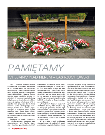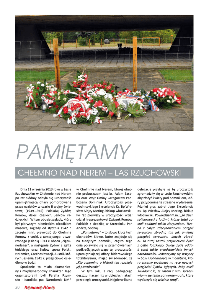 PAMIĘTAMY CHEŁMNO NAD NEREM – LAS RZUCHOWSKI Dnia 11 września 2013 roku w Lesie Rzuchowskim w Chełmnie nad Nerem po raz siódmy odbyła się uroczystość upamiętniającą ofiary pomordowane przez nazistów w czasie II wojny światowej (1939-1945): Polaków, Żydów, Romów, dzieci czeskich, jeńców radzieckich. W tym obozie zagłady, który był pierwszym niemieckim ośrodkiem masowej zagłady od stycznia 1942 r. zaczęto m.in. przywozić do Chełmna Romów z Łodzi, z tamtejszego, utworzonego jesienią 1941 r. obozu „Zigeunerlager”, a następnie Żydów z getta łódzkiego oraz Żydów spoza Polski, z Niemiec, Czechosłowacji, Austrii, których jesienią 1941 r. przejściowo osiedlono w Łodzi. Spotkanie to miało ekumeniczny i międzynarodowy charakter. Jego organizatorami byli Parafia Rzymsko - Katolicka pw. Narodzenia NMP 20 w Chełmnie nad Nerem, której obecnie proboszczem jest ks. Adam Zasada oraz Wójt Gminy Grzegorzew Pani Bożena Dominiak. Uroczystości przewodniczył Jego Ekscelencja Ks. Bp Wiesław Alojzy Mering, biskup włocławski. Po raz pierwszy w uroczystości wziął udział i reprezentował Związek Romów Polskich z siedzibą w Szczecinku Pan Andrzej Sochaj. „Pamiętamy” – to słowo klucz tych obchodów. Słowo, które znajduje się na tutejszym pomniku, często tego dnia pojawiało się w przemówieniach podkreślających wagę tej uroczystości upamiętniającej ofiary hitlerowskiego totalitaryzmu, mając świadomość, że „Kto zapomina o historii ten ryzykuje jej powtórzenie”. W tym roku z racji padającego deszczu inaczej niż w ubiegłych latach przebiegła uroczystość. Najpierw liczne delegacje przybyłe na tę uroczystość zgromadziły się w Lesie Rzuchowskim, aby złożyć kwiaty pod pomnikiem, który przypomina te straszne wydarzenia. Później głos zabrał Jego Ekscelencja Ks. Bp Wiesław Alojzy Mering, biskup włocławski. Powiedział m.in.: „To dzień solidarności z ludźmi, którzy tutaj zostali poddani takim cierpieniom. Trzeba z całym zdecydowaniem potępić sprawców zbrodni, tak jak umiemy potępiać sprawców innych zbrodni. To tutaj zostali przywiezieni Żydzi z getta łódzkiego. Swoje życie oddali tutaj także przedstawiciele innych narodowości. Jednoczymy się wszyscy w bólu i solidarności, w modlitwie, którą chcemy przekazać na ręce naszych przyjaciół Żydów żyjących, żeby mieli świadomość, że razem z nimi sprzeciwiamy się temu potwornemu złu, które wydarzyło się właśnie tutaj”. O losie pomordowanych Romów oraz wielkiej potrzebie oraz roli edukowania ludzi, a szczególnie dzieci i młodzieży na temat holokaustu i w zakresie tolerancji i człowieczeństwa, przypomniała w swoim przemówieniu Pani Izabela Ewa Kwiatkowska – Konsul Honorowy Republiki Austrii w Poznaniu. Natomiast Pani Bożena Dominiak Wójt Gminy Grzegorzew wskazała w swoim wystąpieniu, że jest „To miejsce będące jednym z symboli dramatu, jaki przeżyły narody, które musiały zmierzyć się z falą nienawiści, jaką był nazizm”. Przypomniała, że „Nie chodzi o to, by rozpamiętywać o okropieństwa tamtych czasów, ale by nie zapomnieć o tych, którzy tu spoczywają – a ich śmierć uchybiała godności człowieka”. Ponadto Pani Wójt podkreśliła, iż „mimo że okoliczności spotkania są smutne nasza obecność dzisiaj – to wyraz naszej pamięci, to właśnie dowód na to, że PAMIĘTAMY!” Potem członkowie Polskiej Rady Chrześcijan i Żydów odmówili Psalm 27 – rozpoczynający się od słów „Pan moim światłem i zbawieniem moim”, a na koniec tej części uroczystości Ks. Biskup odmówił modlitwę, jaką 11.06.1999 r. odmówił na Umschlagplatzu bł. Jan Paweł II (1978-2005). Kończy się ona następująco: „Uczyń, by dzięki jego świadectwu cały rodzaj ludzki pojął, że wszystkie narody jeden mają początek i jeden cel ostateczny Boga, którego zbawcze zamiary rozciągają się na wszystkich ludzi. Amen.” Później udaliśmy się do Kościoła pw. Narodzenia NMP w Chełmnie nad Ne- rem, gdzie została odprawiona uroczysta Msza święta pod przewodnictwem Księdza Biskupa Wiesława Alojzego Meringa, Ordynariusza Diecezji Włocławskiej w intencji Pomordowanych w Obozie ofiar II wojny światowej. Homilię wygłosił Ks. Prof. Tomasz Kaczmarek. Zauważył w niej na przykład to, że przyszliśmy tutaj jako ludzie z różnych środowisk, pamiętamy i troszczymy się o to, aby nie zapomnieć i przestrzegać przed tym, co złe, aby przypadkiem coś gorszego zdarzyć się nie mogło. Przytaczając fragment z Księgi Rodzaju, o wołającej krwi brata swego - sprawiedliwego Abla, podkreślił, ileż to krwi tutaj głośno woła z ziemi do nieba, do Boga i jeśli nie my o tym będziemy mówić, świadczyć, przestrzegać, to „kamienie wołać będą”. Następnie po Mszy świętej w pobliskiej świetlicy, przy wspólnym stole, w serdecznej atmosferze przebiegała dalsza uroczystość. Podczas niej ustalono datę kolejnego już ósmego spo- tkania, które planowane jest na dzień 04.09.2014 roku. Mam nadzieję, ze za rok liczniejsza grupa Romów i Sinti przybędzie i weźmie czynny udział w obchodach w Chełmnie nad Nerem oraz w Lesie Rzuchowskim, aby upamiętnić Romów oraz wszystkich tych, którzy tam zostali bestialsko zamordowani w czasie II wojny światowej. Szczególnie podziękowane należy się organizatorom, zarówno władzom duchownym i państwowym, samorządowym za pomysł, trud i przygotowanie oraz za sprawny przebieg tej uroczystości. Do zobaczenia za rok. Andrzej Sochaj Fot. Gmina Grzegorzew Dre dyves 11 wrześnio da berś dre Veś Rzuchowsko dre Chełmno nad Nerem już eftato moło isys kerde uroczystości pał rypyryben zamarden adoj pełde Sasendyr dre dujto svetytko maryben - Polaken, Żyden, Romen, Czechen i Heładytkunen. Dre dova obozo merybnytko Sasy jandenys i zamarenys Romen gettostyr dre Łódź. Da bibahtało Romenge veś isys pełde berśa zabi