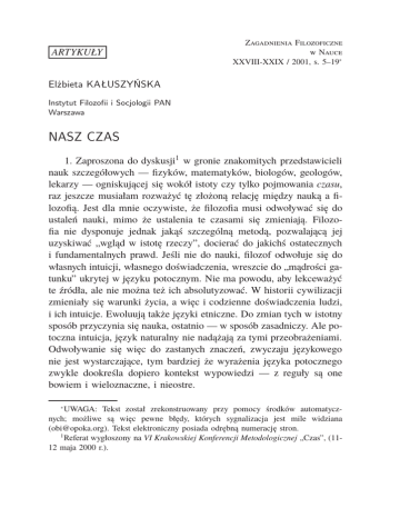ARTYKUŁY Zagadnienia Filozoficzne w Nauce XXVIII-XXIX / 2001, s. 5–19∗ Elżbieta KAŁUSZYŃSKA Instytut Filozofii i Socjologii PAN Warszawa NASZ CZAS 1. Zaproszona do dyskusji1 w gronie znakomitych przedstawicieli nauk szczegółowych — fizyków, matematyków, biologów, geologów, lekarzy — ogniskującej się wokół istoty czy tylko pojmowania czasu, raz jeszcze musiałam rozważyć tę złożoną relację między nauką a filozofią. Jest dla mnie oczywiste, że filozofia musi odwoływać się do ustaleń nauki, mimo że ustalenia te czasami się zmieniają. Filozofia nie dysponuje jednak jakąś szczególną metodą, pozwalającą jej uzyskiwać „wgląd w istotę rzeczy”, docierać do jakichś ostatecznych i fundamentalnych prawd. Jeśli nie do nauki, filozof odwołuje się do własnych intuicji, własnego doświadczenia, wreszcie do „mądrości gatunku” ukrytej w języku potocznym. Nie ma powodu, aby lekceważyć te źródła, ale nie można też ich absolutyzować. W historii cywilizacji zmieniały się warunki życia, a więc i codzienne doświadczenia ludzi, i ich intuicje. Ewoluują także języki etniczne. Do zmian tych w istotny sposób przyczynia się nauka, ostatnio — w sposób zasadniczy. Ale potoczna intuicja, język naturalny nie nadążają za tymi przeobrażeniami. Odwoływanie się więc do zastanych znaczeń, zwyczaju językowego nie jest wystarczające, tym bardziej że wyrażenia języka potocznego zwykle dookreśla dopiero kontekst wypowiedzi — z reguły są one bowiem i wieloznaczne, i nieostre. UWAGA: Tekst został zrekonstruowany przy pomocy środków automatycznych; możliwe są więc pewne błędy, których sygnalizacja jest mile widziana ([email protected]). Tekst elektroniczny posiada odrębną numerację stron. 1 Referat wygłoszony na VI Krakowskiej Konferencji Metodologicznej „Czas”, (1112 maja 2000 r.). ∗ 2 Elżbieta KAŁUSZYŃSKA Chcąc więc sprostać wyzwaniom swego czasu, filozofia musi brać pod uwagę rozstrzygnięcia nauki i być gotowa na modyfikacje, gdy ustalenia te w zasadniczy sposób się zmienią. Wynika stąd, że od filozofii nie można oczekiwać „ostatecznych” odpowiedzi na „fundamentalne” pytania — każdy czas ma swe własne problemy i nawet gdy stawiane pytania brzmią podobnie, sygnalizowane przez nie problemy są inne, przekładają się bowiem na inne doświadczenie, inną wiedzę, inny dorobek naukowców, ale też i filozofów. Filozofię, na przykład, „od zawsze” interesowała natura ludzka. Gorzka lekcja Holocaustu niewątpliwie wzbogaca naszą o niej wiedzę; to „człowiek człowiekowi zgotował ten los”. Koszmarne doświadczenia dwudziestowiecznych totalitaryzmów muszą odtąd być brane pod uwagę, przy wszelkich próbach uchwycenia istoty człowieczeństwa. Nie tylko zresztą one. Zdziczenie kibiców piłkarskich, nasilanie się skrajnych nacjonalizmów, szowinizmów prowadzących do krwawych lokalnych wojen wskazują na silną potrzebę identyfikacji poprzez przynależność do jakiejś społeczności. To także rys natury ludzkiej, dramatycznie dochodzący do głosu w obszarze świata, gdzie idee liberalizmu, społecznego „atomizmu” wydają się najlepiej ugruntowane. Podobnie w innych obszarach filozofii. Nawet bezsporny, tautologiczny — jak można by sądzić — Parmenidesowy punkt wyjścia, stwierdzenie, że byt jest, a niebytu nie ma, nie może być bez zastrzeżeń akceptowany w świetle ustaleń fizyki dotyczących próżni, zgodnie z którymi kipi ona nieustannie pojawiającymi się i ginącymi cząstkami wirtualnymi. Dzięki nim próżnia — pozbawiona cząstek materialnych — oddziałuje z materią. Nie tak łatwo rozstrzygnąć, czy, a jeśli tak, to w jaki sposób, istnieją cząstki wirtualne. Jeśli natomiast zaksięgujemy je po stronie niebytu, musimy pogodzić się z konsekwencją, że niebyt może wpływać na realną rzeczywistość. Nie ma gotowych odpowiedzi. Filozofia jest zobowiązana do podejmowania — wciąż od nowa — rzetelnej próby zrozumienia, połączenia z różnych źródeł pochodzącej wiedzy w możliwie spójny obraz przyrody, w której jest również miejsce dla człowieka z jego instytu- NASZ CZAS 3 cjami społecznymi i systemami wartości. Tego można i trzeba od niej oczekiwać. 2. Wspomniane wyżej „wady” języka naturalnego, są w istocie często niedostatkami naszych intuicji. Pojęcia dobrze funkcjonujące w tysięcznych sytuacjach dają się niekiedy zastosować w paradoksalnych konstrukcjach, ujawniając tym samym, że nie są wystarczająco precyzyjnie określone. Niekiedy nie wydaje się to groźne. Chociaż zebrałaby się zapewne pokaźna biblioteka z dzieł poświęconych paradoksom kłamcy czy Getiera, to nie mają one znaczenia, gdy w grę wchodzi sposób rozumienia pojęć prawdy czy wiedzy. Rzecz dotyczy raczej sposobów posługiwania się odpowiednimi wyrażeniami tak, aby do paradoksalnych sytuacji nie dochodziło. Ma to niewątpliwie znaczenie, zwłaszcza przy konstruowaniu programów w badaniach nad sztuczną inteligencją. Niekiedy jednak paradoksy wskazują na zasadnicze trudności pojęciowego ujęcia rzeczywistości. Słynne Augustyniańskie „wiem, póki nie pytasz” może być równie dobrze odpowiedzią na pytanie o to, czym jest czas, jak i na szereg podobnych pytań dotyczących pojęć, którymi posługujemy się w wielu sytuacjach — w potocznym doświadczeniu i w nauce — w jednoznaczny i precyzyjny sposób, a których zadawalającej definicji nie potrafimy sformułować. Zdaje się to świadczyć o tym, że choć w tych konkretnych sytuacjach udaje nam się uchwycić pewien aspekt interesującego nas zjawiska, jakiś rys rzeczywistości, to jednak ciągle coś istotnego umyka naszej uwadze lub wręcz wykracza poza nasze możliwości poznawcze. Paradoksalne właściwości czasu mają taki właśnie charakter. Jak wiadomo, rozmaicie rozwiązywana była już sama kwestia ontycznej natury cza