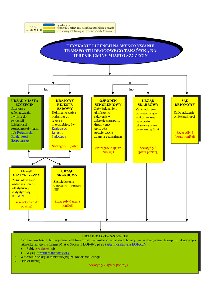 UZYSKANIE LICENCJI NA WYKONYWANIE TRANSPORTU DROGOWEGO TAKSÓWKĄ NA TERENIE GMINY MIASTO SZCZECIN lub URZĄD MIASTA SZCZECIN Uzyskanie zaświadczenia o wpisie do ewidencji działalności gospodarczej– patrz tryb Rejestracja Działalności Gospodarczej URZĄD STATYSTYCZNY Zaświadczenie o nadaniu numeru identyfikacji statystycznej REGON Szczegóły 5 (patrz poniżej) 1. 2. 3. lub KRAJOWY REJESTR SĄDOWY Dokonanie wpisu podmiotu do rejestru przedsiębiorców Krajowego Rejestru Sądowego OŚRODEK SZKOLENIOWY Zaświadczenie o ukończeniu szkolenia w zakresie transportu drogowego taksówką potwierdzone zdanym egzaminem URZĄD SKARBOWY Zaświadczenie potwierdzające wykonywanie transportu taksówką przez co najmniej 5 lat Szczegóły 1 (patrz poniżej) Szczegóły 2 (patrz poniżej) Szczegóły 3 (patrz poniżej) SĄD REJONOWY Zaświadczenie o niekaralności Szczegóły 4 (patrz poniżej) URZĄD SKARBOWY Zaświadczenie o nadaniu numeru NIP Szczegóły 6 (patrz poniżej) URZĄD MIASTA SZCZECIN Złożenie osobiście lub wysłanie elektronicznie „Wniosku o udzielenie licencji na wykonywanie transportu drogowego taksówką na terenie Gminy Miasto Szczecin BOI-46”, patrz karta informacyjna BOI-XCV Pobierz wniosek lub Wyślij formularz interaktywny Wniesienie opłaty administracyjnej za udzielenie licencji. Odbiór licencji. Szczegóły 7 (patrz poniżej) Szczegóły 1 Krajowy Rejestr Sądowy w Szczecinie: Sąd Rejonowy XVII Wydział Gospodarczy KRS Ul. Królowej Korony Polskiej 31 70-485 Szczecin Tel.: 0-91/422 49 99 Lista Wydziałów Gospodarczych Krajowego Rejestru Sądowego zawierająca adresy, numery telefonów oraz wykaz właściwości dla każdego wydziału znajduje się pod adresem: www.ms.gov.pl/krs/krs_oplaty.php#adresy_krs Szczegóły 2 Uwaga! Krok ten dotyczy osób rozpoczynających działalność oraz przedsiębiorców wykonujących transport krócej niż 5 lat lub u których przerwa w wykonywaniu transportu była dłuższa niż 6 kolejnych miesięcy. Ośrodki organizujące szkolenia w zakresie transportu drogowego taksówką: Wojewódzki Zakład Doskonalenia Zawodowego Szczecin, Pl. Kilińskiego 3, pok. 201, tel.: 091/450-17-01 TRANSLOG spółka z o.o. Szczecin, Al. Wojska Polskiego 217 AB, tel.: 091/435-81-62 Po ukończeniu szkolenia należy zdać egzamin przed komisją egzaminacyjną powołaną przez Prezydenta Miasta Szczecin (koszt szkolenia do 800,00 zł, koszt egzaminu 200,00 zł) Szczegóły 3 Uwaga! Krok ten dotyczy przedsiębiorców, którzy mają co najmniej 5 lat praktyki w zakresie wykonywania tego transportu, przy czym przerwa w wykonywaniu transportu drogowego nie może być dłuższa niż 6 kolejnych miesięcy z przyczyn zależnych od przedsiębiorcy. Po zaświadczenie potwierdzające wykonywanie transportu należy udać się do Urzędu Skarbowego. Szczegóły 4 Zaświadczenie o niekaralności można uzyskać w Sądzie Okręgowym w Szczecinie ul. Kaszubska 42, parter, pokój 91. Opłata za zaświadczenie 50 zł w znakach opłaty sądowej (znaki dostępne na miejscu). Szczegóły 5 Sprawy związane z numerem REGON można załatwić również na miejscu w Urzędzie Miasta w pokoju 18. Szczegóły 6 Należy uzyskać kopię decyzji o nadaniu numeru identyfikacji podatkowej NIP-4 lub VAT-5/B lub kopię wniosku o potwierdzenie nadania numeru identyfikacji podatkowej NIP-5 wypełnionego w pkt.F. Szczegóły 7 Do wniosku obok wyżej wymienionych dokumentów należy załączyć: oświadczenie o kierowcach – druk BOI-47 kserokopię krajowego dokumentu dopuszczającego do ruchu pojazd, którym transport ma być wykonywany (dowód rejestracyjny lub pozwolenie czasowe), dokument powinien zawierać wpis świadczący o dokonanym przeglądzie i adnotację, że pojazd jest przystosowany do przewozu osób taksówką „TAXI”. W przypadku, gdy przedsiębiorca nie jest właścicielem tego pojazdu – również dokument potwierdzający prawo do dysponowania nim. Do wglądu: Oryginały kserokopii załączonych dokumentów. Wniosek wraz z załącznikami składa się w Kancelarii Biura Obsługi Interesantów w sali 62. BOI czynne jest: poniedziałek - piątek 7.30-16.00. O udzieleniu licencji przedsiębiorca zostaje powiadomiony telefonicznie lub pisemnie. Przed odbiorem licencji należy uiścić opłatę administracyjną gotówką w kasie lub przelewem na konto: BANK PEKAO S.A. II ODDZ. SZCZECIN NR 34124039271111001015886191 Wysokość opłaty administracyjnej za udzielenie licencji: od 2 do 15 lat – 200 zł, powyżej 15 do 30 lat – 250 zł powyżej 30 do 50 lat – 300 zł.