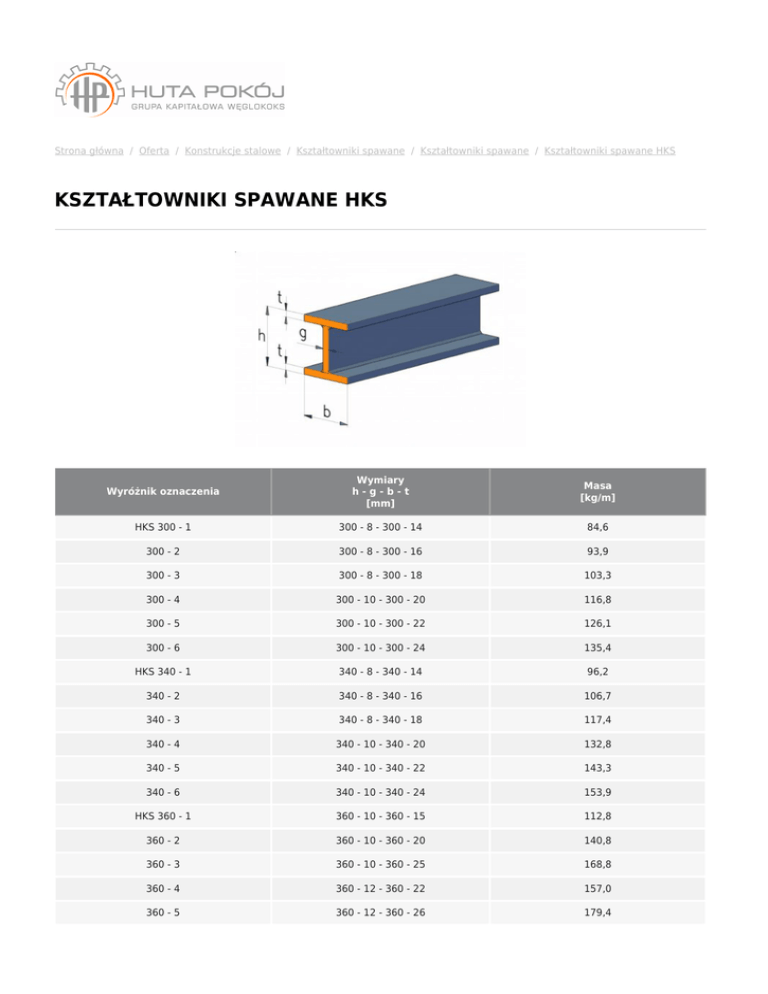 Strona główna / Oferta / Konstrukcje stalowe / Kształtowniki spawane / Kształtowniki spawane / Kształtowniki spawane HKS KSZTAŁTOWNIKI SPAWANE HKS Wyróżnik oznaczenia Wymiary h-g-b-t [mm] Masa [kg/m] HKS 300 - 1 300 - 8 - 300 - 14 84,6 300 - 2 300 - 8 - 300 - 16 93,9 300 - 3 300 - 8 - 300 - 18 103,3 300 - 4 300 - 10 - 300 - 20 116,8 300 - 5 300 - 10 - 300 - 22 126,1 300 - 6 300 - 10 - 300 - 24 135,4 HKS 340 - 1 340 - 8 - 340 - 14 96,2 340 - 2 340 - 8 - 340 - 16 106,7 340 - 3 340 - 8 - 340 - 18 117,4 340 - 4 340 - 10 - 340 - 20 132,8 340 - 5 340 - 10 - 340 - 22 143,3 340 - 6 340 - 10 - 340 - 24 153,9 HKS 360 - 1 360 - 10 - 360 - 15 112,8 360 - 2 360 - 10 - 360 - 20 140,8 360 - 3 360 - 10 - 360 - 25 168,8 360 - 4 360 - 12 - 360 - 22 157,0 360 - 5 360 - 12 - 360 - 26 179,4 Wyróżnik oznaczenia Wymiary h-g-b-t [mm] Masa [kg/m] 360 - 6 360 - 12 - 360 - 28 190,5 HKS 400 - 1 400 - 10 - 400 - 15 125,6 400 - 2 400 - 10 - 400 - 20 156,8 400 - 3 400 - 10 - 400 - 25 188,0 400 - 4 400 - 12 - 400 - 22 175,0 400 - 5 400 - 12 - 400 - 26 199,8 400 - 6 400 - 12 - 400 - 28 212,2 HKS 450 - 1 450 - 10 -450 - 15 141,6 450 - 2 450 - 10 - 450 - 20 176,8 450 - 3 450 - 10 - 450 - 25 212,0 450 - 4 450 - 12 - 450 - 24 211,4 450 - 5 450 - 12 -450 - 30 253,4 HKS 500 - 1 500 - 10 - 500 - 15 157,6 500 - 2 500 - 10 - 500 - 20 196,8 500 - 3 500 - 10 - 500 - 25 236,0 500 - 4 500 - 12 - 500 - 24 235,4 500 - 5 500 - 12 - 500 - 30 282,2 HKS 550 - 1 550 - 10 - 550 - 15 173,6 550 - 2 550 - 10 - 550 - 20 216,8 550 - 3 550 - 10 - 550 - 25 260,0 550 - 4 550 - 12 - 550 - 24 259,3 550 - 5 550 - 12 - 550 - 30 311,0 NA ŻYCZENIE KLIENTA MOŻLIWOŚĆ WYKONANIA O WYMIARACH WYKRACZAJĄCYCH POZA PODANY ZAKRES.