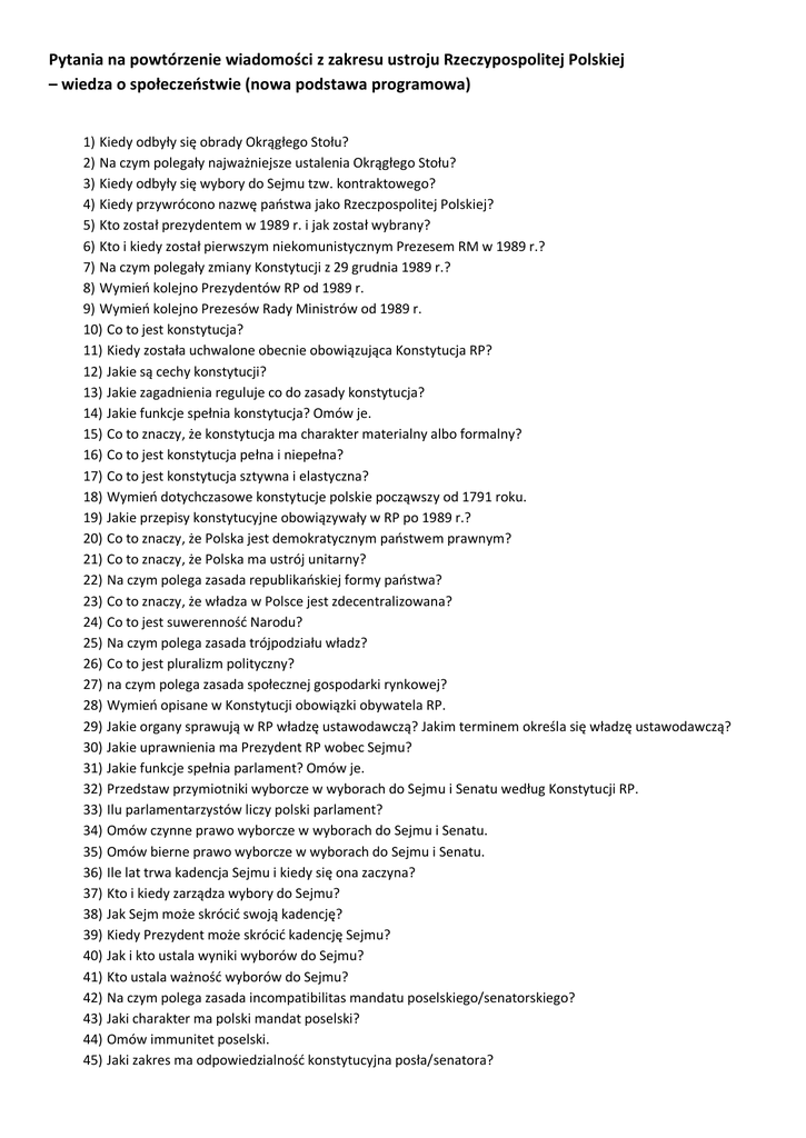 Pytania na powtórzenie wiadomości z zakresu ustroju Rzeczypospolitej Polskiej – wiedza o społeczeństwie (nowa podstawa programowa) 1) Kiedy odbyły się obrady Okrągłego Stołu? 2) Na czym polegały najważniejsze ustalenia Okrągłego Stołu? 3) Kiedy odbyły się wybory do Sejmu tzw. kontraktowego? 4) Kiedy przywrócono nazwę państwa jako Rzeczpospolitej Polskiej? 5) Kto został prezydentem w 1989 r. i jak został wybrany? 6) Kto i kiedy został pierwszym niekomunistycznym Prezesem RM w 1989 r.? 7) Na czym polegały zmiany Konstytucji z 29 grudnia 1989 r.? 8) Wymień kolejno Prezydentów RP od 1989 r. 9) Wymień kolejno Prezesów Rady Ministrów od 1989 r. 10) Co to jest konstytucja? 11) Kiedy została uchwalone obecnie obowiązująca Konstytucja RP? 12) Jakie są cechy konstytucji? 13) Jakie zagadnienia reguluje co do zasady konstytucja? 14) Jakie funkcje spełnia konstytucja? Omów je. 15) Co to znaczy, że konstytucja ma charakter materialny albo formalny? 16) Co to jest konstytucja pełna i niepełna? 17) Co to jest konstytucja sztywna i elastyczna? 18) Wymień dotychczasowe konstytucje polskie począwszy od 1791 roku. 19) Jakie przepisy konstytucyjne obowiązywały w RP po 1989 r.? 20) Co to znaczy, że Polska jest demokratycznym państwem prawnym? 21) Co to znaczy, że Polska ma ustrój unitarny? 22) Na czym polega zasada republikańskiej formy państwa? 23) Co to znaczy, że władza w Polsce jest zdecentralizowana? 24) Co to jest suwerenność Narodu? 25) Na czym polega zasada trójpodziału władz? 26) Co to jest pluralizm polityczny? 27) na czym polega zasada społecznej gospodarki rynkowej? 28) Wymień opisane w Konstytucji obowiązki obywatela RP. 29) Jakie organy sprawują w RP władzę ustawodawczą? Jakim terminem określa się władzę ustawodawczą? 30) Jakie uprawnienia ma Prezydent RP wobec Sejmu? 31) Jakie funkcje spełnia parlament? Omów je. 32) Przedstaw przymiotniki wyborcze w wyborach do Sejmu i Senatu według Konstytucji RP. 33) Ilu parlamentarzystów liczy polski parlament? 34) Omów czynne prawo wyborcze w wyborach do Sejmu i Senatu. 35) Omów bierne prawo wyborcze w wyborach do Sejmu i Senatu. 36) Ile lat trwa kadencja Sejmu i kiedy się ona zaczyna? 37) Kto i kiedy zarządza wybory do Sejmu? 38) Jak Sejm może skrócić swoją kadencję? 39) Kiedy Prezydent może skrócić kadencję Sejmu? 40) Jak i kto ustala wyniki wyborów do Sejmu? 41) Kto ustala ważność wyborów do Sejmu? 42) Na czym polega zasada incompatibilitas mandatu poselskiego/senatorskiego? 43) Jaki charakter ma polski mandat poselski? 44) Omów immunitet poselski. 45) Jaki zakres ma odpowiedzialność konstytucyjna posła/senatora? 46) Na czym polega odpowiedzialność polityczna posła/senatora? 47) Jaki charakter mają obrady Sejmu – jawne/tajne; sesyjne czy nie? 48) Wymień organy Sejmu? 49) Omów kompetencje Marszałka Sejmu. 50) Omów skład i kompetencje: Prezydium Sejmu; Konwentu Seniorów; komisji sejmowe (rodzaje). 51) Jak się tworzy kluby lub koła poselskie? 52) Jakie organy państwowe są powoływane przez Sejm/Senat? 53) Na czym polega wotum zaufania? 54) Na czym polega wotum nieufności? 55) Na czym polegają interpelacje i zapytania poselskie? 56) Co to jest Zgromadzenie Narodowe? 57) Kiedy zbiera się Zgromadzenie Narodowe? 58) Jak decyduje się o stanie wojny? 59) Kto ma prawo inicjatywy ustawodawczej? 60) Przez ile czytań przechodzi projekt ustawy w Sejmie? 61) Do kiedy wnioskodawca może wycofać swój projekt? 62) Jaką większością głosuje się projekt ustawy w Sejmie? 63) Na czym polega rola Senatu w procesie ustawodawczym? 64) Jaką większością Sejm może odrzucić poprawki senackie w ustawie? 65) Jaka jest rola Prezydenta RP w procesie ustawodawczym? 66) Omów zagadnienie promulgacji i wejścia w życie ustawy/ 67) Jak nazywa się obecny Marszałek Sejmu? 68) Jak nazywa się obecny Marszałek Senatu? 69) Jakie organy składają się na władzę wykonawczą? Jakim terminem określa się władzę wykonawczą? 70) Na czym polega rola Prezydenta RP? 71) Omów przebieg wyborów prezydenckich w RP. 72) Kiedy organizuje się II turę wyborów prezydenckich? 73) Ile trwa kadencja Prezydenta RP i kiedy się ona zaczyna? 74) Kto stwierdza ważność wyborów prezydenckich i jaki skutek ma stwierdzenie ich nieważności? 75) Co dzieje się w razie zaistnienia przeszkód w sprawowaniu mandatu przez Prezydenta RP? 76) Kiedy Marszałek Sejmu przejmuje obowiązki Prezydenta RP i jak kształtują się wtedy jego kompetencje? 77) Na czym polega zasada incompatibilitas w zakresie urzędu Prezydenta RP? 78) Jakie kompetencje ma Prezydent RP w zakresie stosunków międzynarodowych? 79) Jakie kompetencje ma Prezydent RP w zakresie sił zbrojnych? 80) Jakie kompetencje ma Prezydent RP w zakresie stanu wojennego? 81) Jakie kompetencje ma Prezydent RP w zakresie stanu wyjątkowego? 82) Co to jest Rada Bezpieczeństwa Narodowego? 83) Kiedy Prezydent RP może wydawać rozporządzenia z mocą ustawy? 84) Co to jest Rada Gabinetowa i jakie są jej kompetencje? 85) Czym jest Kancelaria Prezydenta RP? 86) Co to są prerogatywne akty Prezydenta RP? 87) Co to są kontrasygnatywne akty Prezydenta RP? 88) Wymień prerogatywy Prezydenta RP w zakresie władzy ustawodawczej. 89) Wymień prerogatywy Prezydenta RP w zakresie władzy wykonawczej 90) Wymień prerogatywy Prezydenta RP związane z organami władzy państwowej niebędącymi legislatywą ani egzekutywą. 91) Jakie prerogatywy niedotyczące organów władzy ma Prezydent RP? 92) Jak kształtuje się odpowiedzialność konstytucyjna Prezydenta RP? 93) Wymień podmioty składające się na Radę Ministrów. 94) Wymień kompetencje Rady Ministrów. 95) Na czym polega domniemanie kompetencji Rady Ministrów? 96) Wymień kompetencje Prezesa Rady Ministrów. 97) Co to są działy administracji rządowej? Kto kieruje takim działem? 98) Kto jest przedstawiciel Rady Ministrów w województwie? Kto go powołuje? 99) Co to jest korpus s
