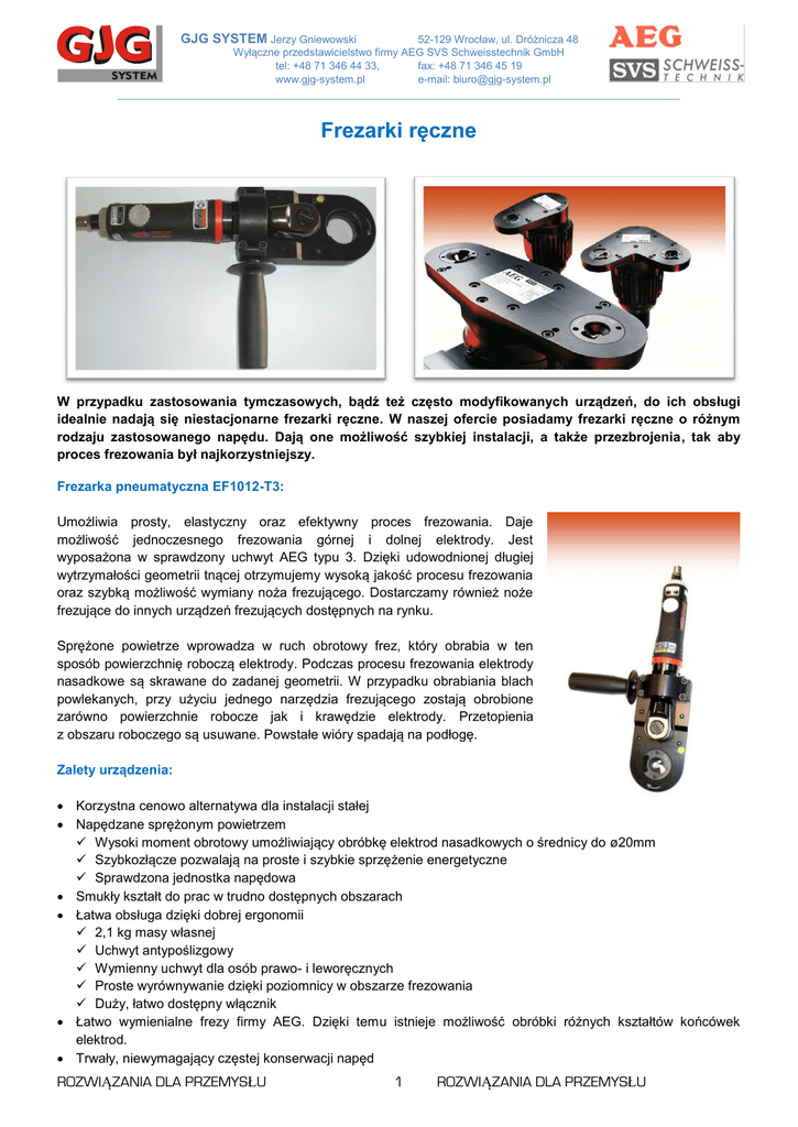 52-129 Wrocław, ul. Dróżnicza 48 Wyłączne przedstawicielstwo firmy AEG SVS Schweisstechnik GmbH tel: +48 71 346 44 33, fax: +48 71 346 45 19 www.gjg-system.pl e-mail: [email protected] GJG SYSTEM Jerzy Gniewowski Frezarki ręczne W przypadku zastosowania tymczasowych, bądź też często modyfikowanych urządzeń, do ich obsługi idealnie nadają się niestacjonarne frezarki ręczne. W naszej ofercie posiadamy frezarki ręczne o różnym rodzaju zastosowanego napędu. Dają one możliwość szybkiej instalacji, a także przezbrojenia, tak aby proces frezowania był najkorzystniejszy. Frezarka pneumatyczna EF1012-T3: Umożliwia prosty, elastyczny oraz efektywny proces frezowania. Daje możliwość jednoczesnego frezowania górnej i dolnej elektrody. Jest wyposażona w sprawdzony uchwyt AEG typu 3. Dzięki udowodnionej długiej wytrzymałości geometrii tnącej otrzymujemy wysoką jakość procesu frezowania oraz szybką możliwość wymiany noża frezującego. Dostarczamy również noże frezujące do innych urządzeń frezujących dostępnych na rynku. Sprężone powietrze wprowadza w ruch obrotowy frez, który obrabia w ten sposób powierzchnię roboczą elektrody. Podczas procesu frezowania elektrody nasadkowe są skrawane do zadanej geometrii. W przypadku obrabiania blach powlekanych, przy użyciu jednego narzędzia frezującego zostają obrobione zarówno powierzchnie robocze jak i krawędzie elektrody. Przetopienia z obszaru roboczego są usuwane. Powstałe wióry spadają na podłogę. Zalety urządzenia: Korzystna cenowo alternatywa dla instalacji stałej Napędzane sprężonym powietrzem Wysoki moment obrotowy umożliwiający obróbkę elektrod nasadkowych o średnicy do ø20mm Szybkozłącze pozwalają na proste i szybkie sprzężenie energetyczne Sprawdzona jednostka napędowa Smukły kształt do prac w trudno dostępnych obszarach Łatwa obsługa dzięki dobrej ergonomii 2,1 kg masy własnej Uchwyt antypoślizgowy Wymienny uchwyt dla osób prawo- i leworęcznych Proste wyrównywanie dzięki poziomnicy w obszarze frezowania Duży, łatwo dostępny włącznik Łatwo wymienialne frezy firmy AEG. Dzięki temu istnieje możliwość obróbki różnych kształtów końcówek elektrod. Trwały, niewymagający częstej konserwacji napęd ROZWIĄZANIA DLA PRZEMYSŁU 1 ROZWIĄZANIA DLA PRZEMYSŁU 52-129 Wrocław, ul. Dróżnicza 48 Wyłączne przedstawicielstwo firmy AEG SVS Schweisstechnik GmbH tel: +48 71 346 44 33, fax: +48 71 346 45 19 www.gjg-system.pl e-mail: [email protected] GJG SYSTEM Jerzy Gniewowski Frezarka ręczna uchwytowa: Zapewnia uzasadnione ekonomicznie frezowanie elektrod, zarówno od góry jak i od dołu w tym samym czasie. Dzięki zastosowaniu standardowych noży frezujących typu 33 otrzymujemy korzyści nie tylko z powodu wysoko jakościowego procesu frezowania, ale również z możliwości błyskawicznej wymiany mocowanego noża frezującego. Frezarka ręczna może być dostarczona w opcji z lub bez prowadnicy. Ręczna frezarka akumulatorowa EF 810 - E1: Frezowanie przy użyciu ręcznej frezarki akumulatorowej - elastyczne i skuteczne. Napęd elektryczny wprowadza w ruch obrotowy frez, który obrabia w ten sposób powierzchnię roboczą elektrody. Podczas procesu frezowania końcówka elektrody jest poddawana obróbce skrawaniem przez co zostaje nadany jej żądany kształt. Podczas frezowania blach powlekanych można przy użyciu jednego freza poddać obróbce w jednym kroku zarówno powierzchnię roboczą jak i boki końcówki elektrody. Przetopienia z obszaru roboczego są usuwane. Powstające podczas obróbki wióry wychodzą swobodnie spod freza. Wyposażenie dodatkowe (opcjonalne): Wymienny akumulator Frezy firmy AEG do frezowania elektrod różnych kształtach. Zakres dostawy: Ręczna frezarka akumulatorowa Szybko ładujący się akumulator Stacja do szybkiego ładowania Do frezowania końcówek elektrod konieczny jest nóż frezujący. Zalety urządzenia: Korzystna cenowo alternatywa dla instalacji stałej Praca na akumulatorze Swobodna praca bez przeszkadzającego kabla Łatwo wymienialny, szybko ładujący się akumulator (czas ładowania 18 minut) Wysoka dyspozycyjność dzięki akumulatorowi 2,7 Ah Wysoki moment obrotowy pozwalający na obróbkę końcówek elektrod do ø 20 mm. Smukły kształt do prac w trudno dostępnych obszarach Łatwa obsługa dzięki dobrej ergonomii 3,6 kg masy własnej Uchwyt antypoślizgowy Wymienny uchwyt dla osób prawo- i leworęcznych Proste wyrównywanie dzięki poziomnicy w obszarze frezowania Duży, łatwo dostępny włącznik Zabezpieczenie przed przypadkowym włączeniem Kontrola momentu obrotowego w celu wykluczenia „zacięcia się“ podczas frezowania Łatwo wymienialne frezy firmy AEG. Dzięki temu istnieje możliwość obróbki różnych kształtów końcówek elektrod. Silnik nie wymagający konserwacji, bez szczotek ROZWIĄZANIA DLA PRZEMYSŁU 2 ROZWIĄZANIA DLA PRZEMYSŁU końcówek