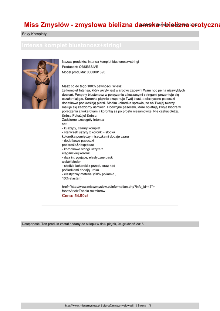 Utworzono: niedziela, 06 grudzień 2015 Miss Zmysłów - zmysłowa bielizna damska i bielizna erotyczna Sexy Komplety Intensa komplet biustonosz+stringi Nazwa produktu: Intensa komplet biustonosz+stringi Producent: OBSESSIVE Model produktu: 0000001395 Masz co do tego 100% pewności. Wiesz, że komplet Intensa, który ukryty jest w środku zapewni Wam noc pełną niezwykłych doznań. Ponętny biustonosz w połączeniu z kuszącymi stringami prezentuje się oszałamiająco. Koronka pięknie eksponuje Twój biust, a elastyczne paseczki dodatkowo podkreślają piersi. Słodka kokardka sprawia, że na Twojej twarzy maluje się zadziorny uśmiech. Podwójne paseczki, które oplatają Twoje biodra w połączeniu z kokardkami i koronką są po prostu niesamowite. Nie czekaj dłużej. Pokaż je! Zadziorne szczegóły Intensa set: - kuszący, czarny komplet - staniczek uszyty z koronki - słodka kokardka pomiędzy miseczkami dodaje czaru - dodatkowe paseczki podkreśla biust - koronkowe stringi uszyte z eleganckiej koronki - dwa intrygujące, elastyczne paski wokół bioder - słodkie kokardki z przodu oraz nad pośladkami dodają uroku - elastyczny materiał (90% poliamid , 10% elastan) href="http://www.misszmyslow.pl/information.php?info_id=47"> face=Arial>Tabela rozmiarów Cena: 54.90zł Dostępność: Ten produkt został dodany do sklepu w dniu piątek, 04 grudzień 2015 http://www.misszmyslow.pl | [email protected] | | Strona 1/1