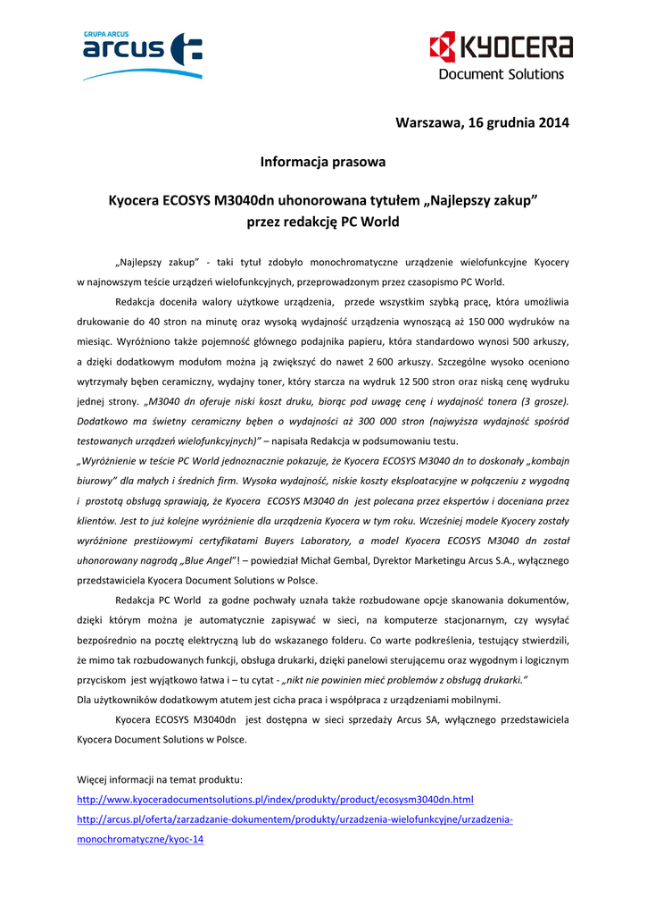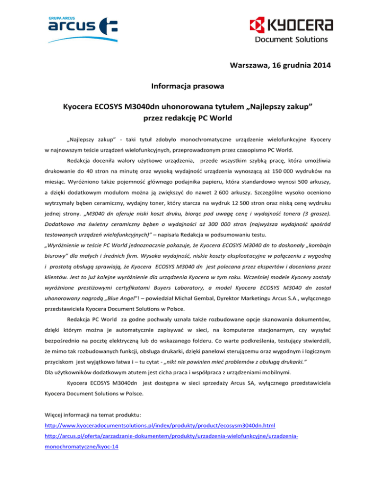 Warszawa, 16 grudnia 2014 Informacja prasowa Kyocera ECOSYS M3040dn uhonorowana tytułem „Najlepszy zakup” przez redakcję PC World „Najlepszy zakup” - taki tytuł zdobyło monochromatyczne urządzenie wielofunkcyjne Kyocery w najnowszym teście urządzeo wielofunkcyjnych, przeprowadzonym przez czasopismo PC World. Redakcja doceniła walory użytkowe urządzenia, przede wszystkim szybką pracę, która umożliwia drukowanie do 40 stron na minutę oraz wysoką wydajnośd urządzenia wynoszącą aż 150 000 wydruków na miesiąc. Wyróżniono także pojemnośd głównego podajnika papieru, która standardowo wynosi 500 arkuszy, a dzięki dodatkowym modułom można ją zwiększyd do nawet 2 600 arkuszy. Szczególne wysoko oceniono wytrzymały bęben ceramiczny, wydajny toner, który starcza na wydruk 12 500 stron oraz niską cenę wydruku jednej strony. „M3040 dn oferuje niski koszt druku, biorąc pod uwagę cenę i wydajnośd tonera (3 grosze). Dodatkowo ma świetny ceramiczny bęben o wydajności aż 300 000 stron (najwyższa wydajnośd spośród testowanych urządzeo wielofunkcyjnych)” – napisała Redakcja w podsumowaniu testu. „Wyróżnienie w teście PC World jednoznacznie pokazuje, że Kyocera ECOSYS M3040 dn to doskonały „kombajn biurowy” dla małych i średnich firm. Wysoka wydajnośd, niskie koszty eksploatacyjne w połączeniu z wygodną i prostotą obsługą sprawiają, że Kyocera ECOSYS M3040 dn jest polecana przez ekspertów i doceniana przez klientów. Jest to już kolejne wyróżnienie dla urządzenia Kyocera w tym roku. Wcześniej modele Kyocery zostały wyróżnione prestiżowymi certyfikatami Buyers Laboratory, a model Kyocera ECOSYS M3040 dn został uhonorowany nagrodą „Blue Angel”! – powiedział Michał Gembal, Dyrektor Marketingu Arcus S.A., wyłącznego przedstawiciela Kyocera Document Solutions w Polsce. Redakcja PC World za godne pochwały uznała także rozbudowane opcje skanowania dokumentów, dzięki którym można je automatycznie zapisywad w sieci, na komputerze stacjonarnym, czy wysyład bezpośrednio na pocztę elektryczną lub do wskazanego folderu. Co warte podkreślenia, testujący stwierdzili, że mimo tak rozbudowanych funkcji, obsługa drukarki, dzięki panelowi sterującemu oraz wygodnym i logicznym przyciskom jest wyjątkowo łatwa i – tu cytat - „nikt nie powinien mied problemów z obsługą drukarki.” Dla użytkowników dodatkowym atutem jest cicha praca i współpraca z urządzeniami mobilnymi. Kyocera ECOSYS M3040dn jest dostępna w sieci sprzedaży Arcus SA, wyłącznego przedstawiciela Kyocera Document Solutions w Polsce. Więcej informacji na temat produktu: http://www.kyoceradocumentsolutions.pl/index/produkty/product/ecosysm3040dn.html http://arcus.pl/oferta/zarzadzanie-dokumentem/produkty/urzadzenia-wielofunkcyjne/urzadzeniamonochromatyczne/kyoc-14 O GRUPIE ARCUS ARCUS SA jest jednym z największych na polskim rynku dostawców zintegrowanych systemów zarządzania dokumentem i korespondencją masową. ARCUS SA jest przedstawicielem Kyocera Document Solutions oraz Pitney Bowes w Polsce. ARCUS SA i spółki zależne: T-matic Systems SA oraz ARCUS Systemy Informatyczne Sp. z o.o. dostarczają również kompleksowe rozwiązania oraz usługi z zakresu telematyki i inteligentnych sieci, a także integracji rozwiązań ICT (technologie informacyjno-telekomunikacyjne). Czwartą spółką wchodzącą w skład GRUPY ARCUS jest DocuSoft Sp. z o.o. produkująca systemy do obiegu informacji. Do największych klientów GRUPY ARCUS należą banki, firmy ubezpieczeniowe, firmy z branży telekomunikacyjnej, operatorzy pocztowi i logistyczni oraz administracja publiczna na szczeblu centralnym i lokalnym. O KYOCERA Document Solutions Europe B.V. KYOCERA Document Solutions jest jednym z wiodących na świecie dostawców rozwiązań z zakresu zarządzaniem dokumentami. Zakres produktów i usług firmy obejmuje drukarki ECOSYS, niezawodne urządzenia wielofunkcyjne, wysokiej jakości materiały eksploatacyjne i szeroki zakres rozwiązań programowych i Managed Services Document (MDS). Oferta KYOCERA Document Solutions zawiera innowacyjne produkty z komponentami o długiej żywotności. Ich użytkownicy korzystają z niskiego całkowitego kosztu posiadania (TCO) rozwiązań oraz wysokiej wydajności w każdym miejscu pracy. Oferta rozwiązań i usługi Managed Document Services umożliwiają klientom zmniejszenie kosztów, pozytywny wpływ na środowisko oraz poprawę efektywności i niezawodności procesów biznesowych w tym samym czasie. Więcej informacji na stronie: www.kyoceradocumentsolutions.pl. KYOCERA Document Solutions Inc. jest spółką zależną firmy Kyocera Corporation, która w 2009 roku obchodziła swoją 50-ą rocznicę. Zajmująca 531 miejsce na liście 2000 największych światowych firm notowanych na giełdzie magazynu Forbes, Kyocera jest wiodącym producentem nowoczesnej ceramiki, komponentów elektronicznych, ogniw słonecznych i elektronicznego sprzętu biurowego. Długoterminową strategią wzrostu KYOCERA są działania wspierające sektory telekomunikacji, przetwarzanie informacji, ochrony środowiska oraz poprawy jakości życia. Kontakt dla mediów: Michał Gembal Dyrektor Marketingu ARCUS S.A. tel. (22) 53 60 900 e-mail: [email protected]