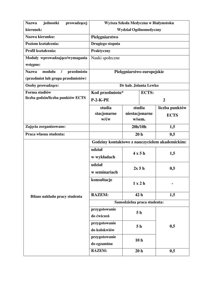 Nazwa jednostki prowadzącej Wyższa Szkoła Medyczna w Białymstoku kierunek: Wydział Ogólnomedyczny Nazwa kierunku: Pielęgniarstwo Poziom kształcenia: Drugiego stopnia Profil kształcenia: Praktyczny Moduły wprowadzające/wymagania Nauki społeczne wstępne: Nazwa modułu / przedmiotu Pielęgniarstwo europejskie (przedmiot lub grupa przedmiotów) Osoby prowadzące: Forma studiów liczba godzin/liczba punktów ECTS Dr hab. Jolanta Lewko Kod przedmiotu* ECTS: P-2-K-PE 2 studia stacjonarne w/ćw studia niestacjonarne w/sem. liczba punktów Zajęcia zorganizowane: 20h/10h 1,5 Praca własna studenta: 20 h 0,5 ECTS Godziny kontaktowe z nauczycielem akademickim: udział w wykładach udział w seminariach konsultacje Bilans nakładu pracy studenta RAZEM: 4x5h 1,5 2x 5 h 0,5 1x2h - 42 h 1,5 Samodzielna praca studenta: przygotowanie do ćwiczeń przygotowanie do kolokwiów przygotowanie do egzaminu RAZEM: 5h 5h 0,5 10 h 20 h 0,5 Cele modułu: Celem przedmiotu jest zapoznanie studenta z procesem kształcenia pielęgniarek w Unii Europejskiej oraz badaniami prowadzonymi na rzecz rozwoju pielęgniarstwa jako nauki. Efekty kształcenia: Przedmiotowy efekt kształcenia Efekty kształcenia Odniesienie do kierunkowych efektów kształcenia Wiedza EKP_W01. EKP_W02. EKP_W03. EKP_W04. EKP_W05. EKP_W06. zna przepisy prawne dotyczące zawodu, systemów kształcenia i nabywania kwalifikacji zawodowych pielęgniarki w Polsce i w Unii Europejskiej; charakteryzuje systemy opieki pielęgniarskiej w Unii Europejskiej i wyjaśnia zasady funkcjonowania pielęgniarstwa na świecie; różnicuje systemy kształcenia przed- i podyplomowego pielęgniarek w poszczególnych krajach Unii Europejskiej; zna rolę i obszary działania pielęgniarskich stowarzyszeń i organizacji międzynarodowych oraz krajowych, np. Polskiego Towarzystwa Pielęgniarskiego (PTP), International Council of Nurses (ICN), European Federation of Nurses (EFN), Europejskiej Grupy Pielęgniarek Badaczy (WENR); omawia procedurę uznawania kwalifikacji zawodowych pielęgniarek w Unii Europejskiej; zna rolę WHO i ICN w rozwoju pielęgniarstwa; A.W4. A.W5. A.W6. A.W7. A.W8. A.W9. Umiejętności EKP_U01. EKP_U02. EKP_U03. EKP_U04. analizuje obszary działania pielęgniarstwa polskiego, europejskiego i światowego; stosuje w pracy zawodowej przepisy prawa europejskiego dotyczące pielęgniarstwa; korzysta z informacji oraz danych przekazywanych przez międzynarodowe organizacje i stowarzyszenia pielęgniarskie; określa, zgodnie ze strategią europejską, kierunek badań naukowych w pielęgniarstwie; A.U3. A.U4. A.U5. A.U6. Kompetencje społeczne EKP_K01. krytycznie ocenia własne i cudze działania, B.K2. przy zachowaniu szacunku dla różnic światopoglądowych i kulturowych; Forma zajęć/metody dydaktyczne: Wykłady - metody podające: wykład informacyjny, pogadanka, opis, objaśnienie lub wyjaśnienie; Seminaria - metody aktywizujące: metoda problemowa problemowa. Metody weryfikacji efektu kształcenia: Nr efektu kształcenia Metody weryfikacji efektu kształcenia formujące podsumowujące A.W4. Egzamin teoretyczny A.W5. Egzamin teoretyczny A.W6. Egzamin teoretyczny A.W7. Egzamin teoretyczny A.W8. A.W9. A.U3. A.U4. A.U5. A.U6. B.K2. Obserwacje i ocena umiejętności praktycznych studenta Ocena zaangażowania w dyskusji Ocena zaangażowania w dyskusji Raporty grupowe Obserwacje i ocena umiejętności praktycznych studenta Zadania wykonane indywidualnie Obserwacje i ocena umiejętności praktycznych studenta Treści programowe: Wykłady – 20 godz. 1. Pielęgniarstwo europejskie - charakterystyka przedmiotu nauczania. 2. Proces Boloński. Międzynarodowe standardy kształcenia i kwalifikacji zawodowych pielęgniarek i położnych w Unii Europejskiej. 3. Rola i zadania krajowych i międzynarodowych organizacji i stowarzyszeń pielęgniarskich. 4. Kierunki rozwoju pielęgniarstwa w Europie i na świecie. Badania pielęgniarskie i ich edukacyjne determinanty w wybranych krajach kręgu euroatlantyckiego. Dowody naukowe w opiece zdrowotnej. 5. Zawód pielęgniarki i położnej w Unii Europejskiej. Prawo europejskie dla pielęgniarek. Seminaria – 10 godz. 1. Fiński system kształcenia pielęgniarek. 2. Kształcenie pielęgniarek w Norwegii. 3. Charakterystyka systemu pielęgniarskiego w Wielkiej Brytanii, Niemczech, Szwecji z uwzględnieniem otoczenia systemowego. 4. Kształcenie pielęgniarek w Grecji. Pielęgniarstwo w Portugalii i Hiszpanii. 5. Belgijski system kształcenia pielęgniarek. Kształcenie pielęgniarek w Holandii. 6. E-learning w kształceniu akademickim pielęgniarek. 7. Międzynarodowe klasyfikacje praktyki pielęgniarskiej. 8. System opieki pielęgniarskiej w Niemczech, Czechach, Słowacji i na Węgrzech. Literatura podstawowa: 1. Wrońska I., Krajewska-Kułak E.: Wybrane zagadnienia z pielęgniarstwa europejskiego. Czelej, Lublin 2007. 2. Wrońska I.: Integracja pielęgniarstwa europejskiego. Problemy Pielęgniarstwa, 1996, 1-2(6) s.93-100. 3. Wrońska I.: Rola społeczno-zawodowa. Studium współczesnego pielęgniarstwa. Warszawa 1997. Literatura uzupełniająca: 1. Konstytucja Unii Europejskiej. Bruksela, 29 października 2004r. 2. Abako A.: Unia Europejska. Fundusze strukturalne a obszar Ochrony Zdrowia. ZGPTP – broszura. Warszawa, 2002. 3. Grzywna T., Nowak – Starz G., Zdziebło K. Pielęgniarstwo w Unii Europejskiej. VII Kongres Pielęgniarek Polskich. Problemy Pielęgniarstwa, Sopot, 2004, s. 11- 42. 4. Janus B.: Międzynarodowa Rada Pielęgniarek – linia działania. Współpraca Towarzystwa Pielęgniarskiego z organizacjami międzynarodowymi. Problemy Pielęgniarstwa, Warszawa, 1 – 2/ 2005 s. 10 – 24. 5. Wolska – Lipiec K. Z życia Polskiego Towarzystwa Pielęgniarskiego. Pielęgniarka i Położna. I/ 2002. S. 13. 6. Zdziebło K.: Edukacja pielęgniarek we Francji na przykładzie IFSI w Bordeaux. Pielęgniarka i Położna 1/ 2005 s. 17 – 20. 7. Lewko J., Ostapowicz- Van Damme K., Krajewska-Kułak E.: Strateg