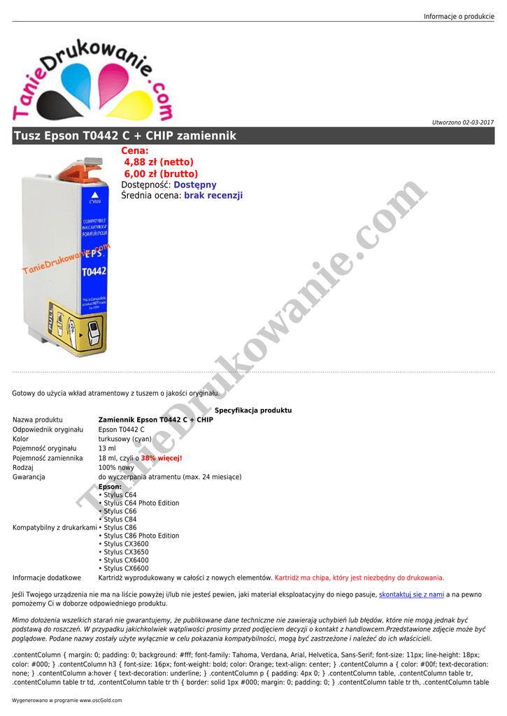 Dostępne opcje Tusz Epson T0442 C + CHIP zamiennik