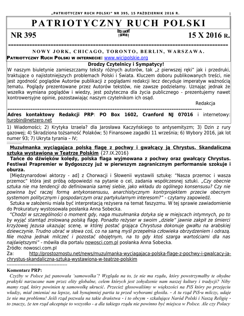 „PATRIOTYCZNY RUCH POLSKI” NR 395, 15 PAŹDZIERNIK 2016 R. 1 PATRIOTYCZNY RUCH POLSKI NR 395 15 X 2016 R. ----------------------------------------------------------------------------------NOWY JORK, CHICAGO, TORONTO, BERLIN, WARSZAWA. PATRIOTYCZNY RUCH POLSKI W INTERNECIE: www.wicipolskie.org Drodzy Czytelnicy i Sympatycy! W naszym biuletynie zamieszczamy teksty różnych autorów, tak „z pierwszej ręki” jak i przedruki, traktujące o najistotniejszych problemach Polski i Świata. Kluczem doboru publikowanych treści, nie jest zgodność poglądów Autorów publikacji z poglądami redakcji lecz decyduje imperatyw ważnością tematu. Poglądy prezentowane przez Autorów tekstów, nie zawsze podzielamy. Uznając jednak że wszelka wymiana poglądów i wiedzy, jest pożyteczna dla życia publicznego - prezentujemy nawet kontrowersyjne opinie, pozostawiając naszym czytelnikom ich osąd. Redakcja ------------------------------------------------------------------------------------------------------------Adres kontaktowy Redakcji PRP: PO Box 1602, Cranford NJ 07016 i internetowy: [email protected] 1) Wiadomości; 2) Krytyka Izraela? dla Jarosława Kaczyńskiego to antysemityzm; 3) Dzin z rury gazowej; 4) Skradziona tożsamość Polaków; 5) Finansowe zagadki 11 września; 6) Wybory 2016, jak lot numer 93; 7) Ukryta tyrania – IV; ----------------------------------------------------------------------------------------------------------------------------------------------------------------------------------------------------------------------------------------------------------------------------------------------------------------------------------------------------------------------------------------------------------------- Muzułmanka wyciągająca polską flagę z pochwy i gwałcący ją Chrystus. Skandaliczna sztuka wystawiona w Teatrze Polskim {27.IX.2016} Tańce do dźwięków kolędy, polska flaga wyjmowana z pochwy oraz gwałcący Chrystus. Festiwal Prapremier w Bydgoszczy już w pierwszym zagranicznym performansie szokuje i oburza. [Międzynarodowi aktorzy - ad] z Chorwacji i Słowenii wystawili sztukę: “Nasza przemoc i wasza przemoc” która jest próbą odpowiedzi na pytanie o cel, zadania współczesnej sztuki. „Czy obecnie sztuka nie ma tendencji do definiowania samej siebie, jako wkładu do ogólnego konsensusu? Czy nie powinna być raczej formą antykonsensusu, anarchistycznym kontrprojektem przeciw obecnym systemom politycznym i gospodarczym oraz partykularnym interesom?” - czytamy zapowiedź. Sztuka w założeniu miała być interpretacją reżysera na temat faszyzmu. W tej sprawie zawiadomienie do Prokuratury wystosowała posłanka Anna Sobecka. “Chodzi w szczególności o moment gdy, naga muzułmanka dotyka się w miejscach intymnych, po to by wyjąć stamtąd zrolowaną polską flagę. Ponadto reżyser w swoim „dziele” jawnie zakpił ze śmierci krzyżowej Jezusa ukazując scenę, w której postać grająca Chrystusa dokonuje gwałtu na arabskiej dziewczynie. Trudno ubrać w słowa coś, co na samą myśl przepełnia człowieka obrzydzeniem i odrazą. Nie można jednak milczeć i pozostać obojętnym, na to gdy ktoś szarga wartościami dla nas najświętszymi” - mówiła dla portalu nowosci.com.pl posłanka Anna Sobecka. Źródło: nowosci.com.pl Za: http://prostozmostu.net/news/muzulmanka-wyciagajaca-polska-flage-z-pochwy-i-gwalcacy-jachrystus-skandaliczna-sztuka-wystawiona-w-teatrze-polskim --------------------------------------Komentarz PRP: Czyżby w Polsce już panowała ‘samowolka’? Wygląda na to, że nie ma rządu, który powstrzymałby te ohydne praktyki narzucane nam przez elity globalne, celem których jest zohydzenie nam naszej kultury i tradycji? Niby mamy rząd, który powinien tę samowolkę ukrucić. Przecież głosowaliśmy w większości na PiS który po przejęciu władzy, miał zmieniać na lepsze, tak bynajmniej partia ta przed wyborami głosiła. - A tu rząd PiS-u milczy, udaje że nie ma problemu! Jeśli rząd pozwala na takie draństwa - i to obcym - szkalujące Naród Polski i Naszą Religię to znaczy, że ten rząd akceptuje to wszystko - a dla takiego rządu nie powinno być miejsca w Polsce. Ale czy Polacy 2 „PATRIOTYCZNY RUCH POLSKI” NR 395, 15 PAŹDZIERNIK 2016 R. to rozumieją? Myślę że w swoim zacietrzewieniu „kibicowskim” dla PiS i dla PO zapominają o właściwych sprawach, jakie mają miejsce w Polsce - a to w tym czasie, w czasie deprawacji Narodu polskiego, a przy tym, celowego zastraszania najeźdźcami syjono-islamskimi i ściąganiem na siłę do Polski Ukraińców a wśród nich międzynarodowych “mętów” - rząd z opozycją [z PO i KOD], w tym czasie po cichutku, pozorując między sobą “wojnę” - przekazują wszystkie dobra naszej Ojczyzny w ręce międzynarodowego żydostwa [wystarczy prześledzić jakie uchwały i ustawy na niekorzyść Polski są przepychane w Sejmie, a na temat podpisania międzynarodowych umów TTIP i CETA, które mogą wykończyć Polskę rząd milczy nie informując o tym Polaków]. I to jest właściwy problem, który prowadzi do likwidacji Polski lub też całkowitego wynarodowienia poprzez masowe sprowadzanie obcych, co na jedno wychodzi. Między innymi poprzez serwowanie takich demoralizujących „sztuk” społeczeństwo powoli zatraca właściwe człowieczeństwu postawy; takim społeczeństwem jest o wiele łatwiej manipulować i sprowadzać go do „parteru”. I o to właśnie chodzi. # # # “Stadion to nie miejsce na patriotyzm” {24.IX.2016} Tak przynajmniej orzekł lubelski sąd. Wyjątkowo wysokimi wyrokami zakończył się w pierwszej instancji proces trójki oskarżonych o wywieszenie przed blisko dwoma laty podczas meczu rugby Polska-Ukraina transparentu o treści „Lwów odzyskamy - Banderowców ubijemy”. Żaden z oskarżonych nie przyznał się do winy, monitoring również nie potwierdził, że to siedzący na ławie oskarżonych 