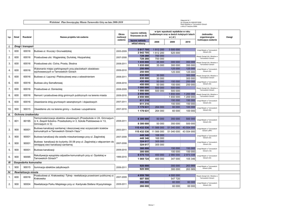 Załącznik Nr 1 do Uchwały Nr XXIX/297/2008 Rady Miejskiej w Tarnowskich Górach z dnia 27 sierpnia 2008r. Wieloletni Plan Inwestycyjny Miasta Tarnowskie Góry na lata 2008-2010 Lp. Dział Rozdział Nazwa projektu lub zadania Okres realizacji zadania I. Drogi i transport 1. 600 60016 Budowa ul. Kruczej i Grunwaldzkiej 2005-2009 2. 600 60016 Przebudowa ulic: Węgierskiej, Duńskiej, Hiszpańskej 2007-2008 3. 600 60016 Przebudowa ulic: Cicha, Prosta, Skośna 2008-2011 4. 600 60016 Wykonanie miejsc parkingowych przy placówkach oświatowowychowawczych w Tarnowskich Górach 2009-2010 5. 600 60016 Budowa ul. Łącznej i Plebiscytowej wraz z odwodnieniem 2008-2011 6. 600 60016 Budowa ulicy Semaforowej 2008-2010 7. 600 60016 Przebudowa ul. Donieckiej 2008-2009 8. 600 60016 Remont i przebudowa dróg gminnych publicznych na terenie miasta 2009-2010 9. 600 60016 Utwardzenie dróg gruntowych wewnętrznych i dojazdowych 2007-2011 10. 900 90015 Oświetlenie ulic na terenie gminy – budowa i uzupełnienie 2007-2010 II. Ochrona środowiska Termomodernizacja obiektów oświatowych (Przedszkole nr 24, Gimnazjum 801 80195 nr 4, Zespół Szkolno- Przedszkolny nr 3, Szkoła Podstawowa nr 13, Gimnazjum nr 3) 1. 900 90001 Budowa kanalizacji sanitarnej i deszczowej oraz oczyszczalni ścieków komunalnych w Tarnowskich Górach-I faza * 2003-2011 3. 900 90001 Budowa kanalizacji dla osiedla mieszkaniowego przy ul. Zagórskiej 2007-2008 4. 900 90001 Budowa kanalizacji do budynku 30-38 przy ul. Zagórskiej z włączeniem do 2007-2008 istniejącej sieci kanalizacji sanitarnej 5. 900 90001 Budowa kanalizacji 2009-2010 6. 900 90095 Rekultywacja wysypiska odpadów komunalnych przy ul. Opolskiej w Tarnowskich Górach** 1999-2010 III Gospodarka komunalna 1. 900 IV. Rewitalizacja miasta Przebudowa ul. Krakowskiej i Tylnej– rewitalizacja przestrzeni publicznej ul. 2007-2009 600 60016 Krakowska 1. 2. 900 90004 Iluminacja obiektów zabytkowych Rewitalizacja Parku Miejskiego przy ul. Kardynała Stefana Wyszyńskiego łączne nakłady wkład własny 2008 2009 5 817 705 2 842 705 729 280 729 280 1 035 000 1 035 000 250 000 250 000 830 000 830 000 450 000 450 000 1 000 000 1 000 000 2 850 000 2 850 000 611 316 611 316 1 179 631 1 812 200 1 812 200 700 000 700 000 35 000 35 000 1 179 631 30 30 50 50 500 500 000 000 000 000 000 000 2010 3 500 000 525 000 Miejski Zarząd Ulic i Mostów w Tarnowskich Górach 300 300 125 125 150 150 500 500 1 650 1 650 150 150 60 000 000 000 000 350 350 125 125 300 300 250 250 000 000 000 000 000 000 000 000 000 000 000 000 000 000 000 000 000 1 200 000 1 200 000 150 000 150 000 100 000 264 000 60 000 100 000 8 300 000 50 000 350 000 500 000 8 300 000 50 000 350 000 500 000 115 432 536 11 566 000 51 040 000 43 554 000 115 432 448 448 324 324 11 566 168 168 305 305 51 040 000 43 554 000 264 000 2006-2011 2009-2011 536 346 346 617 617 300 000 300 000 6 570 733 1 069 724 000 000 000 000 000 Miejski Zarząd Ulic i Mostów w Tarnowskich Górach Urząd Miejski w Tarnowskich Górach (GI) Miejski Zarząd Ulic i Mostów w Tarnowskich Górach Urząd Miejski w Tarnowskich Górach (GI) Miejski Zarząd Ulic i Mostów w Tarnowskich Górach Miejski Zarząd Ulic i Mostów w Tarnowskich Górach Urząd Miejski w Tarnowskich Górach (GI) Urząd Miejski w Tarnowskich Górach (GI) Urząd Miejski w Tarnowskich Górach (GI) Urząd Miejski w Tarnowskich Górach (JRP) Urząd Miejski w Tarnowskich Górach (GI) Urząd Miejski w Tarnowskich Górach (GI) 400 000 150 000 150 000 2 980 000 150 000 150 000 2 973 335 400 000 347 000 105 346 920 000 920 000 300 000 300 000 263 989 263 989 4 059 780 607 500 266 000 4 000 000 547 720 60 000 60 000 266 000 60 000 60 000 Strona 1 Jednostka organizacyjna realizująca zadanie Urząd Miejski w Tarnowskich Górach (GI) 2008-2011 2. 90015 w tym: wysokość wydatków w roku budŜetowym oraz w dwóch kolejnych latach w ( zł ) Łączne nakłady finansowe (w zł) Urząd Miejski w Tarnowskich Górach ( GI) Urząd Miejski w Tarnowskich Górach (GI) Urząd Miejski w Tarnowskich Górach (GM) Miejski Zarząd Ulic i Mostów w Tarnowskich Górach Urząd Miejski w Tarnowskich Górach (GI) Uwagi Lp. Dział Rozdział Okres realizacji zadania Nazwa projektu lub zadania V. Mieszkalnictwo i usługi towarzyszące 1. 700 70021 Budowa osiedla mieszkaniowego Sielanka – II etap (współfinansowanie) 2007-2010 2. 700 70095 Budowa dwóch budynków komunalnych 2008-2010 w tym: wysokość wydatków w roku budŜetowym oraz w dwóch kolejnych latach w ( zł ) Łączne nakłady finansowe (w zł) łączne nakłady wkład własny 4 4 11 11 150 150 200 200 2008 000 000 000 000 2009 200 000 200 000 2 2 5 5 000 000 000 000 2010 000 000 000 000 2 2 6 6 000 000 000 000 000 000 000 000 Jednostka organizacyjna realizująca zadanie Urząd Miejski w Tarnowskich Górach (GM) Urząd Miejski w Tarnowskich Górach (GI) VI. Rozwój przedsiębiorczości 1. VII. 900 90095 Infrastruktura terenów inwestycyjnych według wskazań planów zagospodarowania przestrzennego miasta 2009-2011 600 000 700 000 2 000 000 600 000 700 000 Urząd Miejski w Tarnowskich Górach (GI) Edukacja 1. 926 92605 Budowa wielofunkcyjnego boiska do hokeja na trawie na terenie Gimnazjum Nr 4 przy ulicy W. Janasa 11 w Tarnowskich Górach 2007-2009 2. 926 92605 Budowa boiska wielofunkcyjnego przy Szkole Podstawowej nr 10 2007- 2008 3. 926 92605 Modernizacja basenu ( Szkoła Podstawowa nr 10) 2009-2010 4. 926 92605 Budowa boiska wielofunkcyjnego przy Gimnazjum nr 2 2007-2008 5. 926 92605 Budowa boiska piłkarskiego przy Szkole Podstawowej nr 13 2007- 2008 VIII. 2 000 000 4 600 690 544 544 210 210 614 614 726 426 000 000 981 981 000 000 981 981 981 981 4 351 923 441 923 Urząd Miejski w Tarnowskich Górach (GI) 530 000 530 000 Urząd Miejski w Tarnowskich Górach (GI) 105 000 105 000 600 600 712 412 000 000 000 000 105 000 105 000 Urząd Miejski w Tarnowskich Górach (GM) Urząd Miejski w Tarnowskich Górach (GI) Urząd Miejski w Tarnowskich Górach (GI) Kultura 1