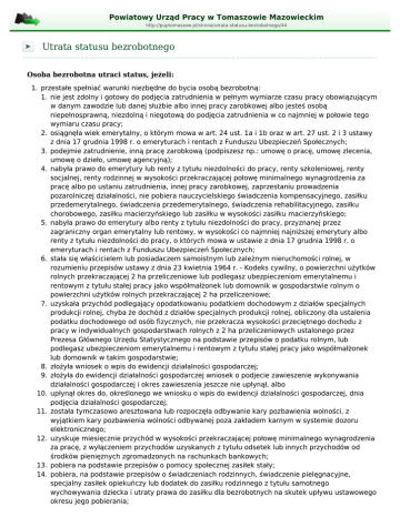 Powiatowy Urząd Pracy w Tomaszowie Mazowieckim http://puptomaszow.pl/strona/utrata-statusu-bezrobotnego/44 Utrata statusu bezrobotnego Osoba bezrobotna utraci status, jeżeli: 1. przestałe spełniać warunki niezbędne do bycia osobą bezrobotną: 1. nie jest zdolny i gotowy do podjęcia zatrudnienia w pełnym wymiarze czasu pracy obowiązującym w danym zawodzie lub danej służbie albo innej pracy zarobkowej albo jesteś osobą niepełnosprawną, niezdolną i niegotową do podjęcia zatrudnienia w co najmniej w połowie tego wymiaru czasu pracy; 2. osiągnęła wiek emerytalny, o którym mowa w art. 24 ust. 1a i 1b oraz w art. 27 ust. 2 i 3 ustawy z dnia 17 grudnia 1998 r. o emeryturach i rentach z Funduszu Ubezpieczeń Społecznych; 3. podejmie zatrudnienie, inną pracę zarobkową (podpiszesz np.: umowę o pracę, umowę zlecenia, umowę o dzieło, umowę agencyjną); 4. nabyła prawo do emerytury lub renty z tytułu niezdolności do pracy, renty szkoleniowej, renty socjalnej, renty rodzinnej w wysokości przekraczającej połowę minimalnego wynagrodzenia za pracę albo po ustaniu zatrudnienia, innej pracy zarobkowej, zaprzestaniu prowadzenia pozarolniczej działalności, nie pobiera nauczycielskiego świadczenia kompensacyjnego, zasiłku przedemerytalnego, świadczenia przedemerytalnego, świadczenia rehabilitacyjnego, zasiłku chorobowego, zasiłku macierzyńskiego lub zasiłku w wysokości zasiłku macierzyńskiego; 5. nabyła prawo do emerytury albo renty z tytułu niezdolności do pracy, przyznanej przez zagraniczny organ emerytalny lub rentowy, w wysokości co najmniej najniższej emerytury albo renty z tytułu niezdolności do pracy, o których mowa w ustawie z dnia 17 grudnia 1998 r. o emeryturach i rentach z Funduszu Ubezpieczeń Społecznych; 6. stała się właścicielem lub posiadaczem samoistnym lub zależnym nieruchomości rolnej, w rozumieniu przepisów ustawy z dnia 23 kwietnia 1964 r. - Kodeks cywilny, o powierzchni użytków rolnych przekraczającej 2 ha przeliczeniowe lub podlegasz ubezpieczeniom emerytalnemu i rentowym z tytułu stałej pracy jako współmałżonek lub domownik w gospodarstwie rolnym o powierzchni użytków rolnych przekraczającej 2 ha przeliczeniowe; 7. uzyskała przychód podlegający opodatkowaniu podatkiem dochodowym z działów specjalnych produkcji rolnej, chyba że dochód z działów specjalnych produkcji rolnej, obliczony dla ustalenia podatku dochodowego od osób fizycznych, nie przekracza wysokości przeciętnego dochodu z pracy w indywidualnych gospodarstwach rolnych z 2 ha przeliczeniowych ustalonego przez Prezesa Głównego Urzędu Statystycznego na podstawie przepisów o podatku rolnym, lub podlegasz ubezpieczeniom emerytalnemu i rentowym z tytułu stałej pracy jako współmałżonek lub domownik w takim gospodarstwie; 8. złożyła wniosek o wpis do ewidencji działalności gospodarczej; 9. złożyła do ewidencji działalności gospodarczej wniosek o podjecie zawieszenie wykonywania działalności gospodarczej i okres zawieszenia jeszcze nie upłynął, albo 10. upłynął okres do, określonego we wniosku o wpis do ewidencji działalności gospodarczej, dnia podjęcia działalności gospodarczej; 11. została tymczasowo aresztowana lub rozpoczęła odbywanie kary pozbawienia wolności, z wyjątkiem kary pozbawienia wolności odbywanej poza zakładem karnym w systemie dozoru elektronicznego; 12. uzyskuje miesięcznie przychód w wysokości przekraczającej połowę minimalnego wynagrodzenia za pracę, z wyłączeniem przychodów uzyskanych z tytułu odsetek lub innych przychodów od środków pieniężnych zgromadzonych na rachunkach bankowych; 13. pobiera na podstawie przepisów o pomocy społecznej zasiłek stały; 14. pobiera, na podstawie przepisów o świadczeniach rodzinnych, świadczenie pielęgnacyjne, specjalny zasiłek opiekuńczy lub dodatek do zasiłku rodzinnego z tytułu samotnego wychowywania dziecka i utraty prawa do zasiłku dla bezrobotnych na skutek upływu ustawowego okresu jego pobierania; 15. pobiera po ustaniu zatrudnienia świadczenie szkoleniowe; 16. podlega, na podstawie odrębnych przepisów, obowiązkowi ubezpieczenia społecznego, z wyjątkiem ubezpieczenia społecznego rolników; 17. pobiera na podstawie przepisów o ustaniu i wypłacie zasiłków dla opiekunów zasiłek dla opiekuna; 2. nie wyrazi zgody na ustalenie profilu pomocy; 3. otrzyma: 1. pożyczkę z Państwowego Funduszu Rehabilitacji Osób Niepełnosprawnych lub instytucji z udziałem środków publicznych na podjęcie działalności pozarolniczej lub rolniczej; 2. pożyczkę na podjęcie działalności gospodarczej; 3. jednorazowo środki na podjęcie działalności gospodarczej; 4. jednorazowo środki z Państwowego Funduszu Rehabilitacji Osób Niepełnosprawnych lub z instytucji z udziałem środków publicznych na podjęcie działalności gospodarczej, rolniczej lub na wniesienie wkładu do spółdzielni socjalnej; 4. rozpocznie realizację indywidualnego programu zatrudnienia socjalnego lub podpiszesz kontrakt socjalny, o którym mowa w art. 50 ust. 2 pkt 2; 5. odmówi bez uzasadnionej przyczyny: 1. przyjęcia propozycji odpowiedniej pracy lub innej formy pomocy określonej w ustawie lub poddania się badaniom lekarskim lub psychologicznym, mającym na celu ustalenie zdolności do pracy lub udziału w innej formie pomocy określonej w ustawie; 2. udziału w działaniach w ramach Programu Aktywizacja i Integracja, realizowanych przez powiatowy urząd pracy, inne podmioty na jego zlecenie lub przez ośrodek pomocy społecznej; 6. nie stawi się: 1. w powiatowym urzędzie pracy w wyznaczonym terminie i nie powiadomi w okresie do 7 dni o uzasadnionej przyczynie tego niestawiennictwa; 2. w powiatowym urzędzie pracy właściwym dla nowego miejsca zamieszkania w terminie 14 dni od dnia zmiany miejsca zameldowania; 7. złoży wniosek o pozbawienie statusu bezrobotnego; 8. z własnej winy przerwie: 1. szkolenie, staż, realizację indywi