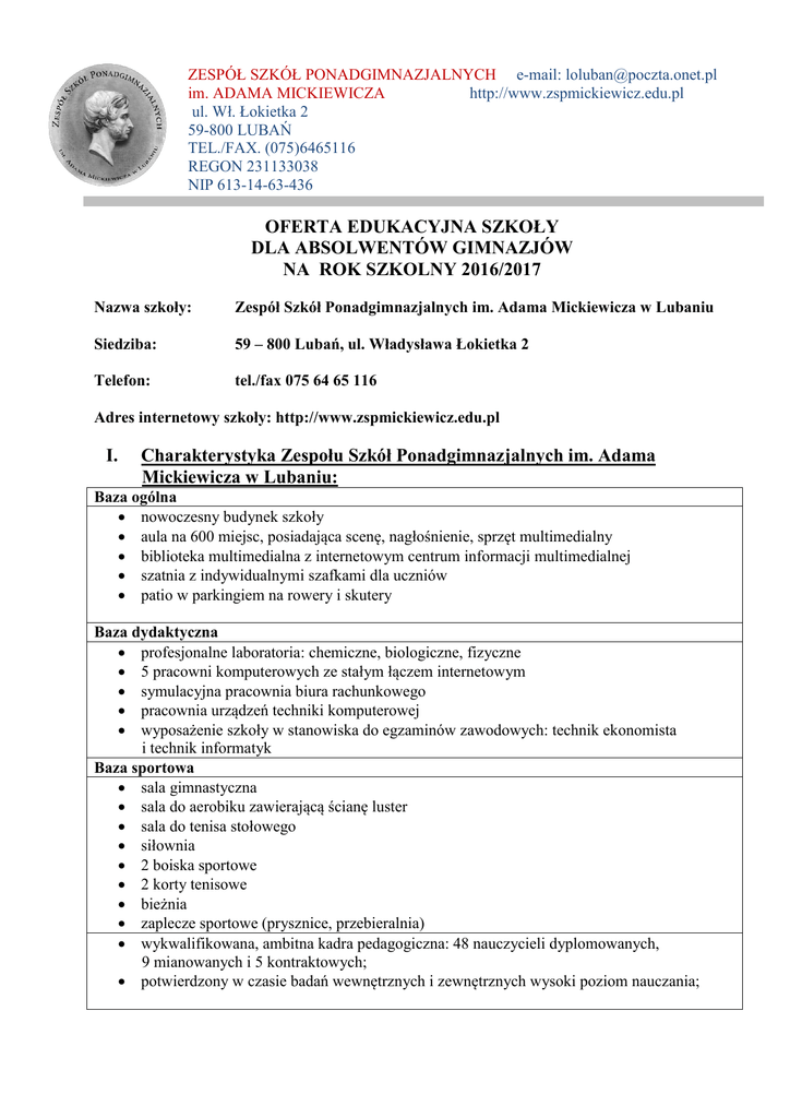 ZESPÓŁ SZKÓŁ PONADGIMNAZJALNYCH e-mail: [email protected] im. ADAMA MICKIEWICZA http://www.zspmickiewicz.edu.pl ul. Wł. Łokietka 2 59-800 LUBAŃ TEL./FAX. (075)6465116 REGON 231133038 NIP 613-14-63-436 OFERTA EDUKACYJNA SZKOŁY DLA ABSOLWENTÓW GIMNAZJÓW NA ROK SZKOLNY 2016/2017 Nazwa szkoły: Zespół Szkół Ponadgimnazjalnych im. Adama Mickiewicza w Lubaniu Siedziba: 59 – 800 Lubań, ul. Władysława Łokietka 2 Telefon: tel./fax 075 64 65 116 Adres internetowy szkoły: http://www.zspmickiewicz.edu.pl I. Charakterystyka Zespołu Szkół Ponadgimnazjalnych im. Adama Mickiewicza w Lubaniu: Baza ogólna nowoczesny budynek szkoły aula na 600 miejsc, posiadająca scenę, nagłośnienie, sprzęt multimedialny biblioteka multimedialna z internetowym centrum informacji multimedialnej szatnia z indywidualnymi szafkami dla uczniów patio w parkingiem na rowery i skutery Baza dydaktyczna profesjonalne laboratoria: chemiczne, biologiczne, fizyczne 5 pracowni komputerowych ze stałym łączem internetowym symulacyjna pracownia biura rachunkowego pracownia urządzeń techniki komputerowej wyposażenie szkoły w stanowiska do egzaminów zawodowych: technik ekonomista i technik informatyk Baza sportowa sala gimnastyczna sala do aerobiku zawierającą ścianę luster sala do tenisa stołowego siłownia 2 boiska sportowe 2 korty tenisowe bieżnia zaplecze sportowe (prysznice, przebieralnia) wykwalifikowana, ambitna kadra pedagogiczna: 48 nauczycieli dyplomowanych, 9 mianowanych i 5 kontraktowych; potwierdzony w czasie badań wewnętrznych i zewnętrznych wysoki poziom nauczania; Sukcesy i osiągnięcia edukacyjne liceum 100% absolwentów przystępuje do egzaminu maturalnego 95% absolwentów zdaje maturę 73% kontynuuje naukę na studiach w kraju i zagranicą, w tym około 45% wybiera studia politechniczne technikum 100% absolwentów przystępuje do egzaminu maturalnego 90% absolwentów zdaje maturę 89% uczniów zdało egzaminy potwierdzające kwalifikacje w zawodzie technik ekonomista 100% uczniów zdało egzaminy kwalifikacyjne w zawodzie technik informatyk Inne: Udział w projekcie „Erasmus + - IT&ECONOMY – zagraniczne praktyki zawodowe dla uczniów technikum do Włoch i Irlandii; Stały udział w Dolnośląskich Meczach Matematycznych organizowanych przez Uniwersytet Wrocławski; Wieloletni udział w projekcie Politechniki Wrocławskiej: Studium Talent; liczne sukcesy uczniów w olimpiadach, konkursach i zawodach sportowych; w tym sukcesy na szczeblu okręgowym i ogólnopolskim: ogólnopolski finał Mistrzostw Pierwszej Pomocy Przedmedycznej; w roku 2014/2015 sześciu finalistów olimpiad szczebla okręgowego i 3 finalistów olimpiad szczebla ogólnopolskiego: XLVI Olimpiada Języka Rosyjskiego; XXV Ogólnopolska Olimpiada Teologii Katolickiej; XXIX Międzynarodowych Mistrzostw w Grach Matematycznych i Logicznych; ogólnopolskie sukcesy „Teatru 9”: I Nagroda w Ogólnopolskim Festiwalu Teatralnym CHOCHOŁ we Wrocławiu; GRAN PRIX w Ogólnopolskim Festiwalu Teatralnym- XII Młodzieżowe Zatargi z Teatrem w Bolesławcu; finał 60 Ogólnopolskiego Konkursu Recytatorskiego; uprawnienia ośrodka egzaminacyjnego w zawodzie technik ekonomista i technik informatyk umowa partnerska z Uniwersytetem Wrocławskim, z Wydziałem Biotechnologii. Uczestniczą w niej klasy biologiczno - chemiczne, są to zajęcia laboratoryjne prowadzone przez pracowników uczelni; stała współpraca z Uniwersytetem Jagiellońskim w zakresie rozszerzania oferty zajęć w klasie o profilu administracyjno – prawnym; stała współpraca z Uniwersytetem Ekonomicznym we Wrocławiu pod kątem poszerzenia oferty zajęć dla uczniów klas technikum w zawodzie technik ekonomista i rachunkowości; nawiązanie współpracy z Hochschule Zittau-Gorlitz 23 lata współpracy ze szkołą w Niemczech - Eckenberg Gymnasium w Alelsheim, możliwość rocznego pobytu i nauki w tej szkole; 16 lat współpracy ze szkołami w Niemczech Christian Weise Gymnasium - Zittau oraz w Czechach - F.X. Saldy Gymnazium – Liberec; 10 lat współpracy z Landesschule Pforta w Schulpforte - możliwość nauki i pobytu w tej szkole; Bogata oferta zajęć pozalekcyjnych, konkursów i olimpiad: koło chemiczne i biologiczne koło matematyczne i fizyczne koła językowe (język angielski, język niemiecki) kółko patriotyczno - krajoznawczo- pielgrzymkowe - poznawanie zabytków sakralnych diecezji spotkania z teatrem – ,średnio w roku 6 wyjazdów do wrocławskich teatrów (Capitolu, Teatru Polskiego, Teatru Współczesnego) systematycznie organizowane wycieczki w kraju i za granicą( w tym rocznie około 22 wycieczki krajoznawczo – turystyczne w Polsce i około 7 wycieczek zagranicznych zajęcia muzealne - wyjazdy do muzeów w Berlinie, Dreźnie, Poczdamie, Wiedniu, Pradze, Budapeszcie Systematyczne wyjazdy edukacyjne na wyższe uczelnie i innych( 28 wycieczek edukacyjnych przeprowadzone w roku szkolnym 2014/2015) zajęcia przygotowujące do matury, konkursów i olimpiad z historii, WOS, języka polskiego, matematyki, fizyki, biologii, chemii, języków obcych i inne; Firma "Adaś" - organizacja imprez kulturalnych, w tym Talent Show i wieczorków filmowych; koło pierwszej pomocy przedmedycznej zajęcia sportowe: piłka siatkowa, piłka koszykowa, piłka nożna, zajęcia na siłowni koło młodych przedsiębiorców - "Młodzieżowe Miniprzedsiębiorstwo" koło informatyczne - potyczki informatyczne- Turniej gier sieciowych Teatr "Dziewiątka" - zajęcia teatralne możliwość wzięcia udziału w 14 Olimpiadach Przedmiotowych przeciętnie w roku udział uczniów w 71 konkursach szkolnych, powiatowych, wojewódzkich i ogólnopolskich; udział uczniów rocznie w średnio 25 konferencjach i warsztatach edukacyjnych na terenie szkoły; 16 projektów uczniowskich, w tym: „Ekologiczna Megabateria”; ,,Noc Biologów’’; ,,Zielony Rower”; Młodzieżowe Miniprzedsiębiorstwo; Uczniowski Mini Projekt Badawczy w Zakresie Innowacyjnego Zastosowania w