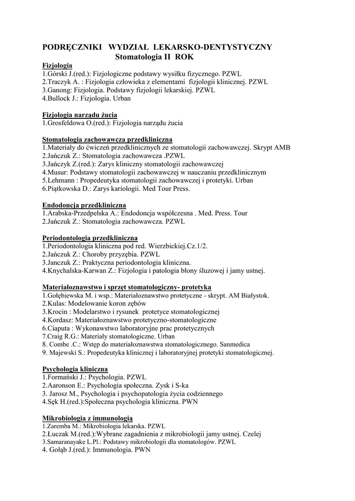 PODRĘCZNIKI WYDZIAŁ LEKARSKO-DENTYSTYCZNY Stomatologia II ROK Fizjologia 1.Górski J.(red.): Fizjologiczne podstawy wysiłku fizycznego. PZWL 2.Traczyk A. : Fizjologia człowieka z elementami fizjologii klinicznej. PZWL 3.Ganong: Fizjologia. Podstawy fizjologii lekarskiej. PZWL 4.Bullock J.: Fizjologia. Urban Fizjologia narządu żucia 1.Grosfeldowa O.(red.): Fizjologia narządu żucia Stomatologia zachowawcza przedkliniczna 1.Materiały do ćwiczeń przedklinicznych ze stomatologii zachowawczej. Skrypt AMB 2.Jańczuk Z.: Stomatologia zachowawcza .PZWL 3.Jańczyk Z.(red.): Zarys kliniczny stomatologii zachowawczej 4.Musur: Podstawy stomatologii zachowawczej w nauczaniu przedklinicznym 5.Lehmann : Propedeutyka stomatologii zachowawczej i protetyki. Urban 6.Piątkowska D.: Zarys kariologii. Med Tour Press. Endodoncja przedkliniczna 1.Arabska-Przedpełska A.: Endodoncja współczesna . Med. Press. Tour 2.Jańczuk Z.: Stomatologia zachowawcza. PZWL Periodontologia przedkliniczna 1.Periodontologia kliniczna pod red. Wierzbickiej.Cz.1/2. 2.Jańczuk Z.: Choroby przyzębia. PZWL 3.Janczuk Z.: Praktyczna periodontologia kliniczna. 4.Knychalska-Karwan Z.: Fizjologia i patologia błony śluzowej i jamy ustnej. Materiałoznawstwo i sprzęt stomatologiczny- protetyka 1.Gołębiewska M. i wsp.: Materiałoznawstwo protetyczne - skrypt. AM Białystok. 2.Kulas: Modelowanie koron zębów 3.Krocin : Modelarstwo i rysunek protetyce stomatologicznej 4.Kordasz: Materiałoznawstwo protetyczno-stomatologiczne 6.Ciaputa : Wykonawstwo laboratoryjne prac protetycznych 7.Craig R.G.: Materiały stomatologiczne. Urban 8. Combe .C.: Wstęp do materiałoznawstwa stomatologicznego. Sanmedica 9. Majewski S.: Propedeutyka klinicznej i laboratoryjnej protetyki stomatologicznej. Psychologia kliniczna 1.Formański J.: Psychologia. PZWL 2.Aaronson E.: Psychologia społeczna. Zysk i S-ka 3. Jarosz M., Psychologia i psychopatologia życia codziennego 4.Sęk H.(red.):Społeczna psychologia kliniczna. PWN Mikrobiologia z immunologią 1.Zaremba M.: Mikrobiologia lekarska. PZWL 2.Łuczak M.(red.):Wybrane zagadnienia z mikrobiologii jamy ustnej. Czelej 3.Samaranayake L.Pl.: Podstawy mikrobiologii dla stomatologów. PZWL 4. Gołąb J.(red.): Immunologia. PWN Patofizjologia 1.Maśliński S.(red.):Patofizjologia. PZWL 2.Thor P.: Podstawy patofizjologii człowieka. WUJ 3. Zahorska-Markiewicz B.: Patofizjologia kliniczna. Elsevier Protetyka stomatologiczna 1. Majewski S.: Gnatofizjologia stomatologiczna. PZWL 2. Krocin A.: Modelarstwo i rysunek w protetyce stomatologicznej. 3. Kulas J.: Modelowanie koron zębów 4. Łasiński W.: Anatomia głowy dla stomatologów. Zdrowie publiczne 1.Czupryna A.(red.): Zdrowie publiczne. T.1/2.Vesalius 2. Leowski J: Polityka zdrowotna a zdrowie publiczne. CeDeWu 3. Karski J.: Promocja zdrowia dziś i perspektywy jej rozwoju w Europie. CeDeWu 4. Gryfin R.W.: Podstawy zarządzania organizacjami, PWN, Medycyna ratunkowa i medycyna katastrof 1.Zawadzki A (red.): Medycyna ratunkowa i katastrof. PZWL 2. Wytyczne 2010 resuscytacji krążeniowo-oddechowej. ERC-PRR Kraków. Radiologia 1.Pruszyński B.:(red.):Radiologia. Diagnostyka obrazowa. PZWL 2.Daniel B.: Anatomia radiologiczna.. PZWL Rehabilitacja 1.Kiwerski J. (red.): Rehabilitacja medyczna. PZWL 2.Kwolek: Rehabilitacja medyczna t.1/2. Elsevier 3. Rutkowski R.(red.): Rehabilitacja medyczna w praktyce klinicznej. Skrypt UM Język angielski 1.Donesh-Jeżo E.; English in dentistry.WPL