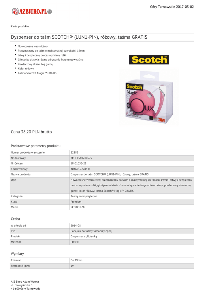 Góry Tarnowskie 2017-03-02 Karta produktu: Dyspenser do taśm SCOTCH® (LUN1-PIN), różowy, taśma GRATIS Nowoczesne wzornictwo Przeznaczony do taśm o maksymalnej szerokości 19mm łatwy i bezpieczny proces wymiany rolki Gilotynka ułatwia równe odrywanie fragmentów taśmy Powleczony aksamitną gumą Kolor różowy Taśma Scotch® Magic™ GRATIS Cena 38,20 PLN brutto Podstawowe parametry produktu Numer produktu w systemie 22285 Nr dostawcy 3M-FT510280579 Nr Celcen 18-01055-21 Kod kreskowy 4046719278541 Nazwa produktu Dyspenser do taśm SCOTCH® (LUN1-PIN), różowy, taśma GRATIS Opis Nowoczesne wzornictwo; przeznaczony do taśm o maksymalnej szerokości 19mm; łatwy i bezpieczny proces wymiany rolki; gilotynka ułatwia równe odrywanie fragmentów taśmy; powleczony aksamitną gumą; kolor różowy; taśma Scotch® Magic™ GRATIS Kategoria Taśmy samoprzylepne Klasa Premium Marka SCOTCH-3M Cecha W ofercie od 2014-08 Typ Podajnik do taśmy samoprzylepnej Produkt Dyspenser z gilotynką Materiał Plastik Wymiary Rozmiar Do 19mm Szerokość (mm) 19 A-Z Biuro Adam Watoła ul. Oświęcimska 3 41-600 Góry Tarnowskie Góry Tarnowskie 2017-03-02 Karta katalogowa produktu cd. Dyspenser do taśm SCOTCH® (LUN1-PIN), różowy, taśma GRATIS Grubość (mm) B.d. Wspólny słownik zamówień CPV 30192000-1 Wyroby biurowe Certyfikaty Nowy produkt w ofercie Standard Hit Standard Kolor Kolor Serdecznie zapraszamy do współpracy A-Z Biuro Adam Watoła zespół. A-Z Biuro Adam Watoła ul. Oświęcimska 3 41-600 Góry Tarnowskie Różowy