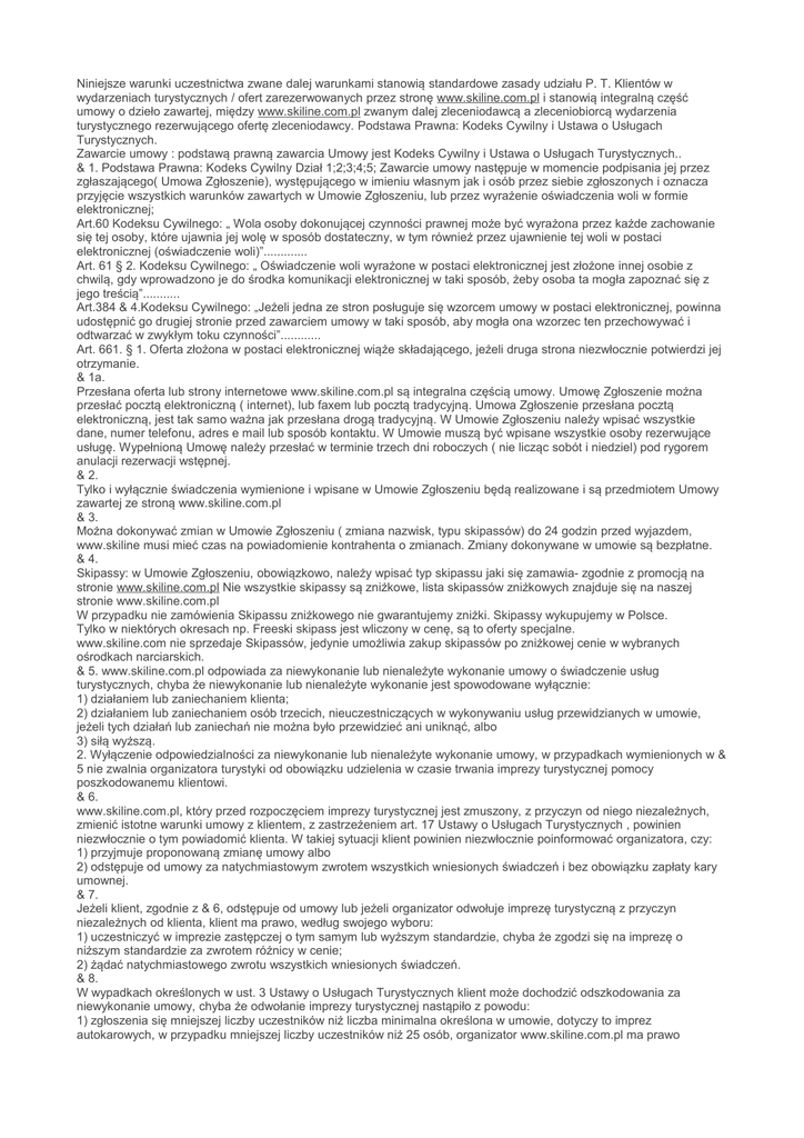 Niniejsze warunki uczestnictwa zwane dalej warunkami stanowią standardowe zasady udziału P. T. Klientów w wydarzeniach turystycznych / ofert zarezerwowanych przez stronę www.skiline.com.pl i stanowią integralną część umowy o dzieło zawartej, między www.skiline.com.pl zwanym dalej zleceniodawcą a zleceniobiorcą wydarzenia turystycznego rezerwującego ofertę zleceniodawcy. Podstawa Prawna: Kodeks Cywilny i Ustawa o Usługach Turystycznych. Zawarcie umowy : podstawą prawną zawarcia Umowy jest Kodeks Cywilny i Ustawa o Usługach Turystycznych.. & 1. Podstawa Prawna: Kodeks Cywilny Dział 1;2;3;4;5; Zawarcie umowy następuje w momencie podpisania jej przez zgłaszającego( Umowa Zgłoszenie), występującego w imieniu własnym jak i osób przez siebie zgłoszonych i oznacza przyjęcie wszystkich warunków zawartych w Umowie Zgłoszeniu, lub przez wyrażenie oświadczenia woli w formie elektronicznej; Art.60 Kodeksu Cywilnego: „ Wola osoby dokonującej czynności prawnej może być wyrażona przez każde zachowanie się tej osoby, które ujawnia jej wolę w sposób dostateczny, w tym również przez ujawnienie tej woli w postaci elektronicznej (oświadczenie woli)”............. Art. 61 § 2. Kodeksu Cywilnego: „ Oświadczenie woli wyrażone w postaci elektronicznej jest złożone innej osobie z chwilą, gdy wprowadzono je do środka komunikacji elektronicznej w taki sposób, żeby osoba ta mogła zapoznać się z jego treścią”........... Art.384 & 4.Kodeksu Cywilnego: „Jeżeli jedna ze stron posługuje się wzorcem umowy w postaci elektronicznej, powinna udostępnić go drugiej stronie przed zawarciem umowy w taki sposób, aby mogła ona wzorzec ten przechowywać i odtwarzać w zwykłym toku czynności”............ Art. 661. § 1. Oferta złożona w postaci elektronicznej wiąże składającego, jeżeli druga strona niezwłocznie potwierdzi jej otrzymanie. & 1a. Przesłana oferta lub strony internetowe www.skiline.com.pl są integralna częścią umowy. Umowę Zgłoszenie można przesłać pocztą elektroniczną ( internet), lub faxem lub pocztą tradycyjną. Umowa Zgłoszenie przesłana pocztą elektroniczną, jest tak samo ważna jak przesłana drogą tradycyjną. W Umowie Zgłoszeniu należy wpisać wszystkie dane, numer telefonu, adres e mail lub sposób kontaktu. W Umowie muszą być wpisane wszystkie osoby rezerwujące usługę. Wypełnioną Umowę należy przesłać w terminie trzech dni roboczych ( nie licząc sobót i niedziel) pod rygorem anulacji rezerwacji wstępnej. & 2. Tylko i wyłącznie świadczenia wymienione i wpisane w Umowie Zgłoszeniu będą realizowane i są przedmiotem Umowy zawartej ze stroną www.skiline.com.pl & 3. Można dokonywać zmian w Umowie Zgłoszeniu ( zmiana nazwisk, typu skipassów) do 24 godzin przed wyjazdem, www.skiline musi mieć czas na powiadomienie kontrahenta o zmianach. Zmiany dokonywane w umowie są bezpłatne. & 4. Skipassy: w Umowie Zgłoszeniu, obowiązkowo, należy wpisać typ skipassu jaki się zamawia- zgodnie z promocją na stronie www.skiline.com.pl Nie wszystkie skipassy są zniżkowe, lista skipassów zniżkowych znajduje się na naszej stronie www.skiline.com.pl W przypadku nie zamówienia Skipassu zniżkowego nie gwarantujemy zniżki. Skipassy wykupujemy w Polsce. Tylko w niektórych okresach np. Freeski skipass jest wliczony w cenę, są to oferty specjalne. www.skiline.com nie sprzedaje Skipassów, jedynie umożliwia zakup skipassów po zniżkowej cenie w wybranych ośrodkach narciarskich. & 5. www.skiline.com.pl odpowiada za niewykonanie lub nienależyte wykonanie umowy o świadczenie usług turystycznych, chyba że niewykonanie lub nienależyte wykonanie jest spowodowane wyłącznie: 1) działaniem lub zaniechaniem klienta; 2) działaniem lub zaniechaniem osób trzecich, nieuczestniczących w wykonywaniu usług przewidzianych w umowie, jeżeli tych działań lub zaniechań nie można było przewidzieć ani uniknąć, albo 3) siłą wyższą. 2. Wyłączenie odpowiedzialności za niewykonanie lub nienależyte wykonanie umowy, w przypadkach wymienionych w & 5 nie zwalnia organizatora turystyki od obowiązku udzielenia w czasie trwania imprezy turystycznej pomocy poszkodowanemu klientowi. & 6. www.skiline.com.pl, który przed rozpoczęciem imprezy turystycznej jest zmuszony, z przyczyn od niego niezależnych, zmienić istotne warunki umowy z klientem, z zastrzeżeniem art. 17 Ustawy o Usługach Turystycznych , powinien niezwłocznie o tym powiadomić klienta. W takiej sytuacji klient powinien niezwłocznie poinformować organizatora, czy: 1) przyjmuje proponowaną zmianę umowy albo 2) odstępuje od umowy za natychmiastowym zwrotem wszystkich wniesionych świadczeń i bez obowiązku zapłaty kary umownej. & 7. Jeżeli klient, zgodnie z & 6, odstępuje od umowy lub jeżeli organizator odwołuje imprezę turystyczną z przyczyn niezależnych od klienta, klient ma prawo, według swojego wyboru: 1) uczestniczyć w imprezie zastępczej o tym samym lub wyższym standardzie, chyba że zgodzi się na imprezę o niższym standardzie za zwrotem różnicy w cenie; 2) żądać natychmiastowego zwrotu wszystkich wniesionych świadczeń. & 8. W wypadkach określonych w ust. 3 Ustawy o Usługach Turystycznych klient może dochodzić odszkodowania za niewykonanie umowy, chyba że odwołanie imprezy turystycznej nastąpiło z powodu: 1) zgłoszenia się mniejszej liczby uczestników niż liczba minimalna określona w umowie, dotyczy to imprez autokarowych, w przypadku mniejszej liczby uczestników niż 25 osób, organizator www.skiline.com.pl ma prawo odwołać imprezę turystyczną, i jest zobowiązany do natychmiastowego powiadomienia uczestników, którzy już wykupili imprezę. 2) siły wyższej &9. Płatności , ceny, zaliczka i wpłata końcowa 1. Ceny świadczeń dla Klienta są cenami umownymi. Ceny są publikowane w PLN, www.skiline.com posiada jeden rachunek w Raiffeisen Polbank . Można płacić w Euro lub w 