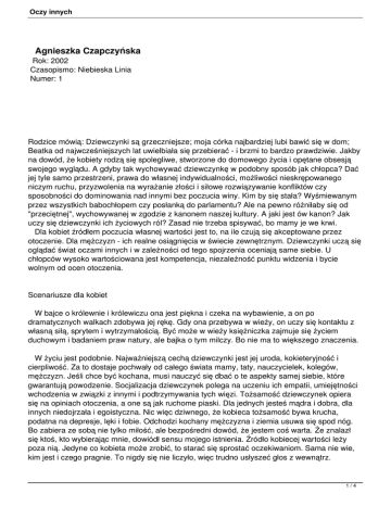 Oczy innych Agnieszka Czapczyńska Rok: 2002 Czasopismo: Niebieska Linia Numer: 1 Rodzice mówią: Dziewczynki są grzeczniejsze; moja córka najbardziej lubi bawić się w dom; Beatka od najwcześniejszych lat uwielbiała się przebierać - i brzmi to bardzo prawdziwie. Jakby na dowód, że kobiety rodzą się spolegliwe, stworzone do domowego życia i opętane obsesją swojego wyglądu. A gdyby tak wychowywać dziewczynkę w podobny sposób jak chłopca? Dać jej tyle samo przestrzeni, prawa do własnej indywidualności, możliwości nieskrępowanego niczym ruchu, przyzwolenia na wyrażanie złości i siłowe rozwiązywanie konfliktów czy sposobności do dominowania nad innymi bez poczucia winy. Kim by się stała? Wyśmiewanym przez wszystkich babochłopem czy posłanką do parlamentu? Ale na pewno różniłaby się od "przeciętnej", wychowywanej w zgodzie z kanonem naszej kultury. A jaki jest ów kanon? Jak uczy się dziewczynki ich życiowych ról? Zasad nie trzeba spisywać, bo mamy je we krwi. Dla kobiet źródłem poczucia własnej wartości jest to, na ile czują się akceptowane przez otoczenie. Dla mężczyzn - ich realne osiągnięcia w świecie zewnętrznym. Dziewczynki uczą się oglądać świat oczami innych i w zależności od tego spojrzenia oceniają same siebie. U chłopców wysoko wartościowana jest kompetencja, niezależność punktu widzenia i bycie wolnym od ocen otoczenia. Scenariusze dla kobiet W bajce o królewnie i królewiczu ona jest piękna i czeka na wybawienie, a on po dramatycznych walkach zdobywa jej rękę. Gdy ona przebywa w wieży, on uczy się kontaktu z własną siłą, sprytem i wytrzymałością. Być może w wieży księżniczka zajmuje się życiem duchowym i badaniem praw natury, ale bajka o tym milczy. Bo nie ma to większego znaczenia. W życiu jest podobnie. Najważniejszą cechą dziewczynki jest jej uroda, kokieteryjność i cierpliwość. Za to dostaje pochwały od całego świata mamy, taty, nauczycielek, kolegów, mężczyzn. Jeśli chce być kochana, musi nauczyć się dbać o te aspekty samej siebie, które gwarantują powodzenie. Socjalizacja dziewczynek polega na uczeniu ich empatii, umiejętności wchodzenia w związki z innymi i podtrzymywania tych więzi. Tożsamość dziewczynek opiera się na opiniach otoczenia, a one są jak ruchome piaski. Dla jednych jesteś mądra i dobra, dla innych niedojrzała i egoistyczna. Nic więc dziwnego, że kobieca tożsamość bywa krucha, podatna na depresje, lęki i fobie. Odchodzi kochany mężczyzna i ziemia usuwa się spod nóg. Bo zabiera ze sobą nie tylko miłość, ale bezpośredni dowód, że jestem coś warta. Że znalazł się ktoś, kto wybierając mnie, dowiódł sensu mojego istnienia. Źródło kobiecej wartości leży poza nią. Jedyne co kobieta może zrobić, to starać się sprostać oczekiwaniom. Sama nie wie, kim jest i czego pragnie. To nigdy się nie liczyło, więc trudno usłyszeć głos z wewnątrz. 1/4 Oczy innych Wiadomo za to, czego oczekują inni. Jak wcielić się w rolę dobrej córki, atrakcyjnej młodej kobiety, mądrej żony i matki, ambitnej kobiety pracującej? Scenariusze dla kobiet są z jednej strony dość jasno określone, a z drugiej wewnętrznie sprzeczne. To kolejne źródło kłopotów z tożsamością. Jak mam połączyć bycie godną rodzicielskiej miłości córką z byciem akceptowaną przez rówieśników młodą kobietą? Rodzina oczekuje uległości, skromności i wstrzemięźliwości. Rówieśnicy chcą natomiast dziewczyn swobodnych seksualnie, nie stroniących od alkoholu i niezależnych. Kim więc mam być? Czyją miłość wybrać? A może będę raz taka, raz taka? W kulturowym scenariuszu małżeństwa kobieta jest tą, na której spoczywa odpowiedzialność za dobre relacje z mężczyzną, porządek w domu, opiekę nad dziećmi. Jeśli potraktować te obowiązki na serio, zabierają kilkanaście godzin dziennie. Ale świat oczekuje jednocześnie kobiety aktywnej zawodowo. Tylko jak pogodzić te dwie role? Tu - łagodna, opiekuńcza, poświęcająca się. Tam - agresywna, twardo obstająca przy swoim. Schizofrenia. Sprzeczność kobiecych scenariuszy rodzi nieustanny stan frustracji. Kiedy źródłem decyzji nie jest własny, wewnętrzny głos, a drogowskazy ustawione przez innych, nie można rozwikłać tych sprzeczności bez ranienia siebie. Scenariusze dla mężczyzn Tożsamość mężczyzn opiera się na rzeczywistych kompetencjach i płynących z tego przekonaniach na swój temat. Wiedzą to już pięcioletni chłopcy. Poczucia kompetencji dostarczają zdobywane przez dziecko umiejętności. Na początku jest "sprawiedliwie" - zarówno chłopcy, jak i dziewczynki uczą się pierwszych kroków, pierwszych słów, posługiwania łyżeczką, robienia siusiu do nocnika. Potem uwaga dorosłych zaczyna się polaryzować. Chłopcy otrzymują komplementy za dobrze rozegrany mecz, jazdę na rowerze, szybko przepłynięty basen, zwycięstwo w podwórkowej waśni. Dziewczynki, które prawdopodobnie mogłyby pochwalić się tym samym, są nagradzane za to, że "ślicznie wyglądają w tej sukience", spokojnie bawią się z koleżankami, zgrabnie tańczą i umieją się wszystkim spodobać. Poczucie wartości oparte na tym, co potrafię zrobić, jest jednak dużo stabilniejsze i wytrzymalsze na razy zadawane przez los niż to zbudowane na własnym wyglądzie. Socjalizacja chłopców wspiera ich aktywność, indywidualizm, odcięcie od uczuć, które mogłyby przeszkadzać w "zdobywaniu" świata. Biologia... Na temat źródeł "relacyjności" toczą się zaciekłe spory zwolenników determinizmu biologicznego płci i zwolenników wpływu kultury. Pierwsi uważają, że mózg posiada swoją płeć - żeńską lub męską. Już rodząc się jako dziewczynki bądź chłopcy jesteśmy wyposażeni w inny potencjał zachowań. Niemowlęta płci żeńskiej mają, zdaniem badaczy, większą łatwość koncentrowania się na innych. Od pierwszych go
