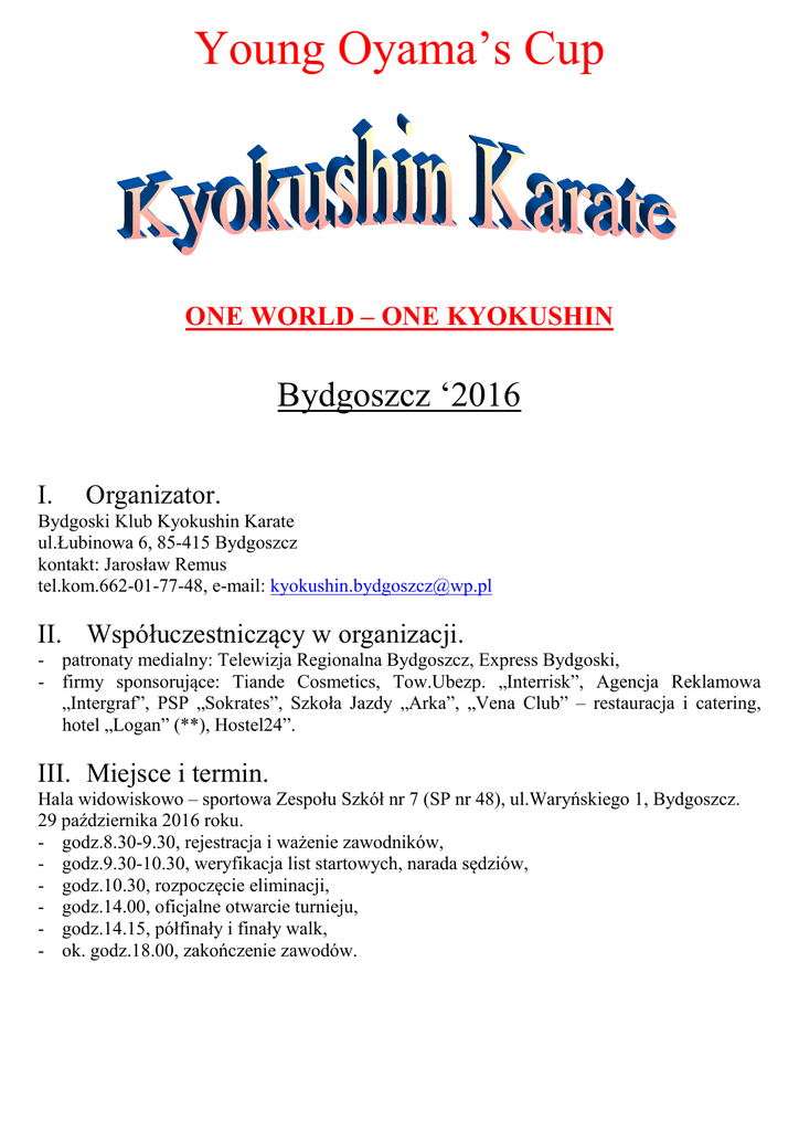 Young Oyama’s Cup ONE WORLD – ONE KYOKUSHIN Bydgoszcz ‘2016 I. Organizator. Bydgoski Klub Kyokushin Karate ul.Łubinowa 6, 85-415 Bydgoszcz kontakt: Jarosław Remus tel.kom.662-01-77-48, e-mail: [email protected] II. Współuczestniczący w organizacji. - patronaty medialny: Telewizja Regionalna Bydgoszcz, Express Bydgoski, - firmy sponsorujące: Tiande Cosmetics, Tow.Ubezp. „Interrisk”, Agencja Reklamowa „Intergraf”, PSP „Sokrates”, Szkoła Jazdy „Arka”, „Vena Club” – restauracja i catering, hotel „Logan” (**), Hostel24”. III. Miejsce i termin. Hala widowiskowo – sportowa Zespołu Szkół nr 7 (SP nr 48), ul.Waryńskiego 1, Bydgoszcz. 29 października 2016 roku. - godz.8.30-9.30, rejestracja i ważenie zawodników, - godz.9.30-10.30, weryfikacja list startowych, narada sędziów, - godz.10.30, rozpoczęcie eliminacji, - godz.14.00, oficjalne otwarcie turnieju, - godz.14.15, półfinały i finały walk, - ok. godz.18.00, zakończenie zawodów. IV. Konkurencje i kategorie. Rozegrane zostaną konkurencje kumite semi-kontakt w następujących kategoriach wiekowych: - chłopcy i dziewczęta (osobno) do lat 9, roczniki 2007 i młodsi, - chłopcy i dziewczęta (osobno) do lat 11 roczniki 2005-2006, - kadeci i kadetki, roczniki 2003-2004, - młodzicy i młodziczki, roczniki 2001-2002, - juniorzy i juniorki, roczniki 1999-2000. Kategorie wagowe: - dziewczęta do lat 9: -30 kg, +30 kg, - chłopcy do lat 9: -30 kg, -35 kg, +35 kg, - dziewczęta do lat 11: -35 kg, -40 kg, +40 kg, - chłopcy do lat 11: -35 kg, -45 kg, +45 kg, - kadetki: -40 kg, -45 kg, +45 kg, - kadeci: -45 kg, -55 kg, +55 kg, - młodziczki: -50 kg, +50 kg. - młodzicy: -55 kg, -65 kg, +65 kg, - juniorki: -60 kg, +60 kg, - juniorzy: -65 kg, -75 kg, +75 kg. UWAGA !!! O zakwalifikowaniu do kategorii wiekowej decyduje rok urodzenia. V. Regulamin rozgrywania zawodów. 1. Każdy z Klubów może wystawić w każdej z kategorii dowolną liczbę zawodników. 2. Konkurencje kumite semi-kontakt rozegrane zostaną systemem pucharowym. Przewidywane jest przyznanie dwóch „trzecich miejsc”. 3. Jeden zawodnik może startować tylko w jednej kategorii wiekowo-wagowej. 4. Warunkiem rozegrania każdej z kategorii jest zgłoszenie co najmniej 8 zawodników. W przypadku mniejszej liczby startujących Organizator zastrzega sobie prawo do nie rozegrania tej kategorii lub połączenia jej z innymi poprzez zmiany zakresu wagowego. Bazową do tych zmian będzie ilość zawodników zgłoszona w terminie do 25 października !!!!! 5. Klasyfikacja drużynowa jest ustalana na podstawie wyników indywidualnych wg zasady: I miejsce - 5 pkt., II miejsce – 3 pkt., III miejsce – 1 pkt. 6. Szczegółowy regulamin rozgrywania konkurencji opisany jest w „Załączniku nr 1” i stanowi integralną część komunikatu (w załączeniu). VI. Warunki uczestnictwa. Zawodnicy powinni posiadać: - dokument ze zdjęciem, potwierdzający datę urodzenia (data urodzenia oraz waga będą sprawdzane przed rozpoczęciem zawodów), - pisemną zgodę opiekuna prawnego – honorowane będzie tylko oświadczenie na oryginalnym druku (Załącznik nr 2). - kierownicy drużyn przedkładają Organizatorowi w/w zgody wraz z oświadczeniem o posiadaniu przez zawodników odpowiednich badań lekarskich. - czyste karate-gi z rzeczywiście posiadanym pasem, - ochraniacze wg zakresu opisanego w załączonym Regulaminie Turnieju. VII. Zgłoszenia, losowanie. Załączone karty uczestnictwa należy przesłać pocztą lub e-mailem do dnia 25 października !!!! Drabinki walk startujących zostaną rozlosowane przed południem 26 października. Losowania dokona komisja w składzie: - sensei Paweł Olszewski. 4 DAN, Lipno, - sensei Daniel Gorczyca, 3 DAN, Inowrocław. - sensei Jarosław Remus, 3 DAN, Bydgoszcz (organizator). Pełna lista startujących wraz z przydziałem do kategorii wiekowo-wagowych (wg wag zadeklarowanych na zgłoszeniach) zostanie opublikowana na stronie internetowej BKKK – www.karate.bydgoszcz.pl – najpóźniej 28 października. VIII. Pozostałe. 1. Opłata za start zawodnika wynosi: 40,- PLN. Opłatę (zawierającą koszt obiadu) należy wnosić w dniu zawodów przy potwierdzeniu listy startowej. 2. Istnieje możliwość rezerwacji noclegu pod warunkiem jego zgłoszenia najpóźniej w dniu 22 października. Szczegółowe informacje dotyczące kosztów i warunków bytowych rezerwowanych noclegów po kontakcie telefonicznym z Organizatorem. 3. Sędzią Głównym zawodów będzie shihan Krzysztof Dubiel (5 DAN, Gubin). 4. Każdy z Klubów proszony jest o wystawienie minimum jednego sędziego w pełnym stroju, co znacznie usprawni przebieg turnieju. 5. Nagrody: - Puchary, medale i imienne dyplomy za zajęcie miejsca na podium, - dyplomy uczestnictwa dla wszystkich startujących. 6. We wszystkich kwestiach sportowych wyżej nie opisanych decyduje Sędzia Główny zawodów. W kwestiach technicznych decyduje Organizator. Osu !