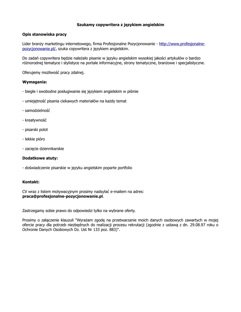 Szukamy copywritera z językiem angielskim Opis stanowiska pracy Lider branży marketingu internetowego, firma Profesjonalne Pozycjonowanie - http://www.profesjonalnepozycjonowanie.pl/, szuka copywritera z językiem angielskim. Do zadań copywritera będzie należało pisanie w języku angielskim wysokiej jakości artykułów o bardzo różnorodnej tematyce i stylistyce na portale informacyjne, strony tematyczne, branżowe i specjalistyczne. Oferujemy możliwość pracy zdalnej. Wymagania: - biegłe i swobodne posługiwanie się językiem angielskim w piśmie - umiejętność pisania ciekawych materiałów na każdy temat - samodzielność - kreatywność - pisarski polot - lekkie pióro - zacięcie dziennikarskie Dodatkowe atuty: - doświadczenie pisarskie w języku angielskim poparte portfolio Kontakt: CV wraz z listem motywacyjnym prosimy nadsyłać e-mailem na adres: [email protected]. Zastrzegamy sobie prawo do odpowiedzi tylko na wybrane oferty. Prosimy o załączenie klauzuli "Wyrażam zgodę na przetwarzanie moich danych osobowych zawartych w mojej ofercie pracy dla potrzeb niezbędnych do realizacji procesu rekrutacji (zgodnie z ustawą z dn. 29.08.97 roku o Ochronie Danych Osobowych Dz. Ust Nr 133 poz. 883)".