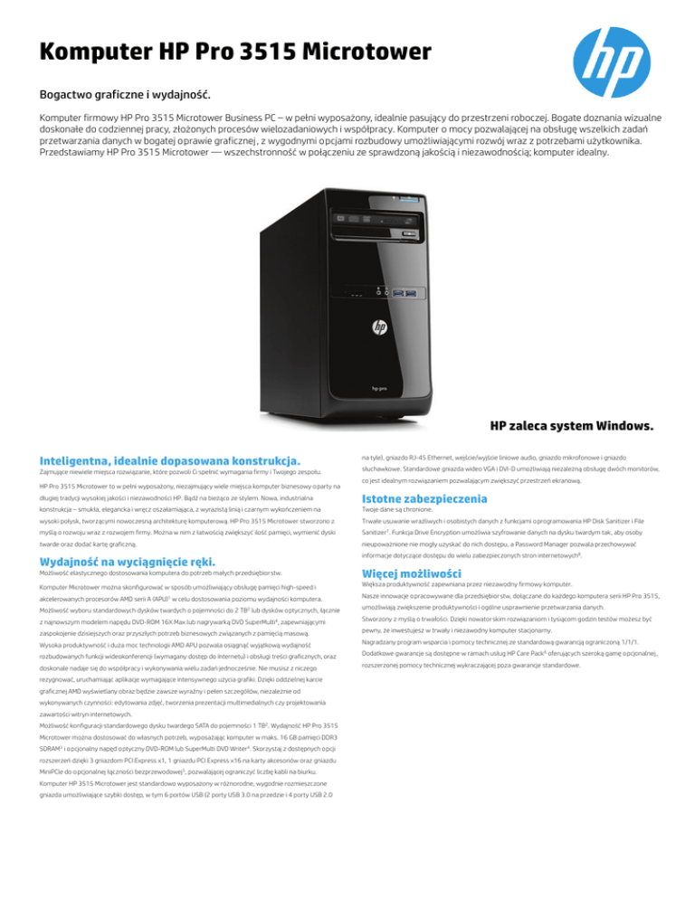 Komputer HP Pro 3515 Microtower Bogactwo graficzne i wydajność. Komputer firmowy HP Pro 3515 Microtower Business PC – w pełni wyposażony, idealnie pasujący do przestrzeni roboczej. Bogate doznania wizualne doskonałe do codziennej pracy, złożonych procesów wielozadaniowych i współpracy. Komputer o mocy pozwalającej na obsługę wszelkich zadań przetwarzania danych w bogatej oprawie graficznej, z wygodnymi opcjami rozbudowy umożliwiającymi rozwój wraz z potrzebami użytkownika. Przedstawiamy HP Pro 3515 Microtower — wszechstronność w połączeniu ze sprawdzoną jakością i niezawodnością; komputer idealny. HP zaleca system Windows. Inteligentna, idealnie dopasowana konstrukcja. Zajmujące niewiele miejsca rozwiązanie, które pozwoli Ci spełnić wymagania firmy i Twojego zespołu. HP Pro 3515 Microtower to w pełni wyposażony, niezajmujący wiele miejsca komputer biznesowy oparty na długiej tradycji wysokiej jakości i niezawodności HP. Bądź na bieżąco ze stylem. Nowa, industrialna konstrukcja – smukła, elegancka i wręcz oszałamiająca, z wyrazistą linią i czarnym wykończeniem na na tyle), gniazdo RJ-45 Ethernet, wejście/wyjście liniowe audio, gniazdo mikrofonowe i gniazdo słuchawkowe. Standardowe gniazda wideo VGA i DVI-D umożliwiają niezależną obsługę dwóch monitorów, co jest idealnym rozwiązaniem pozwalającym zwiększyć przestrzeń ekranową. Istotne zabezpieczenia Twoje dane są chronione. wysoki połysk, tworzącymi nowoczesną architekturę komputerową. HP Pro 3515 Microtower stworzono z Trwałe usuwanie wrażliwych i osobistych danych z funkcjami oprogramowania HP Disk Sanitizer i File myślą o rozwoju wraz z rozwojem firmy. Można w nim z łatwością zwiększyć ilość pamięci, wymienić dyski Sanitizer7. Funkcja Drive Encryption umożliwia szyfrowanie danych na dysku twardym tak, aby osoby twarde oraz dodać kartę graficzną. nieupoważnione nie mogły uzyskać do nich dostępu, a Password Manager pozwala przechowywać Wydajność na wyciągnięcie ręki. informacje dotyczące dostępu do wielu zabezpieczonych stron internetowych8. Komputer Microtower można skonfigurować w sposób umożliwiający obsługę pamięci high-speed i Większa produktywność zapewniana przez niezawodny firmowy komputer. akcelerowanych procesorów AMD serii A (APU)1 w celu dostosowania poziomu wydajności komputera. Nasze innowacje opracowywane dla przedsiębiorstw, dołączane do każdego komputera serii HP Pro 3515, Możliwość wyboru standardowych dysków twardych o pojemności do 2 TB2 lub dysków optycznych, łącznie umożliwiają zwiększenie produktywności i ogólne usprawnienie przetwarzania danych. Możliwość elastycznego dostosowania komputera do potrzeb małych przedsiębiorstw. z najnowszym modelem napędu DVD-ROM 16X Max lub nagrywarką DVD SuperMulti4, zapewniającymi Więcej możliwości Stworzony z myślą o trwałości. Dzięki nowatorskim rozwiązaniom i tysiącom godzin testów możesz być zaspokojenie dzisiejszych oraz przyszłych potrzeb biznesowych związanych z pamięcią masową. pewny, że inwestujesz w trwały i niezawodny komputer stacjonarny. Wysoka produktywność i duża moc technologii AMD APU pozwala osiągnąć wyjątkową wydajność Nagradzany program wsparcia i pomocy technicznej ze standardową gwarancją ograniczoną 1/1/1. rozbudowanych funkcji wideokonferencji (wymagany dostęp do Internetu) i obsługi treści graficznych, oraz Dodatkowe gwarancje są dostępne w ramach usług HP Care Pack6 oferujących szeroką gamę opcjonalnej, doskonale nadaje się do współpracy i wykonywania wielu zadań jednocześnie. Nie musisz z niczego rozszerzonej pomocy technicznej wykraczającej poza gwarancje standardowe. rezygnować, uruchamiając aplikacje wymagające intensywnego użycia grafiki. Dzięki oddzielnej karcie graficznej AMD wyświetlany obraz będzie zawsze wyraźny i pełen szczegółów, niezależnie od wykonywanych czynności: edytowania zdjęć, tworzenia prezentacji multimedialnych czy projektowania zawartości witryn internetowych. Możliwość konfiguracji standardowego dysku twardego SATA do pojemności 1 TB2. Wydajność HP Pro 3515 Microtower można dostosować do własnych potrzeb, wyposażając komputer w maks. 16 GB pamięci DDR3 SDRAM3 i opcjonalny napęd optyczny DVD-ROM lub SuperMulti DVD Writer4. Skorzystaj z dostępnych opcji rozszerzeń dzięki 3 gniazdom PCI Express x1, 1 gniazdu PCI Express x16 na karty akcesoriów oraz gniazdu MiniPCle do opcjonalnej łączności bezprzewodowej5, pozwalającej ograniczyć liczbę kabli na biurku. Komputer HP 3515 Microtower jest standardowo wyposażony w różnorodne, wygodnie rozmieszczone gniazda umożliwiające szybki dostęp, w tym 6 portów USB (2 porty USB 3.0 na przedzie i 4 porty USB 2.0 Komputer HP Pro 3515 Microtower HP zaleca system Windows. Obudowa Mikrowieża System operacyjny Windows 8 Pro 64 Windows 8 64 FreeDOS Procesor Czterordzeniowy układ AMD APU A10-5700 z układem graficznym Radeon HD 7660D (3,4 GHz, 4 MB pamięci podręcznej ); Dwurdzeniowy układ AMD APU A4-5300 z układem graficznym Radeon HD 7480D (3,4 GHz, 1 MB pamięci podręcznej); Dwurdzeniowy układ AMD APU A6-5400K z układem graficznym Radeon HD 7540D (3,6 GHz, 1 MB pamięci podręcznej); Czterordzeniowy układ AMD A8-5500B z układem graficznym Radeon HD 7560D (3,2 GHz, 4 MB pamięci podręcznej L2) Zestaw układów AMD A75 FCH Pamięć Maksymalnie 8 GB 1333 MHz DDR3 SDRAM Gniazda pamięci: 2 DIMM Wewnętrzna pamięć masowa 500 GB, maksymalnie 2 TB, SATA (7200 obr./min) Nośniki wyjmowalne Napęd SuperMulti DVD+/-RW SATA; Napęd SATA DVD-ROM Grafika Karta graficzna NNVIDIA GeForce GT 620 1 GB DDR3 FH PCIe x16; Karta graficzna NNVIDIA GeForce GT 630 2 GB DDR3 FH PCIe x16 Karta dźwiękowa Karta dźwiękowa Realtek ALC656; Zestaw słuchawkowy Business Komunikacja Kontroler Realtek RTL8171E Gigabit Ethernet (w standardzie); Karta sieciowa 802.11b/g/n PCIe x1; Kart