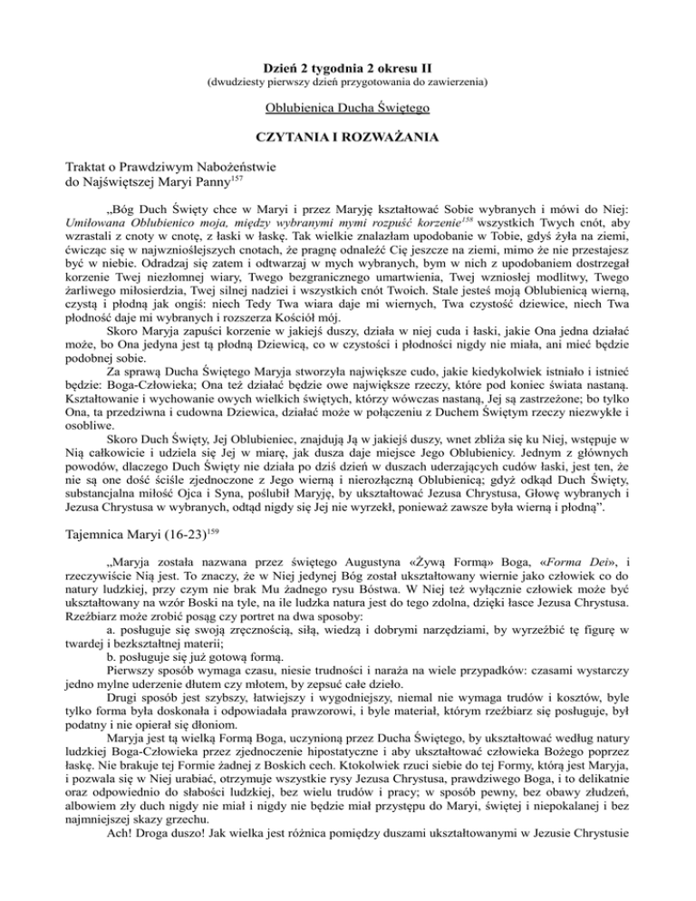 Dzień 2 tygodnia 2 okresu II (dwudziesty pierwszy dzień przygotowania do zawierzenia) Oblubienica Ducha Świętego CZYTANIA I ROZWAŻANIA Traktat o Prawdziwym Nabożeństwie do Najświętszej Maryi Panny157 „Bóg Duch Święty chce w Maryi i przez Maryję kształtować Sobie wybranych i mówi do Niej: Umiłowana Oblubienico moja, między wybranymi mymi rozpuść korzenie 158 wszystkich Twych cnót, aby wzrastali z cnoty w cnotę, z łaski w łaskę. Tak wielkie znalazłam upodobanie w Tobie, gdyś żyła na ziemi, ćwicząc się w najwznioślejszych cnotach, że pragnę odnaleźć Cię jeszcze na ziemi, mimo że nie przestajesz być w niebie. Odradzaj się zatem i odtwarzaj w mych wybranych, bym w nich z upodobaniem dostrzegał korzenie Twej niezłomnej wiary, Twego bezgranicznego umartwienia, Twej wzniosłej modlitwy, Twego żarliwego miłosierdzia, Twej silnej nadziei i wszystkich cnót Twoich. Stale jesteś moją Oblubienicą wierną, czystą i płodną jak ongiś: niech Tedy Twa wiara daje mi wiernych, Twa czystość dziewice, niech Twa płodność daje mi wybranych i rozszerza Kościół mój. Skoro Maryja zapuści korzenie w jakiejś duszy, działa w niej cuda i łaski, jakie Ona jedna działać może, bo Ona jedyna jest tą płodną Dziewicą, co w czystości i płodności nigdy nie miała, ani mieć będzie podobnej sobie. Za sprawą Ducha Świętego Maryja stworzyła największe cudo, jakie kiedykolwiek istniało i istnieć będzie: Boga-Człowieka; Ona też działać będzie owe największe rzeczy, które pod koniec świata nastaną. Kształtowanie i wychowanie owych wielkich świętych, którzy wówczas nastaną, Jej są zastrzeżone; bo tylko Ona, ta przedziwna i cudowna Dziewica, działać może w połączeniu z Duchem Świętym rzeczy niezwykłe i osobliwe. Skoro Duch Święty, Jej Oblubieniec, znajdują Ją w jakiejś duszy, wnet zbliża się ku Niej, wstępuje w Nią całkowicie i udziela się Jej w miarę, jak dusza daje miejsce Jego Oblubienicy. Jednym z głównych powodów, dlaczego Duch Święty nie działa po dziś dzień w duszach uderzających cudów łaski, jest ten, że nie są one dość ściśle zjednoczone z Jego wierną i nierozłączną Oblubienicą; gdyż odkąd Duch Święty, substancjalna miłość Ojca i Syna, poślubił Maryję, by ukształtować Jezusa Chrystusa, Głowę wybranych i Jezusa Chrystusa w wybranych, odtąd nigdy się Jej nie wyrzekł, ponieważ zawsze była wierną i płodną”. Tajemnica Maryi (16-23)159 „Maryja została nazwana przez świętego Augustyna «Żywą Formą» Boga, «Forma Dei», i rzeczywiście Nią jest. To znaczy, że w Niej jedynej Bóg został ukształtowany wiernie jako człowiek co do natury ludzkiej, przy czym nie brak Mu żadnego rysu Bóstwa. W Niej też wyłącznie człowiek może być ukształtowany na wzór Boski na tyle, na ile ludzka natura jest do tego zdolna, dzięki łasce Jezusa Chrystusa. Rzeźbiarz może zrobić posąg czy portret na dwa sposoby: a. posługuje się swoją zręcznością, siłą, wiedzą i dobrymi narzędziami, by wyrzeźbić tę figurę w twardej i bezkształtnej materii; b. posługuje się już gotową formą. Pierwszy sposób wymaga czasu, niesie trudności i naraża na wiele przypadków: czasami wystarczy jedno mylne uderzenie dłutem czy młotem, by zepsuć całe dzieło. Drugi sposób jest szybszy, łatwiejszy i wygodniejszy, niemal nie wymaga trudów i kosztów, byle tylko forma była doskonała i odpowiadała prawzorowi, i byle materiał, którym rzeźbiarz się posługuje, był podatny i nie opierał się dłoniom. Maryja jest tą wielką Formą Boga, uczynioną przez Ducha Świętego, by ukształtować według natury ludzkiej Boga-Człowieka przez zjednoczenie hipostatyczne i aby ukształtować człowieka Bożego poprzez łaskę. Nie brakuje tej Formie żadnej z Boskich cech. Ktokolwiek rzuci siebie do tej Formy, którą jest Maryja, i pozwala się w Niej urabiać, otrzymuje wszystkie rysy Jezusa Chrystusa, prawdziwego Boga, i to delikatnie oraz odpowiednio do słabości ludzkiej, bez wielu trudów i pracy; w sposób pewny, bez obawy złudzeń, albowiem zły duch nigdy nie miał i nigdy nie będzie miał przystępu do Maryi, świętej i niepokalanej i bez najmniejszej skazy grzechu. Ach! Droga duszo! Jak wielka jest różnica pomiędzy duszami ukształtowanymi w Jezusie Chrystusie zwyczajnie, jako ci, co zawierzają jedynie własnej wiedzy i opierają się na własnym doświadczeniu, a duszą podatną i uległą, która nie szukając oparcia w sobie samej, rzuca się w ramiona Maryi i poddaje się działaniu Ducha Świętego! Ile to zmaz, błędu, ciemności, ile złudzeń, ile ludzkiego naturalizmu w duszy pierwszej, a ile czystości, boskości i podobieństwa do Jezusa Chrystusa w drugiej! Nie ma i nigdy nie będzie stworzenia, w którym Bóg jaśniałby wspanialej aniżeli w Najświętszej Maryi Dziewicy, nie wyłączając ani błogosławionych, ani cherubinów, ani nawet najwznioślejszych serafinów Nieba. Maryja jest «rajem» Boga, Jego niewysłowionym światem, do którego zstąpił Syn Boży, ażeby działać w nim cuda, strzec go i mieć w nim swe upodobanie. Bóg stworzył świat dla człowieka, który pielgrzymuje, właśnie ten nasz świat, i stworzył świat dla człowieka błogosławionego – jest tym światem Niebo. Ale Bóg uczynił też inny jeszcze świat, świat dla Siebie, i dał mu imię Maryja: Świat niemal nieznany śmiertelnikom na ziemi, niepojęty dla aniołów i świętych w Niebie, którzy wielbiąc Boga tak wzniosłego i wyższego nad wszystko stworzenie, a ukrytego w swoim „świecie” - w Matce Bożej, Maryi, dniem i nocą wołają: Święty, Święty, Święty. Szczęśliwa, po tysiąckroć szczęśliwa jest ta dusza na ziemi, której Duch Święty wyjawia Tajemnicę Maryi; i której otwiera ów zamknięty Ogród, by dusza doń weszła; ten zapieczętowany Zdrój, by z niego czerpała i piła żywe wody łaski do obfitości! Dusza owa 