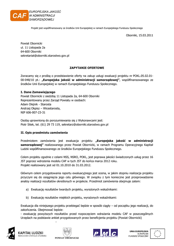 Projekt jest współfinansowany ze środków Unii Europejskiej w ramach Europejskiego Funduszu Społecznego Oborniki, 15.03.2011 Powiat Obornicki ul. 11 Listopada 2a 64-600 Oborniki [email protected] ZAPYTANIE OFERTOWE Zwracamy się z prośbą o przedstawienie oferty na zakup usługi ewaluacji projektu nr POKL.05.02.0100-048/10 pt.: „Europejska jakość w administracji samorządowej”, współfinansowanego ze środków Unii Europejskiej w ramach Europejskiego Funduszu Społecznego. I. Dane Zamawiającego Powiat Obornicki z siedzibą 11 Listopada 2a, 64-600 Oborniki Reprezentowany przez Zarząd Powiatu w osobach: Adam Olejnik - Starosta Andrzej Okpisz – Wicestarosta, NIP 606-007-23-31 Osobą uprawnioną do porozumiewania się z Wykonawcami jest: Piotr Sitek, tel. (61) 29 73 119, [email protected] II. Opis przedmiotu zamówienia Przedmiotem zamówienia jest ewaluacja projektu „Europejska jakość w administracji samorządowej” realizowanego przez Powiat Obornicki, w ramach Programu Operacyjnego Kapitał Ludzki współfinansowanego ze środków Europejskiego Funduszu Społecznego. Celem projektu zgodnie z celami NSS, NSRO, POKL, jest poprawa jakości świadczonych usług przez 16 JST poprzez wdrożenia modelu CAF w tych JST do końca marca 2012 roku. Projekt realizowany jest od 01.10.2010 do 31.03.2012. Głównym celem przygotowania raportu ewaluacyjnego jest ocena, w jakim stopniu realizacja projektu przyczyni się do osiągnięcia jego celu głównego. W związku z tym konieczne jest przeprowadzenie analizy realizacji rezultatów określonych w projekcie. Przedmiot zamówienia obejmuje zatem: a) Ewaluację rezultatów twardych projektu, wyrażonych wskaźnikami: b) Ewaluację rezultatów miękkich projektu, wyrażonych wskaźnikami: Ewaluacja dla niniejszego projektu przebiegać będzie w sposób ciągły – od początku jego realizacji, do zakończenia. Obejmować będzie: - ewaluację powyższych rezultatów przed rozpoczęciem wdrażania modelu CAF w poszczególnych Urzędach na podstawie ankiet przygotowanych przez beneficjenta projektu (Powiat Obornicki) - POWIAT OBORNICKI Projekt jest współfinansowany ze środków Unii Europejskiej w ramach Europejskiego Funduszu Społecznego - ewaluację powyższych rezultatów w okresie 2 m-cy po wdrożeniu modelu CAF w poszczególnych Urzędach, oraz na zakończenie i podsumowanie projektu (II – III 2012 rok) – na podstawie dokumentacji powdrożeniowej i ankiet przygotowanych przez beneficjenta projektu (Powiat Obornicki) - ewaluację jakości realizowanych działań: konsultacji, szkoleń, warsztatów – na podstawie ankiet przygotowanych przez beneficjenta projektu (powiat Obornicki) Po zakończeniu ewaluacji powinien powstać raport ewaluacyjny składający się z dwóch części: stan początkowy (raport otwarcia) oraz ewaluacja końcowa ex post (skuteczność działań w projekcie w odniesieniu do realizacji wszystkich założonych celów, a także badanie jakości zrealizowanych w ramach projektu zadań). Proces ewaluacji należy przeprowadzić wg kryteriów: trafności, efektywności, skuteczności oddziaływania, trwałości efektów - dobranych działań w stosunku do określonych w projekcie celów. III. Miejsce i termin składania ofert, harmonogram wyboru oferty Termin składania ofert upływa 22.03.2011 o godz. 12:00. Decydujące znaczenie dla oceny zachowania powyższego terminu ma data i godzina wpływu oferty do Zamawiającego w postaci wypełnionych załączników do niniejszego zapytania ofertowego (wersja elektroniczna wysłana do Państwa mailową z adresu: [email protected] w dniu 15.03.2011). Oferty można składać osobiście w siedzibie firmy, pocztą, faksem lub mailowo. W dniu 22.03.2011 do godz. 16.00, na podstawie kryterium wyboru oferty, zostaną wyłonieni oferenci. 25.03.2010 zostaną podpisane umowy z wybranymi oferentami. IV. Warunki udziału w postępowaniu O udzielenie zamówienia mogą ubiegać się Wykonawcy, którzy: 1. Posiadają uprawnienia do wykonywania określonej działalności lub czynności, jeżeli ustawy nakładają obowiązek posiadania takich uprawnień. 2. Nie zalegają z opłacaniem podatków, opłat oraz składek na ubezpieczenie zdrowotne i społeczne, chyba że uzyskali przewidziane prawem zwolnienie, odroczenie lub rozłożenie na raty zaległych płatności lub wstrzymanie w całości wykonania decyzji właściwego organu. 3. Znajdują się w sytuacji ekonomicznej i finansowej zapewniającej wykonanie zamówienia. Przesłanie oferty w odpowiedzi na niniejsze zapytanie ofertowe jest jednoznaczne ze złożeniem oświadczenia, że oferent spełnia powyższe kryteria. 4. Posiadają niezbędną wiedzę i doświadczenie oraz dysponują potencjałem technicznym i osobami zdolnymi do wykonania zamówienia, lub przedstawią pisemne zobowiązanie innych podmiotów do udostępnienia potencjału technicznego i osób zdolnych do wykonania zamówienia, którzy będą ich podwykonawcami za zgodą Zamawiającego. 5. Nie podlegają wykluczeniu z postępowania o udzielenie zamówienia V. Opis kryteriów i sposobu oceny ofert Kryterium oceny ofert jest cena (wartość netto) – 100% VI. Termin wykonania zamówienia POWIAT OBORNICKI Projekt jest współfinansowany ze środków Unii Europejskiej w ramach Europejskiego Funduszu Społecznego Ewaluacja projektu przebiegać będzie w sposób ciągły, w związku z czym obejmuje cały okres realizacji projektu. VII. Sposób składania ofert, porozumienia się z wykonawcami oraz przekazywania oświadczeń i dokumentów Ofertę należy złożyć na Formularzu oferty – załącznik nr 1 wraz z podpisanym Oświadczeniem wykonawcy – załącznik nr 2. Zgłoszona oferta musi zawierać: - cenę netto za wykonanie ewaluacji, - opis sposobu prezentacji danych i wyników badania oraz opisu sposobu opracowania raportów początkowych i raportu końcowego (poewaluacyjnego), - informacje dotyczące wykonanych prac z podobnego zakresu. Wszelkiego rodzaju oświ