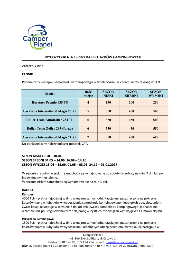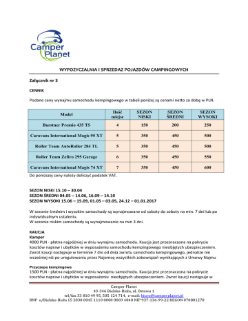 WYPOZYCZALNIA I SPRZEDAZ POJAZDÓW CAMPINGOWYCH Załącznik nr 3 CENNIK Podane ceny wynajmu samochodu kempingowego w tabeli poniżej są cenami netto za dobę w PLN. Model Ilość miejsc SEZON NISKI SEZON ŚREDNI SEZON WYSOKI Burstner Premio 435 TS 4 150 200 250 Caravans International Magis 95 XT 5 350 450 500 Roller Team AutoRoller 284 TL 5 350 450 500 Roller Team Zefiro 295 Garage 6 350 450 550 Caravans International Magis 74 XT 7 350 450 600 Do poniższej ceny należy doliczyć podatek VAT. SEZON NISKI 15.10 – 30.04 SEZON ŚREDNI 04.05 – 14.06, 16.09 – 14.10 SEZON WYSOKI 15.06 – 15.09, 01.05 – 03.05, 24.12 – 01.01.2017 W sezonie średnim i wysokim samochody są wynajmowane od soboty do soboty na min. 7 dni lub po indywidualnym ustaleniu. W sezonie niskim samochody są wynajmowanie na min 3 dni. KAUCJA Kamper 4000 PLN - płatna najpóźniej w dniu wynajmu samochodu. Kaucja jest przeznaczona na pokrycie kosztów napraw i ubytków w wyposażeniu samochodu kempingowego nieobjętych ubezpieczeniem. Zwrot kaucji następuje w terminie 7 dni od dnia zwrotu samochodu kempingowego, jednakże nie wcześniej niż po uregulowaniu przez Najemcę wszystkich zobowiązań wynikających z Umowy Najmu Przyczepa kempingowa 1500 PLN - płatna najpóźniej w dniu wynajmu samochodu. Kaucja jest przeznaczona na pokrycie kosztów napraw i ubytków w wyposażeniu nieobjętych ubezpieczeniem. Zwrot kaucji następuje w Camper Planet 43-346 Bielsko-Biała, ul. Ostowa 1 tel/fax 33 810 49 95, 505 124 714, e-mail: [email protected] BNP o/Bielsko-Biała 15 2030 0045 1110 0000 0069 4840 NIP 937-136-99-22 REGON 070801270 terminie 7 dni od dnia zwrotu samochodu kempingowego, jednakże nie wcześniej niż po uregulowaniu przez Najemcę wszystkich zobowiązań wynikających z Umowy Najmu OPŁATA SERWISOWA * 300 PLN – przy wynajmie do 14 dni Brak - przy wynajmie powyżej 14 dni OPŁATY W PRZYPADKU NIEDOTRZYMANIA WARUNKÓW UMOWY. • koszty sprzątania wewnątrz samochodu - min 150PLN • mycie pojazdu na zewnątrz – 100 PLN. • częściowe lub całkowite czyszczenie toalety – 500 PLN • nie zwrócenie samochodu o ustalonej w umowie godzinie – 100 PLN za każdą rozpoczętą godzinę przekroczenia • odbiór/wydanie samochodu w niedzielę – 150 PLN * Opłata serwisowa obejmuje: · mycie zewnętrzne · wszystkie niezbędne przyłącza (wąż do napełniania zbiornika czystej wody, kabel elektryczny 230V z przejściówką) · napełnienie zbiornika czystą wodą · opróżnienie zbiornika z brudną wodą · uzupełnienie płynów eksploatacyjnych · napełnienie butli gazem · płyn i papier toaletowy do toalety chemicznej · szkolenie z zakresu eksploatacji pojazdu Camper Planet 43-346 Bielsko-Biała, ul. Ostowa 1 tel/fax 33 810 49 95, 505 124 714, e-mail: [email protected] BNP o/Bielsko-Biała 15 2030 0045 1110 0000 0069 4840 NIP 937-136-99-22 REGON 070801270 OPŁATY DODATKOWE: Odpłatne opcje wyposażenia i usług dodatkowych dowóz campera do Klienta dodatkowa butla z gazem dodatkowa butelka płynu THETFORD do toalety chemicznej papier toaletowy do toalety chemicznej wypożyczenie zestawu turystycznego (stół + 4 krzesła) wypożyczenie wyposażenia kuchennego (garnki, szklanki, sztućce) uzupełnienie zbiornika paliwa wypożyczenie nawigacji z mapą całej Europy wypożyczenie sprzętu AGD zniszczenie tapicerki na łóżkach lub fotelach parking strzeżony samochodu osobowego ceny netto 2 PLN/km (liczone w obydwie strony) 60 pln 60 pln 4 pln/rolka 200 pln 150 pln 6 pln/litr 50 pln na tydzień 60 pln na tydzień 1500 pln GRATIS Camper Planet 43-346 Bielsko-Biała, ul. Ostowa 1 tel/fax 33 810 49 95, 505 124 714, e-mail: [email protected] BNP o/Bielsko-Biała 15 2030 0045 1110 0000 0069 4840 NIP 937-136-99-22 REGON 070801270