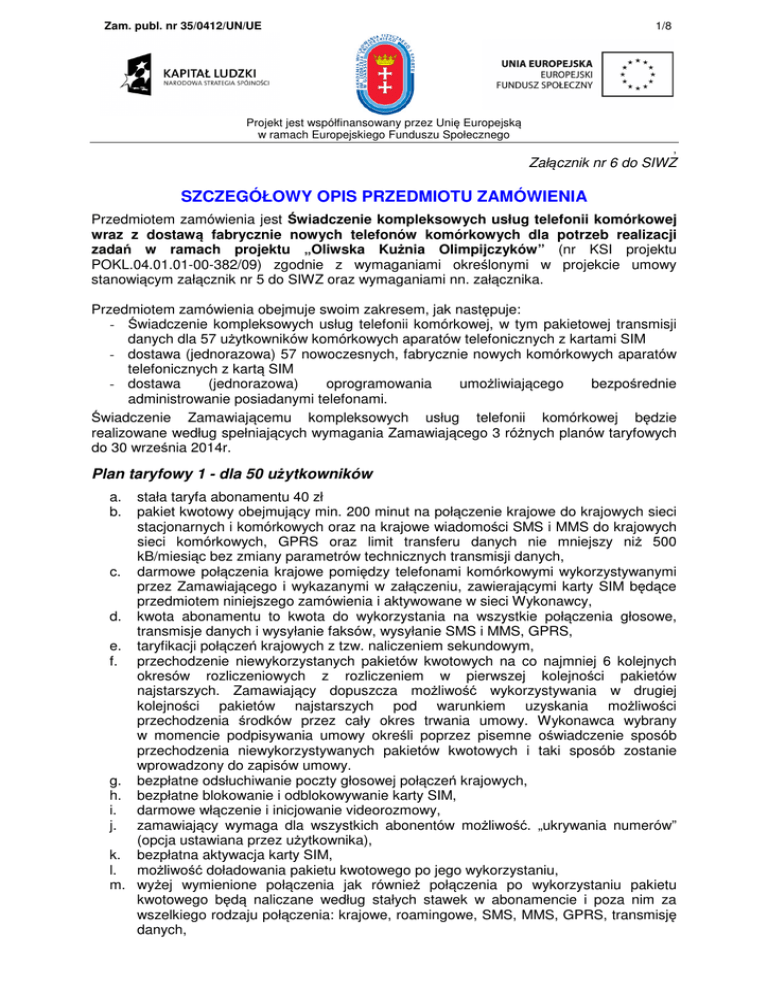 Zam. publ. nr 35/0412/UN/UE 1/8 Projekt jest współfinansowany przez Unię Europejską w ramach Europejskiego Funduszu Społecznego , Załącznik nr 6 do SIWZ SZCZEGÓŁOWY OPIS PRZEDMIOTU ZAMÓWIENIA Przedmiotem zamówienia jest Świadczenie kompleksowych usług telefonii komórkowej wraz z dostawą fabrycznie nowych telefonów komórkowych dla potrzeb realizacji zadań w ramach projektu „Oliwska Kużnia Olimpijczyków” (nr KSI projektu POKL.04.01.01-00-382/09) zgodnie z wymaganiami określonymi w projekcie umowy stanowiącym załącznik nr 5 do SIWZ oraz wymaganiami nn. załącznika. Przedmiotem zamówienia obejmuje swoim zakresem, jak następuje: - Świadczenie kompleksowych usług telefonii komórkowej, w tym pakietowej transmisji danych dla 57 użytkowników komórkowych aparatów telefonicznych z kartami SIM - dostawa (jednorazowa) 57 nowoczesnych, fabrycznie nowych komórkowych aparatów telefonicznych z kartą SIM - dostawa (jednorazowa) oprogramowania umożliwiającego bezpośrednie administrowanie posiadanymi telefonami. Świadczenie Zamawiającemu kompleksowych usług telefonii komórkowej będzie realizowane według spełniających wymagania Zamawiającego 3 różnych planów taryfowych do 30 września 2014r. Plan taryfowy 1 - dla 50 użytkowników a. b. stała taryfa abonamentu 40 zł pakiet kwotowy obejmujący min. 200 minut na połączenie krajowe do krajowych sieci stacjonarnych i komórkowych oraz na krajowe wiadomości SMS i MMS do krajowych sieci komórkowych, GPRS oraz limit transferu danych nie mniejszy niż 500 kB/miesiąc bez zmiany parametrów technicznych transmisji danych, c. darmowe połączenia krajowe pomiędzy telefonami komórkowymi wykorzystywanymi przez Zamawiającego i wykazanymi w załączeniu, zawierającymi karty SIM będące przedmiotem niniejszego zamówienia i aktywowane w sieci Wykonawcy, d. kwota abonamentu to kwota do wykorzystania na wszystkie połączenia głosowe, transmisje danych i wysyłanie faksów, wysyłanie SMS i MMS, GPRS, e. taryfikacji połączeń krajowych z tzw. naliczeniem sekundowym, f. przechodzenie niewykorzystanych pakietów kwotowych na co najmniej 6 kolejnych okresów rozliczeniowych z rozliczeniem w pierwszej kolejności pakietów najstarszych. Zamawiający dopuszcza możliwość wykorzystywania w drugiej kolejności pakietów najstarszych pod warunkiem uzyskania możliwości przechodzenia środków przez cały okres trwania umowy. Wykonawca wybrany w momencie podpisywania umowy określi poprzez pisemne oświadczenie sposób przechodzenia niewykorzystywanych pakietów kwotowych i taki sposób zostanie wprowadzony do zapisów umowy. g. bezpłatne odsłuchiwanie poczty głosowej połączeń krajowych, h. bezpłatne blokowanie i odblokowywanie karty SIM, i. darmowe włączenie i inicjowanie videorozmowy, j. zamawiający wymaga dla wszystkich abonentów możliwość. „ukrywania numerów” (opcja ustawiana przez użytkownika), k. bezpłatna aktywacja karty SIM, l. możliwość doładowania pakietu kwotowego po jego wykorzystaniu, m. wyżej wymienione połączenia jak również połączenia po wykorzystaniu pakietu kwotowego będą naliczane według stałych stawek w abonamencie i poza nim za wszelkiego rodzaju połączenia: krajowe, roamingowe, SMS, MMS, GPRS, transmisję danych, Zam. publ. nr 35/0412/UN/UE 2/8 Projekt jest współfinansowany przez Unię Europejską w ramach Europejskiego Funduszu Społecznego , Plan taryfowy 2 - dla 1 użytkownika a. b. stała taryfa abonamentu 100 zł pakiet kwotowy obejmujący min. 480 minut na połączenie krajowe do krajowych sieci stacjonarnych i komórkowych oraz na krajowe wiadomości SMS i MMS do krajowych sieci komórkowych, GPRS, oraz limit transferu danych nie mniejszy niż 2 GB/miesiąc bez zmiany parametrów technicznych transmisji danych, c. darmowe połączenia krajowe pomiędzy telefonami komórkowymi wykorzystywanymi przez Zamawiającego oraz min. 2000 min. na połączenia głosowe z numerami użytkowanymi przez Zamawiającego i wykazanymi w załączeniu, zawierającymi karty SIM będące przedmiotem niniejszego zamówienia i aktywowane w sieci Wykonawcy, d. kwota abonamentu to kwota do wykorzystania na wszystkie połączenia głosowe, transmisje danych i wysyłanie faksów, wysyłanie SMS i MMS, GPRS, e. taryfikacji połączeń krajowych z tzw. naliczeniem sekundowym, f. przechodzenie niewykorzystanych pakietów kwotowych, na co najmniej 6 kolejnych okresów rozliczeniowych z rozliczeniem w pierwszej kolejności pakietów najstarszych. Zamawiający dopuszcza możliwość wykorzystywania w drugiej kolejności pakietów najstarszych pod warunkiem uzyskania możliwości przechodzenia środków przez cały okres trwania umowy. Wykonawca wybrany w momencie podpisywania umowy określi poprzez pisemne oświadczenie sposób przechodzenia niewykorzystywanych pakietów kwotowych i taki sposób zostanie wprowadzony do zapisów umowy. g. bezpłatne odsłuchiwanie poczty głosowej połączeń krajowych, h. bezpłatne blokowanie i odblokowywanie karty SIM, i. darmowe włączenie i inicjowanie videorozmowy, j. zamawiający wymaga dla wszystkich abonentów możliwość. „ukrywania numerów”, (opcja ustawiana przez użytkownika), k. bezpłatna aktywacja karty SIM, l. możliwość doładowania pakietu kwotowego po jego wykorzystaniu, m. wyżej wymienione połączenia jak również połączenia po wykorzystaniu pakietu kwotowego będą naliczane według stałych stawek w abonamencie i poza nim za wszelkiego rodzaju połączenia: krajowe, roamingowe, SMS, MMS, GPRS, transmisję danych, Plan taryfowy 3 – dla 6 użytkowników a. stała taryfa abonamentu 200 zł b. pakiet kwotowy obejmujący min. 1000 minut na połączenie krajowe do krajowych sieci stacjonarnych i komórkowych oraz krajowe wiadomości SMS i MMS do krajowych sieci komórkowych, GPRS, oraz limit transferu danych nie mniejszy niż 2 GB/miesiąc bez zmiany parametrów technicznych transmisji danych, c. darmowe połączen
