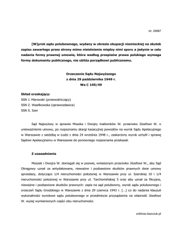 id: 20087 [W]yrok sądu polubownego, wydany w okresie okupacji niemieckiej na skutek zapisu zawartego przez strony mimo nieistnienia między nimi sporu a jedynie w celu nadania formy prawnej umowie, która według przepisów prawa polskiego wymaga formy dokumentu publicznego, nie ubliŜa porządkowi publicznemu. Orzeczenie Sądu NajwyŜszego z dnia 29 października 1949 r. Wa C 105/49 Skład orzekający: SSN J. Marowski (przewodniczący) SSN Z. Wasilkowska (sprawozdawca) SSN S. Szer Sąd NajwyŜszy w sprawie Moszka i Dwojry małŜonków W. przeciwko Józefowi W. o uniewaŜnienie umowy, po rozpoznaniu skargi kasacyjnej powodów na wyrok Sądu Apelacyjnego w Warszawie z siedzibą w Łodzi z dnia 24 września 1948 r., zaskarŜony wyrok uchylił i sprawę Sądowi Apelacyjnemu w Warszawie do ponownego rozpoznania przekazał. Z uzasadnienia Moszek i Dwojra W. domagali się w pozwie, wniesionym przeciwko Józefowi W., aby Sąd Okręgowy uznał za antydatowane, niewaŜne i pozbawione skutków prawnych dwie umowy sprzedaŜy, dotyczące 1/4 nieruchomości połoŜonej w Warszawie przy ul. Szerokiej 10 i 1/4 nieruchomości połoŜonej w Warszawie przy ul. Tarchomińskiej 5 oraz aby uznał za fikcyjne, niewaŜne i pozbawione skutków prawnych: zapis na sąd polubowny, wyrok sądu polubownego i orzeczeń Sądu Grodzkiego w Warszawie z dnia 29 czerwca 1943 r. […] co do nadania klauzuli wykonalności wyrokowi sądu polubownego w przedmiocie przysądzenia na własność Józefowi W. wyŜej wymienionych części obu nieruchomości. arbitraz.laszczuk.pl Powodowie wyjaśnili, Ŝe w czerwcu 1943 r. w czasie okupacji niemieckiej i w związku z prześladowaniem ludności Ŝydowskiej powodowie, znalazłszy się bez środków do Ŝycia, sprzedali pozwanemu 25% współwłasności swej nieruchomości przy ul. Szerokiej 10 za niepomiernie niski szacunek 100.000 zł, w styczniu 1944 r. sprzedali temuŜ pozwanemu, równieŜ za niezmiernie niski szacunek 150.000 zł, 25% współwłasności nieruchomości przy ul. Tarchomińskiej 6. Obie umowy sprzedaŜy zostały sporządzone w formie prywatnej i antydatowane. Ponadto strony sporządziły fikcyjny i równieŜ antydatowany zapis na sąd polubowny, przewidując dla nadania klauzuli wykonalności wyrokowi sądu polubownego właściwość Sądu Grodzkiego w celu uniknięcia Sądu Okręgowego, na który uwaga okupanta była bardziej zwrócona. W wyniku tych umów sąd polubowny wydał wyrok, mimo braku jakiegokolwiek sporu między stronami, a Sąd Grodzki nadał rzekomemu wyrokowi klauzulę wykonalności, otwierając przed pozwanym moŜność przepisania własności nieruchomości na swą rzecz z pominięciem wymagania formy aktu notarialnego. Powodowie wyjaśnili następnie, Ŝe czując się obecnie pokrzywdzeni tymi umowami, które zawarli w warunkach przymusowych, godząc się na kaŜdą proponowaną wówczas cenę, wezwali pozwanego w dn. 12.IX.1945 r. za pośrednictwem notariusza, aby dopłacił powodom róŜnicę między sumą im wpłaconą a rzeczywistą wartością nieruchomości. Na wezwanie powyŜsze jednak pozwany nie zareagował, wobec czego powodowie uchylili się od skutków umów zawartych w okresie okupacji. Józef W. wniósł o oddalenie powództwa wyjaśniając, Ŝe cena, jaką za obie nieruchomości zapłacił, nie była raŜąco niska, lecz przeciwnie, odpowiadała ówczesnej cenie rynkowej, o czym powodowie jako doświadczeni kupcy wiedzieli, Ŝe powodowie i pozwany pozostawali w stosunkach przyjacielskich, a pozwany oddawał powodom usługi w postaci przechowywania ich kosztowności, Ŝe pozwany nie zmuszał powodów do zawarcia transakcji, przeciwnie, po dokonaniu pierwszej sprzedaŜy sami powodowie zwrócili się z propozycją drugiej transakcji. Sąd Okręgowy powództwo oddalił, a Sąd Apelacyjny powyŜszy wyrok zatwierdził. W uzasadnieniu wyroku Sąd Apelacyjny, m.in., przytoczył, Ŝe w warunkach okupacyjnych wskutek nieludzkich i nielegalnych zarządzeń okupanta niemieckiego, dotyczących ludności Ŝydowskiej, dokonywane były róŜne transakcje, mające na celu obejście przepisów okupacyjnych, zgodne jednak z przepisami prawa polskiego i będące koniecznością społeczną. Zdaniem Sądu Apelacyjnego, ocena skuteczności tych transakcji, przybierających, jeśli chodzi o sprzedaŜ nieruchomości, bardzo często formy aktów pozornych, winna zaleŜeć wyłącznie od oceny, w arbitraz.laszczuk.pl jakim stopniu strony wykazały dobrą wolę i czy zamierzony przez siebie skutek osiągnęły. Oceniając sporne zagadnienie z tego punktu widzenia, Sąd Apelacyjny ustala, Ŝe strony a w szczególności pozwany wykazał tę niezbędną dobrą wolę, a mianowicie nabył obie nieruchomości z inicjatywy powodów i za cenę przez nich proponowaną, ustaloną w szacunku 700 złotych dolarów, przy czym cały prawie szacunek został pozostawiony w ręku pozwanego, który wypłacał go powodom w miarę ich potrzeb i po kursie dnia, dzięki czemu powodowie mogli przeŜyć okupację, Ŝe strony pozostawały w stosunkach przyjacielskich, przy czym pozwany wyświadczał powodom wiele przysług, jak np. wyszukał mieszkanie dla ukrywającego się syna powodów, wyratował z poŜaru ich biŜuterię itp. Jeśli chodzi o ocenę formy transakcji dokonanych przez strony, tj. pozorności i antydatowania zapisu na sąd polubowny i dalszych czynności z tym związanych, Sąd Apelacyjny ustala, Ŝe bezsporne jest, iŜ zamiarem stron było dokonanie przewłaszczenia nieruchomości, wybranie zaś formy do tego prowadzącej, wobec niemoŜliwości zastosowania się, ze względu na zakazy okupacyjne, do wymogu formy notarialnej, nie moŜe być obecnie przez strony kwestionowane, skoro właśnie ta wybrana przez nie wspólnie forma doprowadziła do osiągnięcia zamierzonego skutku prawnego, tj. przejścia własności nieruchomości na pozwanego. W skardze kasacyjnej powodowie wnoszą o uchylenie zaskarŜonego wyroku i odesłanie sprawy Sądowi Apelacyjnemu celem ponown