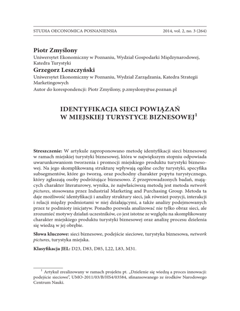 STUDIA OECONOMICA POSNANIENSIA 2014, vol. 2, no. 3 (264) Piotr Zmyślony Uniwersytet Ekonomiczny w Poznaniu, Wydział Gospodarki Międzynarodowej, Katedra Turystyki Grzegorz Leszczyński Uniwersytet Ekonomiczny w Poznaniu, Wydział Zarządzania, Katedra Strategii Marketingowych Autor do korespondencji: Piotr Zmyślony, [email protected] IDENTYFIKACJA SIECI POWIĄZAŃ W MIEJSKIEJ TURYSTYCE BIZNESOWEJ1 Streszczenie: W artykule zaproponowano metodę identyfikacji sieci biznesowej w ramach miejskiej turystyki biznesowej, która w największym stopniu odpowiada uwarunkowaniom tworzenia i promocji miejskiego produktu turystyki biznesowej. Na jego skomplikowaną strukturę wpływają ogólne cechy turystyki, specyfika subsegmentów, które go tworzą, oraz pochodny charakter popytu turystycznego, który zgłaszają osoby podróżujące biznesowo. Z przeprowadzonych badań, mających charakter literaturowy, wynika, że najwłaściwszą metodą jest metoda network pictures, stosowana przez Industrial Marketing and Purchasing Group. Metoda ta daje możliwość identyfikacji i analizy struktury sieci, jak również pozycji, interakcji i relacji między podmiotami w niej działającymi, a także analizy podejmowanych przez te podmioty inicjatyw. Ponadto pozwala analizować nie tylko obraz sieci, ale zrozumieć motywy działań uczestników, co jest istotne ze względu na skomplikowany charakter miejskiego produktu turystyki biznesowej oraz analizę procesu dzielenia się wiedzą w jej obrębie. Słowa kluczowe: sieci biznesowe, podejście sieciowe, turystyka biznesowa, network pictures, turystyka miejska. Klasyfikacja JEL: D23, D83, D85, L22, L83, M31. 1 Artykuł zrealizowany w ramach projektu pt. „Dzielenie się wiedzą a proces innowacji: podejście sieciowe”, UMO-2011/03/B/HS4/03584, sfinansowanego ze środków Narodowego Centrum Nauki. 104 Piotr Zmyślony, Grzegorz Leszczyński IDENTIFYING NETWORKS IN URBAN BUSINESS TOURISM Abstract: The aim of this paper is to propose a method for identifying business networks in urban business tourism which would most closely correspond to the development and promotional determinants of urban business tourism products. The complex structure of these products is connected with the general nature of tourism, the business tourism sub-segment, and the derivative nature of business tourist demand. The findings suggest that the most appropriate method is the network pictures method, proposed by the Industrial Marketing and Purchasing Group. It makes it possible to examine the structure of a network as well as the positions, relations, connections and networking activities of its participants from the perspective of a city (or an urban business tourist product). It also gives an opportunity to understand the motives for the actions of network participants, which is important in the analysis of the knowledge-sharing diffusion within a network. Keywords: business networks, network approach, business tourism, network pictures, city tourism Wstęp Turystyka biznesowa jest nieodłącznie kojarzona z miastami. Mimo cech wspólnych z tradycyjnymi formami turystyki, podkreślanych w literaturze przedmiotu [Davidson i Cope 2003; Sidorkiewicz 2011; Swarbrooke i Horner 2001], tworzy ona w miarę samodzielny komponent miejskiej oferty turystycznej miasta oraz jego gospodarki turystycznej. Jej głównymi wyróżnikami są sektorowy charakter oraz relacje typu business-to-business, na bazie których podmioty opierają swoje relacje z klientami [Swarbrooke i Horner 2001]. Produkt turystyki biznesowej ma ogólne atrybuty terytorialnego produktu turystycznego [Gołembski 1979; Kaczmarek, Stasiak i Włodarczyk 2005; Wodejko 1998], co pozwala na zastosowanie podejścia sieciowego do analizy procesu jego tworzenia i dostarczania na rynek. Jest on w mniejszym stopniu uzależniony od lokalnych walorów i atrakcyjności turystycznej miasta oraz ma mniej rozdrobnioną strukturę. Mając na uwadze wyszczególnione atrybuty produktu turystyki biznesowej, można sformułować tezę, że skłonność podmiotów funkcjonujących w sferze podaży miejskiej turystyki biznesowej do dzielenia się wiedzą oraz wynikająca z nich innowacyjność są wyższe niż w wypadku heterogenicznych i rozdrobnionych wewnętrznie produktów turystycznych charakteryzujących inne formy turystyki, takie jak turystyka kulturowa, wypoczynkowa lub rozrywkowa. Ponadto zwiększenie integracji tych podmiotów, a przez to zin- Identyfikacja sieci powiązań w miejskiej turystyce biznesowej 105 tensyfikowanie procesu dzielenia się wiedzą w ramach sieci, można osiągnąć poprzez odpowiednie zarządzanie turystyką na szczeblu miasta. Zbadanie procesu dzielenia się wiedzą wymaga przyjęcia metody identyfikacji sieci, która odpowiada uwarunkowaniom tworzenia terytorialnego produktu turystyki biznesowej. Wybór tej metody to cel niniejszego artykułu. Problem pracy zawiera się w pytaniu: jaka jest najskuteczniejsza metoda identyfikacji sieci biznesowej w analizowanym sektorze turystyki, aby na tej podstawie możliwe było rozpoznanie kierunków przepływu wiedzy między zidentyfikowanymi podmiotami, które z kolei prowadzą do zwiększenia innowacyjności na szczeblu tych podmiotów oraz na odniesieniu do całej sieci. Artykuł jest podzielony na cztery części. Na początku omówiono istotę miejskiego produktu turystyki biznesowej. Następnie zaprezentowano istotę podejścia sieciowego oraz jego zastosowanie w turystyce. W dalsze części przedstawiono metody identyfikacji sieci wykorzystywane w literaturze przedmiotu. W Podsumowaniu wskazano zalety metody network pictures w identyfikacji sieci powiązań w turystyce biznesowej. 1. Istota miejskiego produktu turystyki biznesowej Najbardziej podstawową formą produktu turystycznego jest jego ujęcie wąskie [Kotler i Keller 2012; Medlik 2003], zgodnie z którym stanowi on wszystko to, co turyści kupują, a więc poszczególne usługi, pakiety usług lub dobra