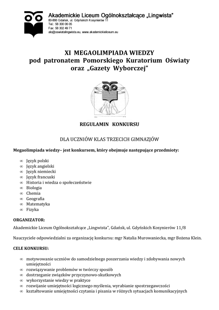 XI MEGAOLIMPIADA WIEDZY pod patronatem Pomorskiego Kuratorium Oświaty oraz „Gazety Wyborczej” REGULAMIN KONKURSU DLA UCZNIÓW KLAS TRZECICH GIMNAZJÓW Megaolimpiada wiedzy– jest konkursem, który obejmuje następujące przedmioty: • • • • • • • • • • Język polski Język angielski Język niemiecki Język francuski Historia i wiedza o społeczeństwie Biologia Chemia Geografia Matematyka Fizyka ORGANIZATOR: Akademickie Liceum Ogólnokształcące „Lingwista”,, Gdańsk, ul. Gdyńskich Kosynierów 11/8 1 Nauczyciele odpowiedzialni za organizację konkursu: konkursu: mgr Natalia Murowaniecka, Murowaniec mgr Bożena Klein. CELE KONKURSU: • • • • • • motywowanie uczniów do samodzielnego poszerzania wiedzy i zdobywania nowych umiejętności rozwiązywanie problemów w twórczy sposób dostrzeganie związków przyczynowo-skutkowych przyczynowo wykorzystanie wiedzy w praktyce rozwijanie umiejętności logicznego myślenia, wyrabianie spostrzegawczości kształtowanie umiejętności czytania i pisania w różnych sytuacjach sytuacjach komunikacyjnych • • • • analiza i interpretacja różnych tekstów kultury rozbudzanie świadomości języka jako składnika dziedzictwa kulturowego rozwijanie zainteresowań z różnych przedmiotów wyłanianie talentów i wspieranie uczniów uzdolnionych UCZESTNICY: Uczniowie klas trzecich gimnazjów województwa pomorskiego TERMIN I MIEJSCE ETAPU REJONOWEGO: 08-12 lutego 2016 roku Akademickie Liceum Ogólnokształcące „Lingwista”, Gdańsk, ul. Gdyńskich Kosynierów 11/8 Informacje dotyczące godziny rozpoczęcia konkursów z poszczególnych przedmiotów zamieszczono poniżej, są one dostępne również na naszej stronie internetowej: www.akademickieliceum.eu TERMINARZ KONKURSÓW PRZEDMIOTOWYCH DATA GODZINA PRZEDMIOT 08 lutego 2016 (poniedziałek) 12:30-13:30 Międzyszkolny konkurs historia z wiedzą o społeczeństwie 08 lutego 2016 (poniedziałek) 14:00-15:00 Międzyszkolny konkurs z języka polskiego 09 lutego 2016 (wtorek) 12:30 – 13:30 Międzyszkolny konkurs z fizyki 09 lutego 2016 (wtorek) 14:00 – 15:00 Międzyszkolny konkurs z matematyki 10 lutego 2016 (środa) 12:30-13:30 Międzyszkolny konkurs z chemii 10 lutego 2016 (środa) 14:00-15:00 11 lutego 2016 (czwartek) 12:30-13:30 11 lutego 2016 (czwartek) 14:00-15:00 Międzyszkolny konkurs z biologii 12 lutego 2016 (piątek) 12:30-13:30 Międzyszkolny konkurs z języka francuskiego 12 lutego 2016 (piątek) 14:00-15:00 Międzyszkolny konkurs z geografii Międzyszkolny konkurs z języka angielskiego Międzyszkolny konkurs z języka niemieckiego ZASADY UCZESTNICTWA 1. Uczestnikami konkursu mogą być uczniowie klas trzecich gimnazjów województwa pomorskiego. 2. Konkurs przeprowadzony zostanie w dwóch etapach: • Etap szkolny - organizowany przez nauczyciela danego przedmiotu w macierzystej szkole gimnazjalnej (w tym etapie mogą brać udział wszyscy uczniowie zainteresowani konkursem). Nauczyciele typują osoby, które wezmą udział w konkursie na szczeblu rejonowym, kryterium może być ocena semestralna lub wynik testu, który układa nauczyciel w danej szkole. • Etap rejonowy - organizowanym przez Akademickie Liceum Ogólnokształcące „Lingwista” (w tym etapie wezmą udział uczniowie wyłonieni podczas eliminacji szkolnych – maksymalnie pięć osób ze szkoły). Szkoły zgłaszają uczniów do etapu rejonowego konkursu wypełniając formularz online: http://goo.gl/forms/WvjGdGsX1m do 03.02.2016 roku. Wszelkie problemy techniczne i pytania prosimy zgłaszać e-mailem pod adres: [email protected] Uwaga! Zgłoszenia przesłane inną drogą niż przez formularz nie będą brane pod uwagę. 3. Uczniowie ze szkół, które nie zgłosiły chęci wzięcia udziału w konkursie mogą być zgłaszani przez rodziców lub opiekunów prawnych do poszczególnych konkursów. 4. Poszczególne konkursy będą polegać na rozwiązywaniu przez uczniów zestawu zadań zarówno otwartych, jak i zamkniętych. 5. Tematyka oraz wymagania konkursów przedmiotowych obejmują treści podstawy programowej gimnazjum z elementami wybiegającymi nieznacznie poza te treści. 6. Podczas rozwiązywania zadań matematycznych, fizycznych i chemicznych uczniowie mogą korzystać z kalkulatorów. 7. Uczniowie nie mogą korzystać z urządzeń telekomunikacyjnych, a podczas konkursów językowych ze słowników. 8. Czas na rozwiązanie zadań wynosi 45 minut. OCENIANIE PRAC I NAGRODY: 1. Prace konkursowe oceniać będą nauczyciele Akademickiego Liceum Ogólnokształcącego „Lingwista” w składzie trzyosobowym. 2. Wyniki konkursu zostaną zamieszczone na stronie internetowej: www.akademickieliceum.eu do dnia 04.03.2016 roku. 3. Uroczyste rozdanie nagród nastąpi po zakończeniu całego cyklu konkursów XI Megaolimpiady Wiedzy. Informacje szczegółowe o terminie oraz miejscu rozdania nagród zostaną zamieszczone na stronie internetowej: www.akademickieliceum.eu, i dodatkowo zostaną przekazane do szkół drogą mailową. 4. Dla zwycięzców poszczególnych konkursów przewidziane są stypendia naukowe w Akademickim Liceum Ogólnokształcącym „Lingwista”. 5. Najlepszy Olimpijczyk otrzyma możliwość bezpłatnej nauki w Akademickim Liceum Ogólnokształcącym „Lingwista”. Serdecznie zapraszamy !