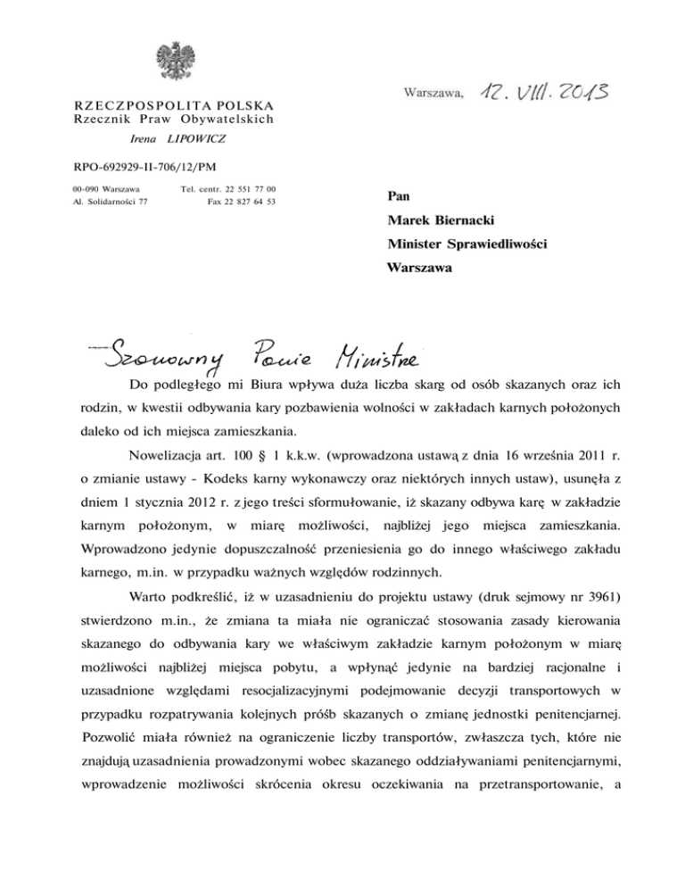 R Z E C Z P O S P O L I T A POLSKA Rzecznik Praw Obywatelskich Irena LIPOWICZ RPO-692929-II-706/12/PM 00-090 Warszawa Al. Solidarności 77 Tel. centr. 22 551 77 00 Fax 22 827 64 53 Pan Marek Biernacki Minister Sprawiedliwości Warszawa Do podległego mi Biura wpływa duża liczba skarg od osób skazanych oraz ich rodzin, w kwestii odbywania kary pozbawienia wolności w zakładach karnych położonych daleko od ich miejsca zamieszkania. Nowelizacja art. 100 § 1 k.k.w. (wprowadzona ustawą z dnia 16 września 2011 r. o zmianie ustawy - Kodeks karny wykonawczy oraz niektórych innych ustaw), usunęła z dniem 1 stycznia 2012 r. z jego treści sformułowanie, iż skazany odbywa karę w zakładzie karnym położonym, w miarę możliwości, najbliżej jego miejsca zamieszkania. Wprowadzono jedynie dopuszczalność przeniesienia go do innego właściwego zakładu karnego, m.in. w przypadku ważnych względów rodzinnych. Warto podkreślić, iż w uzasadnieniu do projektu ustawy (druk sejmowy nr 3961) stwierdzono m.in., że zmiana ta miała nie ograniczać stosowania zasady kierowania skazanego do odbywania kary we właściwym zakładzie karnym położonym w miarę możliwości najbliżej miejsca pobytu, a wpłynąć jedynie na bardziej racjonalne i uzasadnione względami resocjalizacyjnymi podejmowanie decyzji transportowych w przypadku rozpatrywania kolejnych próśb skazanych o zmianę jednostki penitencjarnej. Pozwolić miała również na ograniczenie liczby transportów, zwłaszcza tych, które nie znajdują uzasadnienia prowadzonymi wobec skazanego oddziaływaniami penitencjarnymi, wprowadzenie możliwości skrócenia okresu oczekiwania na przetransportowanie, a 2 ponadto na niezwłoczne zrealizowanie dyspozycji transportowej skazanych, którzy np. ze względu na trudną sytuację rodzinną wymagają pilnego przetransportowania. Tymczasem w wielu skargach kierowanych do Biura Rzecznika Praw Obywatelskich wnioskodawcy podnoszą, że skazani odbywają karę pozbawienia wolności w znacznym oddaleniu od ich miejsca zamieszkania, a prośby w tym przedmiocie mogą być zrealizowane pozytywnie pod warunkiem, iż w zakładzie karnym, do którego chcą być przetransportowani, jest wolne miejsce w momencie rozpoznania prośby. Informacje uzyskane z okręgowych inspektoratów Służby Więziennej potwierdziły taką praktykę rozpoznawania próśb skazanych. Jako przykład można podać sprawę, w której wnioskodawczyni podnosiła, iż w okresie 6 miesięcy jej mąż był pięciokrotnie transportowany do różnych jednostek penitencjarnych. Częste zmiany miejsca pobytu skazanego oraz obecne miejsce odbywania kary, znacznie oddalone od miejsca zamieszkania najbliższych, spowodowało poważne utrudnienia w utrzymywaniu regularnych kontaktów z rodziną w formie widzeń. Jej mąż jest ojcem trójki dzieci, w wieku 12, 11 oraz 3 lat, w tym jedno dziecko jest niepełnosprawne (wymagające stałej opieki innej osoby, z uwagi na ograniczoną możliwość samodzielnej egzystencji), drugie zaś chore chronicznie. Inny wnioskodawca, ojciec 2 - letniego dziecka, zamieszkały w pobliżu G., karę pozbawienia wolności odbywa w Zakładzie Karnym w B.. Siedmiokrotnie odmówiono mu przetransportowania do jednostek penitencjarnych położonych bliżej miejsca zamieszkania, ze względu na brak w nich wolnych miejsc. Odpowiedziano mu również, iż może utrzymywać z rodziną kontakt telefoniczny, listowny oraz poprzez paczki, co w przypadku małego dziecka wydaje się być niemożliwym do wykonania. W kolejnej sprawie osadzony, ojciec czwórki małoletnich dzieci, które wraz z konkubiną zamieszkują na południu Polski, karę pozbawienia wolności odbywa w Zakładzie Karnym w K.. Trzykrotne prośby o przetransportowanie zostały rozpoznane odmownie ze względu na nadmierne zaludnienie jednostek penitencjarnych, o przetransportowanie do których się ubiegał. W przedmiotowej kwestii prowadzona była korespondencja z Centralnym Zarządem Służby Więziennej, w której postulowano stworzenie mechanizmu ustalania kolejności transportów („listy" oczekujących na transport) do konkretnego zakładu 3 karnego, położonego najbliżej miejsca zamieszkania osób bliskich dla skazanego, z którymi rzeczywiście utrzymuje on kontakt. W moim przekonaniu aktualna praktyka i weryfikowanie wyłącznie "na dany dzień" zaludnienia zakładu karnego, o przetransportowanie do którego osadzony zabiega, jest niewłaściwa. Stan zaludnienia każdej jednostki penitencjarnej stale się zmienia i osadzony musiałby składać prośby o przetransportowanie każdego dnia, aby mieć możliwość uchwycenia momentu, gdy zwolni się miejsce w konkretnym zakładzie karnym. Lista osób oczekujących na przetransportowanie pozwoliłaby uniknąć tego rodzaju sytuacji i sprzyjałaby respektowaniu prawa osadzonych do utrzymywania kontaktów z rodziną. Dyrektor Generalny Służby Więziennej nie uwzględnił jednak przedstawionych postulatów i podkreślił, że aktualnie obowiązujący system kierowania do konkretnych jednostek sprawdził się w praktyce i nie powinien być zmieniany. Kopię korespondencji przesyłam w załączeniu. Tymczasem faktyczne wyizolowanie skazanego z jego rodziny może stanowić istotny czynnik sprzyjający powrotowi do przestępstwa. Poza tym, obowiązujące przepisy jednoznacznie akcentują potrzebę wzmacniania więzi rodzinnych. Przede wszystkim, w wachlarzu kontaktów z rodziną wskazanym w art. 105 § 1 k.k.w., na pierwszym miejscu postawiono właśnie widzenia. Należy również zauważyć, iż kierunek rozstrzygnięć organów postępowania wykonawczego, w zakresie utrzymywania wszelkiego rodzaju kontaktów skazanych ze swoimi dziećmi, wyznacza przepis art. 87a k.k.w., zgodnie z którym, wykonując karę wobec skazanych sprawujących stałą pieczę nad dzieckiem do lat 15, uwzględnia się w szczególności potrzebę inicjowania, podtrzymywania i zacieśniania ich więzi uczuciowej z dziećmi. Spra