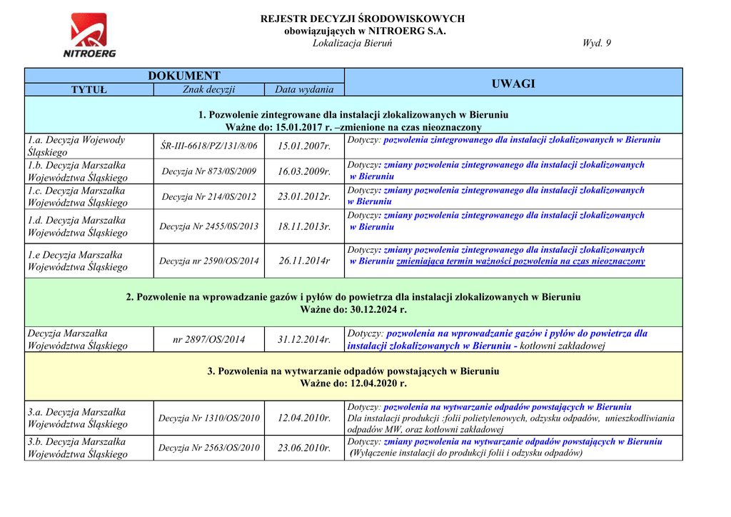 REJESTR DECYZJI ŚRODOWISKOWYCH obowiązujących w NITROERG S.A. Lokalizacja Bieruń DOKUMENT Znak decyzji TYTUŁ Data wydania Wyd. 9 UWAGI 1. Pozwolenie zintegrowane dla instalacji zlokalizowanych w Bieruniu Ważne do: 15.01.2017 r. –zmienione na czas nieoznaczony 1.a. Decyzja Wojewody Śląskiego 1.b. Decyzja Marszałka Województwa Śląskiego 1.c. Decyzja Marszałka Województwa Śląskiego Dotyczy: pozwolenia zintegrowanego dla instalacji zlokalizowanych w Bieruniu ŚR-III-6618/PZ/131/8/06 15.01.2007r. Decyzja Nr 873/0S/2009 16.03.2009r. Decyzja Nr 214/0S/2012 23.01.2012r. 1.d. Decyzja Marszałka Województwa Śląskiego Decyzja Nr 2455/0S/2013 18.11.2013r. Dotyczy: zmiany pozwolenia zintegrowanego dla instalacji zlokalizowanych w Bieruniu Dotyczy: zmiany pozwolenia zintegrowanego dla instalacji zlokalizowanych w Bieruniu Dotyczy: zmiany pozwolenia zintegrowanego dla instalacji zlokalizowanych w Bieruniu 1.e Decyzja Marszałka Województwa Śląskiego Decyzja nr 2590/OS/2014 26.11.2014r Dotyczy: zmiany pozwolenia zintegrowanego dla instalacji zlokalizowanych w Bieruniu zmieniająca termin ważności pozwolenia na czas nieoznaczony 2. Pozwolenie na wprowadzanie gazów i pyłów do powietrza dla instalacji zlokalizowanych w Bieruniu Ważne do: 30.12.2024 r. Decyzja Marszałka Województwa Śląskiego nr 2897/OS/2014 31.12.2014r. Dotyczy: pozwolenia na wprowadzanie gazów i pyłów do powietrza dla instalacji zlokalizowanych w Bieruniu - kotłowni zakładowej 3. Pozwolenia na wytwarzanie odpadów powstających w Bieruniu Ważne do: 12.04.2020 r. 3.a. Decyzja Marszałka Województwa Śląskiego Decyzja Nr 1310/OS/2010 12.04.2010r. 3.b. Decyzja Marszałka Województwa Śląskiego Decyzja Nr 2563/OS/2010 23.06.2010r. Dotyczy: pozwolenia na wytwarzanie odpadów powstających w Bieruniu Dla instalacji produkcji :folii polietylenowych, odzysku odpadów, unieszkodliwiania odpadów MW, oraz kotłowni zakładowej Dotyczy: zmiany pozwolenia na wytwarzanie odpadów powstających w Bieruniu (Wyłączenie instalacji do produkcji folii i odzysku odpadów) 4. Pozwolenie wodno-prawnego na pobór wód podziemnych Ważne do: 20.06.2026 r. 4.a. Decyzja Wojewody Śląskiego 4.b. Decyzja Wojewody Śląskiego ŚR-I-6811/69/06 20.06.2006r. ŚR-I-6811/69/06 13.04.2007r. Dotyczy: pozwolenie wodno-prawnego na pobór wód podziemnych Dotyczy: zmiany pozwolenia wodno-prawnego na pobór wód podziemnych 5. Decyzja dot. udzielenia zezwolenia na emisję gazów cieplarnianych z instalacji spalania paliw zlokalizowanej na terenie zakładu w Bieruniu Ważna do: 26.12.2022 r. 5.a. Decyzja Marszałka Województwa Śląskiego Decyzja Nr 3579/OS/2012 27.12.2012r. Dotyczy: udzielenia zezwolenia na emisję gazów cieplarnianych z instalacji spalania paliw zlokalizowanej na terenie zakładu w Bieruniu REJESTR DECYZJI ŚRODOWISKOWYCH obowiązujących w NITROERG S.A. lokalizacja Krupski Młyn Poz. DOKUMENT TYTUŁ Znak decyzji Data wydania 1. Decyzja Marszałka Województwa Śląskiego 1863/OS/2013 14.08.2013 r. 2. Decyzja Marszałka Województwa Śląskiego 2772/OS/2014 02.12.2014 r. 3. Decyzja Wojewody Śląskiego ŚR-I-6811/148/06 27.12.2006 r. 4. Decyzja Marszałka Województwa Śląskiego 1855/OS/2012 04.07.2012 r. UWAGI Dotyczy: pozwolenia zintegrowanego dla instalacji zlokalizowanych w Krupskim Młynie Ważna do: 14.08.2023 r. Dotycz: pozwolenia zintegrowanego dla instalacji zlokalizowanych w Krupskim Młynie Ważna do: czas nieoznaczony Dotyczy: pozwolenie wodno-prawne na pobór wód podziemnych Ważna do: 27.12.2026 r. Dotyczy: pozwolenie wodno-prawne na wprowadzanie ścieków przemysłowych zawierających substancje szczególnie szkodliwe dla środowiska wodnego do urządzeń kanalizacyjnych należących do zakładu Usług Komunalnych Tworóg Spółka z o.o. Ważna do: 04.07.2016 r.