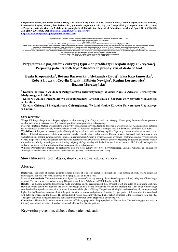 Kropornicka Beata, Baczewska Bożena, Dadej Aleksandra, Krzyżanowska Ewa, Łuczyk Robert, Olszak Cecylia, Nowicka Elżbieta, Lorencowicz Regina, Muraczyńska Bożena. Przygotowanie pacjentów z cukrzycą typu 2 do profilaktyki zespołu stopy cukrzycowej = Preparing patients with type 2 diabetes to prophylaxis of diabetic foot. Journal of Education, Health and Sport. 2016;6(11):311324. eISSN 2391-8306. DOI http://dx.doi.org/10.5281/zenodo.167141 http://ojs.ukw.edu.pl/index.php/johs/article/view/3999 The journal has had 7 points in Ministry of Science and Higher Education parametric evaluation. Part B item 755 (23.12.2015). 755 Journal of Education, Health and Sport eISSN 2391-8306 7 © The Author (s) 2016; This article is published with open access at Licensee Open Journal Systems of Kazimierz Wielki University in Bydgoszcz, Poland Open Access. This article is distributed under the terms of the Creative Commons Attribution Noncommercial License which permits any noncommercial use, distribution, and reproduction in any medium, provided the original author(s) and source are credited. This is an open access article licensed under the terms of the Creative Commons Attribution Non Commercial License (http://creativecommons.org/licenses/by-nc/4.0/) which permits unrestricted, non commercial use, distribution and reproduction in any medium, provided the work is properly cited. This is an open access article licensed under the terms of the Creative Commons Attribution Non Commercial License (http://creativecommons.org/licenses/by-nc/4.0/) which permits unrestricted, non commercial use, distribution and reproduction in any medium, provided the work is properly cited. The authors declare that there is no conflict of interests regarding the publication of this paper. Received: 01.11.2016. Revised 12.11.2016. Accepted: 17.11.2016. Przygotowanie pacjentów z cukrzycą typu 2 do profilaktyki zespołu stopy cukrzycowej Preparing patients with type 2 diabetes to prophylaxis of diabetic foot Beata Kropornicka1, Bożena Baczewska1, Aleksandra Dadej1, Ewa Krzyżanowska1, Robert Łuczyk1, Cecylia Olszak1, Elżbieta Nowicka1, Regina Lorencowicz2, Bożena Muraczyńska3 1 Katedra Interny z Zakładem Pielęgniarstwa Internistycznego Wydział Nauk o Zdrowiu Uniwersytetu Medycznego w Lublinie 2 Katedra i Zakład Pielęgniarstwa Neurologicznego Wydział Nauk o Zdrowiu Uniwersytetu Medycznego w Lublinie 3 Katedra Chirurgii i Pielęgniarstwa Chirurgicznego Wydział Nauk o Zdrowiu Uniwersytetu Medycznego w Lublinie Streszczenie Wstęp. Edukacja chorych na cukrzycę wpływa na obniżenie ryzyka późnych powikłań cukrzycy. Celem pracy było określenie poziomu wiedzy pacjentów z cukrzycą typu 2 w zakresie profilaktyki zespołu stopy cukrzycowej. Materiał i metoda. Metodą wykorzystaną w pracy był sondaż diagnostyczny, techniką testowanie wiedzy pacjentów, a narzędziem autorski test wiadomości. Badania zostały przeprowadzone wśród 100 dorosłych pacjentów z cukrzycą typu 2 w SPSK4 w Lublinie w 2014 roku. Wyniki badań. Pacjenci z cukrzycą posiadali dużą wiedzę w zakresie zalecanej diety, wysiłku fizycznego i zasad monitorowania cukrzycy. Deficyt dotyczył znajomości istoty i czynników ryzyka zespołu stopy cukrzycowej. Poziom wiedzy badanych był związany z ich wykształceniem, czasem trwania choroby i miejscem zamieszkania. Chorzy z wykształceniem wyższym i średnim posiadali wyższy poziom wiedzy niż pacjenci z wykształceniem zawodowym i podstawowym. Dłuższy czas trwania choroby wiązał się z wyższym poziomem wiedzy respondentów. Osoby mieszkające na wsi miały większy deficyt wiedzy niż badani zamieszkali w mieście. Płeć i wiek badanych nie wpływały na ich przygotowanie do profilaktyki zespołu stopy cukrzycowej. Wnioski. Przygotowanie chorych do profilaktyki zespołu stopy cukrzycowej było niewystarczające. Badania wskazują na konieczność zintensyfikowania działań edukacyjnych środowiska medycznego wśród chorych z cukrzycą. Słowa kluczowe: profilaktyka, stopa cukrzycowa, edukacja chorych Abstract Backgroud. Education of diabetic patients reduces the risk of long-term diabetic complications. The purpose of study was to assess the knowledge of patients with type 2 diabetes on the prophylaxis of diabetic foot. Material and methods. The problem was investigated by means of a survey to test patients’ knowledge (technique) using test of knowledge as a tool. The survey was carried out among 100 patients with type 2 diabetes in PSK4, Lublin, in 2014. Results. The diabetic patients demonstrated wide knowledge on the recommended diet, physical effort and rules of monitoring diabetes. However certain deficit was found in the area of knowledge on risk factors for diabetic foot and the problem itself. The level of knowledge correlated with respondents’ education, disease duration and the place of living. The patients with higher and secondary education presented higher level of knowledge compared with the patients with vocational and primary education. Longer period of disease duration correlated with better knowledge on the disease. The respondents living in the country showed higher deficit compared to the respondents from the city. The age or gender of the respondents did not affect their preparation to the prophylaxis of diabetic foot. Conclusions. The results found the patients were not sufficiently prepared to the prophylaxis of diabetic foot. The results suggest the need to intensify educational activities of medical personnel addressed at diabetic patients. Keywords: prevention, diabetic foot, patient education 311 Wstęp Cukrzyca uznawana jest za najczęściej występującą chorobę cywilizacyjną. Szacuje się, że do 2025 roku na cukrzycę chorować będzie 300 mln ludzi. W Polsce cukrzyca dotyka 4-5% społeczeństwa. Według badań epidemiologicznych prowadzonych w ostatnich latach, po 35 roku życia cukrzycę rozpoznaje się aż u 10% populacji. Częściej