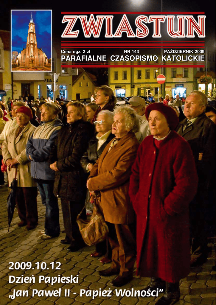 Cena egz. 2 zł NR 143 PAŹDZIERNIK 2009 PARAFIALNE CZASOPISMO KATOLICKIE ZWIASTUN NR 10 (143)/2009 2 Słowo Ks. Proboszcza Dziedzictwo Jana Pawła II 16 października 1978 r, Rzym. Kard. Felici z logii Bazyliki św. Piotra ogłasza światu radosną wieść. Kościół znów ma papieża. I wypowiada słowa: Dominum Carolum Sanctae Romanae Ecclesiae Cardinalem Wojtyła. Plac zamiera. Na czele Kościoła katolickiego staje człowiek, który przygodzi z dalekiego kraju, człowiek, który nigdy się nie bał, człowiek wolności. 2kwietnia 2005 r. świat słyszy, iż ten papież odszedł do domu Ojca, by stamtąd nam błogosławił Wszyscy żyliśmy w świetle Jana Pawła II. Starsi pamiętają radość i entuzjazm jego wyboru, czas jego pielgrzymek do zniewolonego kraju, młodsi zapewne pamiętają już tylko obraz schorowanego Ojca Świętego, który mimo to ich przyciągał swoja siłą duchową. Wielkość Naszego Rodaka nie podlega dyskusji. Wszyscy modlimy się i czekamy na jego beatyfikację i kanonizację. Pamiętamy jego słowa: „Otwórzcie drzwi Chrystusowi”, „Człowieka nie można do końca zrozumieć bez Chrystusa”; „Człowiek jest drogą Kościoła”; „Każdy ma swoje Westerplatte”; „Niech zstąpi Duch Twój i odnowi Oblicze ziemi, tej Ziemi”; Wciąż otwartym pozostaje jednak kwestia tego, czy i na ile realizujemy papieskie nauczanie w życiu codziennym. Ile jest w nas wyobraźni miłosierdzia, wrażliwości na potrzeby drugiego człowieka, ile gotowości do dialogu i pojednania? Czy pamiętamy o papieskiej nauce o ochronie zycia, dzieci nienarodzonych czy osób starszych Czy wolność, miłość tak, jak uczył tego Jan Paweł II, Ks. Prałat dr Stanisław Chomiak Proboszcz kojarzy się z odpowiedzialnością. Czy bardziej wolimy mieć czy być? Czy umiemy, tak jak on wymagać od siebie nawet wówczas, gdy inni od nas nie wymagają? Dziedzictwo myśli i nauczania Jana Pawła II pozostaje zadaniem każdego z nas. Jesteśmy to winni naszemu Ukochanemu Ojcu Świętemu. PIELGRZYMKA NADZWYCZAJNYCH SZAFARZY EUCHARYSTII NA JASNĄ GÓRĘ „ Jeśli kto pełni posługę, niech to czyni mocą, której Bóg udziela, aby we wszystkim był uwielbiony Bóg przez Jezusa Chrystusa.”(1P 4,10-11) 26 września 2009 r. miała miejsce już czwarta ogólnopolska Pielgrzymka nadzwyczajnych szafarzy Eucharystii na Jasną Gorę. Poprzednie odbyły się w latach 2004, 2005 i 2007. Spotkaniu przewodniczył ks. bp Stefan Cichy, przewodniczący Komisji Episkopatu Polski d/ s Kultu Bożego i Dyscypliny Sakramentów, którego zaangażowanie, wypowiedzi oraz homilia Mszalna na temat posługi nadzwyczajnych szafarzy Eucharystii wzbudziły wielką życzliwość zgromadzonych. Podczas Pielgrzymki wielkim przeżyciem dla wszystkich jej uczestników była procesja Eucharystyczna na wałach jasnogórskich, podczas której piel- grzymi modlili się w intencji parafii, w której spełniają posługę Nadzwyczajnych szafarzy Komunii Świętej. Obok modlitwy uczestnicy Pielgrzymki mieli także okazje wysłuchać konferencji ks. dr Zbigniewa Sobolewskiego, sekretarza Caritas polska na temat duchowości eucharystycznej w życiu Nadzwyczajnych Szafarzy Eucharystii. Ks., Zbigniew w swoim wystąpieniu zwraca l uwagę, iż posługa nadzwyczajnych szafarzy Eucharystii jest służbą Chrystusowi i Jego Kościołowi. Tak rozumiana posługa wymaga z jednej strony osobistego pogłębienia wiary i osobistej więzi z Jezusem Eucharystycznym oraz wzrastania w świętości przez szafarzy, ich służbę wobec chorych i cierpiących, którym zanoszą Komunię Św. jak i z drugiej strony konieczną i niezbywalną więź z Kaplanami i modlitwę za nich w roku Kapłańskim. Ks. Sobolewski w swoim wystąpieniu zwrócił także uwagę na konieczność współodpowiedzialności , zaangażowania szafarzy w życie parafii, w której spełniają posługę jako formę dawania świadectwa o swoim związku z Chrystusem i Kościołem. 27 listopada br. za sprawa inicjatywy ks. dr Krzysztofa Michalczaka z Poznania, autora książki „ Nadzwyczajny szafarz Komunii Świętej- nauczanie kościoła, formacja, świadectwo” zostało zaplanowane I Ogólnopolskie Sympozjum o posłudze Nadzwyczajnych Szafarzy Komunii Świętej we wspólnocie Kościoła Na zakończenie pragnę wyrazić moją wdzięczność wszystkim tym, którzy pomogli zorganizować wyjazd na tę właśnie pielgrzymkę Oprac. mgr Emilian Kupiec ZWIASTUN NR 10 (143)/2009 Na pierwszy rzut oka odmawianie różańca może się wydawać nieciekawe, a nawet nudne. Czy rzeczywiście? Sięgnijmy do prostego obrazu z życia. Obliczono, że małe dziecko powtarza wyraz “mama” około trzystu razy dziennie. Czy to się dziecku znudzi? Nigdy! A może nudzi to matkę? Też nie. Reaguje ona na każde odezwanie się dziecka Podobnie jest z modlitwą różańcową. Maryja jest naszą Matką. Kiedy odmawiamy różaniec, jesteśmy podobni do małego dziecka. Powtarzamy jak ono: Bądź pozdrowiona, Matko! Czy Maryja cieszy się z tego pozdrowienia? Na pewno tak! Jest to przecież nawiązanie do radosnego wydarzenia w Nazarecie, gdzie Anioł Gabriel oznajmił Jej, że jest “łaski pełna”, a Ona przyjęła to z pokorą, nazywając siebie służebnicą Pańską. Jeżeli Ona jest “łaski pełna”, to my świadomi własnej niedoskonałości, prosimy Ją: “Módl się za nami grzesznymi”, abyśmy także napełnieni zostali łaską przyjaźni Bożej. Ilekroć Maryja chciała przekazać światu swoje orędzie, zjawiała się wybranym ludziom (najczęściej dzieciom) z różańcem w ręku i usilnie zachęcała do jego odmawiania. Tak było w Lourdes w roku 1858, tak też było w Fatimie w roku 1917. Z tego wynika, że modlitwa różańcowa jest dla Maryi szczególnie miła, a dla człowieka bardzo skuteczna. Wyrosła ona z Ewangelii i jest jej streszczeniem. O wartości modlitwy różańcowej niech świadczy fakt, że więźniowie obozów koncentracyjnych robili sobie różańce z 