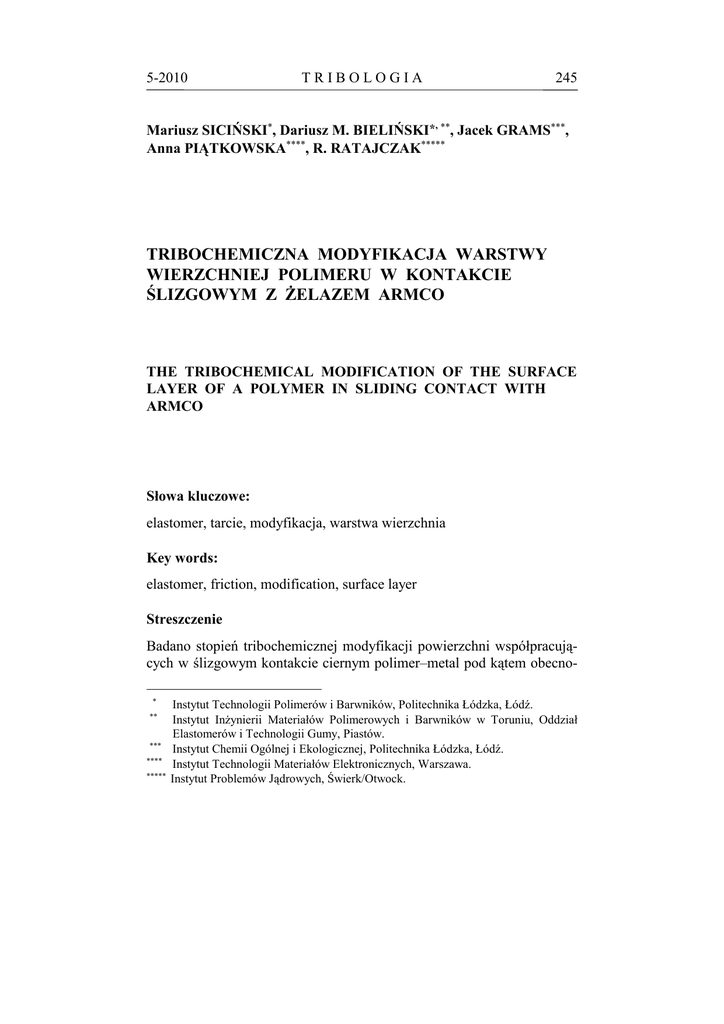 5-2010 TRIBOLOGIA 245 Mariusz SICIŃSKI∗, Dariusz M. BIELIŃSKI*, ∗∗, Jacek GRAMS∗∗∗, Anna PIĄTKOWSKA∗∗∗∗, R. RATAJCZAK∗∗∗∗∗ TRIBOCHEMICZNA MODYFIKACJA WARSTWY WIERZCHNIEJ POLIMERU W KONTAKCIE ŚLIZGOWYM Z śELAZEM ARMCO THE TRIBOCHEMICAL MODIFICATION OF THE SURFACE LAYER OF A POLYMER IN SLIDING CONTACT WITH ARMCO Słowa kluczowe: elastomer, tarcie, modyfikacja, warstwa wierzchnia Key words: elastomer, friction, modification, surface layer Streszczenie Badano stopień tribochemicznej modyfikacji powierzchni współpracujących w ślizgowym kontakcie ciernym polimer–metal pod kątem obecno∗ ∗∗ ∗∗∗ ∗∗∗∗ ∗∗∗∗∗ Instytut Technologii Polimerów i Barwników, Politechnika Łódzka, Łódź. Instytut InŜynierii Materiałów Polimerowych i Barwników w Toruniu, Oddział Elastomerów i Technologii Gumy, Piastów. Instytut Chemii Ogólnej i Ekologicznej, Politechnika Łódzka, Łódź. Instytut Technologii Materiałów Elektronicznych, Warszawa. Instytut Problemów Jądrowych, Świerk/Otwock. 246 TRIBOLOGIA 5-2010 ści jonów metalu przeniesionych do przeciwpróbki. Metodami ToF-SIMS, RBS oraz SEM-EDS potwierdzono obecność jonów Ŝelaza w warstwie wierzchniej wulkanizatów kauczuku butadienowo-styrenowego (SBR) oraz ebonitu współpracujących z Ŝelazem Armco. Powszechnie wiadomo, Ŝe jony metali o zmiennej wartościowości działają niczym „trucizna” na gumę, katalizując jej starzenie. Podjęto próbę ilościowej analizy procesu modyfikacji warstwy wierzchniej polimeru, która determinuje warunki współpracy oraz trwałość węzła ciernego guma– –metal. WPROWADZENIE Skojarzenie cierne guma–metal znajduje wiele zastosowań we współczesnej technice. Zakres aplikacji obejmuje m.in. uszczelnienia w systemach pneumatycznych i hydraulicznych czy łoŜyska ślizgowe róŜnych typów. Proces tarcia oraz towarzyszące mu starzenie materiału prowadzą do rozpadu gumy z uwalnianiem fragmentów makrocząsteczek kauczuku oraz małocząsteczkowych składników mieszanki gumowej. Obecność niektórych z tych produktów na skutek zachodzenia skomplikowanych reakcji tribochemicznych moŜe prowadzić do formowania warstwy pośredniej pomiędzy metalem a elastomerem [L. 1, 2], i w konsekwencji równieŜ do modyfikacji warstwy wierzchniej metalu. Bardzo często warstwa ta wykazuje odmienne właściwości cierne względem materiału wyjściowego, zmieniając warunki pracy węzła ciernego [L. 3]. Niezwykle istotnym aspektem współpracy elementów metalowych z polimerowymi jest takŜe przenoszenie cząstek metalu do warstwy wierzchniej gumowej przeciwpróbki. Potencjalna obecność (nawet w ilości 5 ppm) jonów metalu o zmiennej wartościowości moŜe znacząco wpływać na właściwości mechaniczne gumy, katalizując proces jej degradacji [L. 4]. Wpływa to znacząco na właściwości tribologiczne całego układu, prowadząc do skrócenia okresu pracy węzła ciernego. Pomimo tego, Ŝe literatura przedmiotu wskazuje na ogromne znaczenie analizy procesów tribochemicznych, które przez długi czas były „zapomniane” przez naukowców, a które zdają się być kluczem do prognozowania zuŜycia w węzłach polimer–metal [L. 5], problem modyfikacji warstwy wierzchniej polimeru przez metalowego partnera ciągle pozostaje niewyjaśniony. W niniejszej pracy podjęto próbę ilościowej oceny stopnia przenoszenia jonów Ŝelaza do warstwy wierzchniej prze- 5-2010 TRIBOLOGIA 247 ciwpróbki gumowej (lub ebonitowej), współpracującej z Ŝelazem Armco, za pomocą analizy metodami ToF-SIMS, RBS oraz SEM-EDS. Materiały Obiektem badań były następujące materiały: 1. Ebonit, wyprodukowany na bazie kauczuku naturalnego [L. 6], 2. Napełnione sadzą siarkowe wulkanizaty kauczuku butadienowo – styrenowego (SBR) oraz kauczuku z dodatkiem IPPD1 jako zmiatacza wolnych rodników. Gumę z kauczuku SBR otrzymano metodą wulkanizacji w formie stalowej. Wszystkie materiały poddane były tarciu z Ŝelazem Armco. Wszystkie przeciwpróbki polimerowe o kształcie krąŜków o śr. 35 mm poddane zostały cyklowi dwugodzinnego tarcia pod obciąŜeniem normalnym 21,4 N względem polerowanego Ŝelaza Armco. Badania przeprowadzono za pomocą tribometru T-05 (ITeE, Polska) pracującego z szybkością obrotową wału wrzeciona n = 60 obr./min. METODY BADAŃ Spektrometria mas jonów wtórnych z analizą czasu przelotu (ToF-SIMS) Badania wykonano za pomocą spektrometru mas jonów wtórnych z analizatorem czasu przelotu ToF-SIMS IV (ION-TOF, Niemcy). Dawka pierwotnych jonów Bi+ o energii 25 keV za kaŜdym razem nie przekraczała 7,5 × 1010 jonów/cm2 („static mode”). Dla kaŜdej próbki zebrano po 3 widma z róŜnych miejsc na powierzchni. Rozmiar analizowanych obszarów wynosił 500 µm × 500 µm. Spektrometria wstecznego rozproszenia jonów (RBS) Pomiarów dokonano w niemieckim laboratorium Forschungszentrum 4 + Dresden-Rossendorf, a jako pociski uŜyte zostały jony 2 He o energii kinetycznej 1,7 MeV. Takie energie dają stosunkowo niewielkie zasięgi cząstek padających, maksymalnie do kilkunastu µm. Kąt detekcji został ustawiony na 170°, zapewniając najlepsze warunki rozróŜnienia nawet blisko leŜących izotopów. 1 IPPD – N-fenylo-N-izopropylo-p-fenylenodiamina. 248 TRIBOLOGIA 5-2010 Mikroskopia elektronowa z analizą rentgenowską (SEM-EDS) Do badań mikrotopografii i mikrostruktury śladów tarcia uŜyty został skaningowy mikroskop elektronowy AURIGA (Zeiss, Niemcy). W obrazowaniu powierzchni wykorzystano sygnał elektronów wtórnych (SE), detektowanych przy napięciu przyspieszającym wiązki elektronów 10 keV. Analizę EDS przeprowadzono z uŜyciem detektora XFlash Detector 5010 (Bruker, USA). W celu potwierdzenia obecności poszukiwanych pierwiastków (związków chemicznych) na powierzchni śladu zuŜycia wykonany został ciąg map rozkładu oraz punktowe pomiary jakościowe. WYNIKI BADAŃ I DYSKUSJA ToF-SIMS Za pomoc