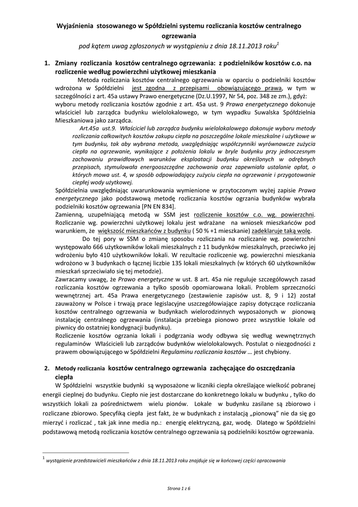 Wyjaśnienia stosowanego w Spółdzielni systemu rozliczania kosztów centralnego ogrzewania pod kątem uwag zgłoszonych w wystąpieniu z dnia 18.11.2013 roku1 1. Zmiany rozliczania kosztów centralnego ogrzewania: z podzielników kosztów c.o. na rozliczenie według powierzchni użytkowej mieszkania Metoda rozliczania kosztów centralnego ogrzewania w oparciu o podzielniki kosztów wdrożona w Spółdzielni jest zgodna z przepisami obowiązującego prawa, w tym w szczególności z art. 45a ustawy Prawo energetyczne (Dz.U.1997, Nr 54, poz. 348 ze zm.), gdyż: wyboru metody rozliczania kosztów zgodnie z art. 45a ust. 9 Prawa energetycznego dokonuje właściciel lub zarządca budynku wielolokalowego, w tym wypadku Suwalska Spółdzielnia Mieszkaniowa jako zarządca. Art.45a ust.9. Właściciel lub zarządca budynku wielolokalowego dokonuje wyboru metody rozliczania całkowitych kosztów zakupu ciepła na poszczególne lokale mieszkalne i użytkowe w tym budynku, tak aby wybrana metoda, uwzględniając współczynniki wyrównawcze zużycia ciepła na ogrzewanie, wynikające z położenia lokalu w bryle budynku przy jednoczesnym zachowaniu prawidłowych warunków eksploatacji budynku określonych w odrębnych przepisach, stymulowała energooszczędne zachowania oraz zapewniała ustalanie opłat, o których mowa ust. 4, w sposób odpowiadający zużyciu ciepła na ogrzewanie i przygotowanie ciepłej wody użytkowej. Spółdzielnia uwzględniając uwarunkowania wymienione w przytoczonym wyżej zapisie Prawa energetycznego jako podstawową metodę rozliczania kosztów ogrzania budynków wybrała podzielniki kosztów ogrzewania [PN EN 834]. Zamienną, uzupełniającą metodą w SSM jest rozliczenie kosztów c.o. wg. powierzchni. Rozliczanie wg. powierzchni użytkowej lokalu jest wdrażane na wniosek mieszkańców pod warunkiem, że większość mieszkańców z budynku ( 50 % +1 mieszkanie) zadeklaruje taką wolę. Do tej pory w SSM o zmianę sposobu rozliczania na rozliczanie wg. powierzchni występowało 666 użytkowników lokali mieszkalnych z 11 budynków mieszkalnych, przeciwko jej wdrożeniu było 410 użytkowników lokali. W rezultacie rozliczenie wg. powierzchni mieszkania wdrożono w 3 budynkach o łącznej liczbie 135 lokali mieszkalnych (w których 60 użytkowników mieszkań sprzeciwiało się tej metodzie). Zawracamy uwagę, że Prawo energetyczne w ust. 8 art. 45a nie reguluje szczegółowych zasad rozliczania kosztów ogrzewania a tylko sposób opomiarowana lokali. Problem sprzeczności wewnętrznej art. 45a Prawa energetycznego (zestawienie zapisów ust. 8, 9 i 12) został zauważony w Polsce i trwają prace legislacyjne uszczegółowiające zapisy dotyczące rozliczania kosztów centralnego ogrzewania w budynkach wielorodzinnych wyposażonych w pionową instalację centralnego ogrzewania (instalacja przebiega pionowo przez wszystkie lokale od piwnicy do ostatniej kondygnacji budynku). Rozliczenie kosztów ogrzania lokali i podgrzania wody odbywa się według wewnętrznych regulaminów Właścicieli lub zarządców budynków wielolokalowych. Postulat o niezgodności z prawem obowiązującego w Spółdzielni Regulaminu rozliczania kosztów … jest chybiony. 2. Metody rozliczania kosztów centralnego ogrzewania zachęcające do oszczędzania ciepła W Spółdzielni wszystkie budynki są wyposażone w liczniki ciepła określające wielkość pobranej energii cieplnej do budynku. Ciepło nie jest dostarczane do konkretnego lokalu w budynku , tylko do wszystkich lokali za pośrednictwem wielu pionów. Lokale w budynku zasilane są zbiorowo i rozliczane zbiorowo. Specyfiką ciepła jest fakt, że w budynkach z instalacją „pionową” nie da się go mierzyć i rozliczać , tak jak inne media np.: energię elektryczną, gaz, wodę. Dlatego w Spółdzielni podstawową metodą rozliczania kosztów centralnego ogrzewania są podzielniki kosztów ogrzewania. 1 wystąpienie przedstawicieli mieszkańców z dnia 18.11.2013 roku znajduje się w końcowej części opracowania Strona 1 z 6 Wyjaśnienia uwag do stosowanego w Spółdzielni systemu rozliczania kosztów centralnego ogrzewania Art.45a 10. Właściciel lub zarządca budynku wielolokalowego wprowadza wybraną metodę, o której mowa w ust. 9, w formie wewnętrznego regulaminu rozliczeń ciepła przeznaczonego na ogrzewanie tego budynku i przygotowanie ciepłej wody użytkowej dostarczanej centralnie poprzez instalację w budynku, zwanego dalej „regulaminem rozliczeń”; regulamin rozliczeń podaje się do wiadomości osobom, o których mowa w ust. 2, w terminie 14 dni od dnia jego wprowadzenia do stosowania. W treści pisma z dn. 18 listopada 2013r., „przedstawiciele mieszkańców” zarzucili jakoby zastosowany w „Regulaminie rozliczania kosztów…” system rozliczania ciepła nie powodował ustalenia opłat w sposób odpowiadający zużyciu ciepła. W przeciwieństwie do stwierdzenia – to dzięki zastosowaniu podzielników kosztów ogrzewania jest możliwość oszacowania i rozliczenia kosztów w rozbiciu na konkretne lokale mieszkalne. Metoda rozliczania kosztów zależnie od powierzchni lokalu lub kubatury nie daje takich możliwości, albowiem po pierwsze – utrudnia (a niekiedy wręcz uniemożliwia) dokonanie oszacowania kosztu zużycia energii cieplnej w danym lokalu mieszkalnym, a po wtóre - nie sprzyja oszczędnemu gospodarowaniu ciepłem. Stosowanie rozliczenia wg. powierzchni użytkowej powoduje, że użytkownik lokalu nie ma motywacji do racjonalnego wykorzystywania energii i zwiększa jego zużycie. Takiemu użytkownikowi nie zależy na oszczędzaniu, gdyż koszt za ciepło nadmiernie pobrane w jego lokalu obciąży równomiernie (od powierzchni) sąsiadów z budynku. Ponadto stosowanie jako wyjściowej/podstawowej metody, w której koszty ogrzewania dzielone są proporcjonalnie do powierzchni mieszkania, bez uwzględnienia indywidualnego zużycia ciepła, pozostaje w sprzeczności z celem wyłaniającym s