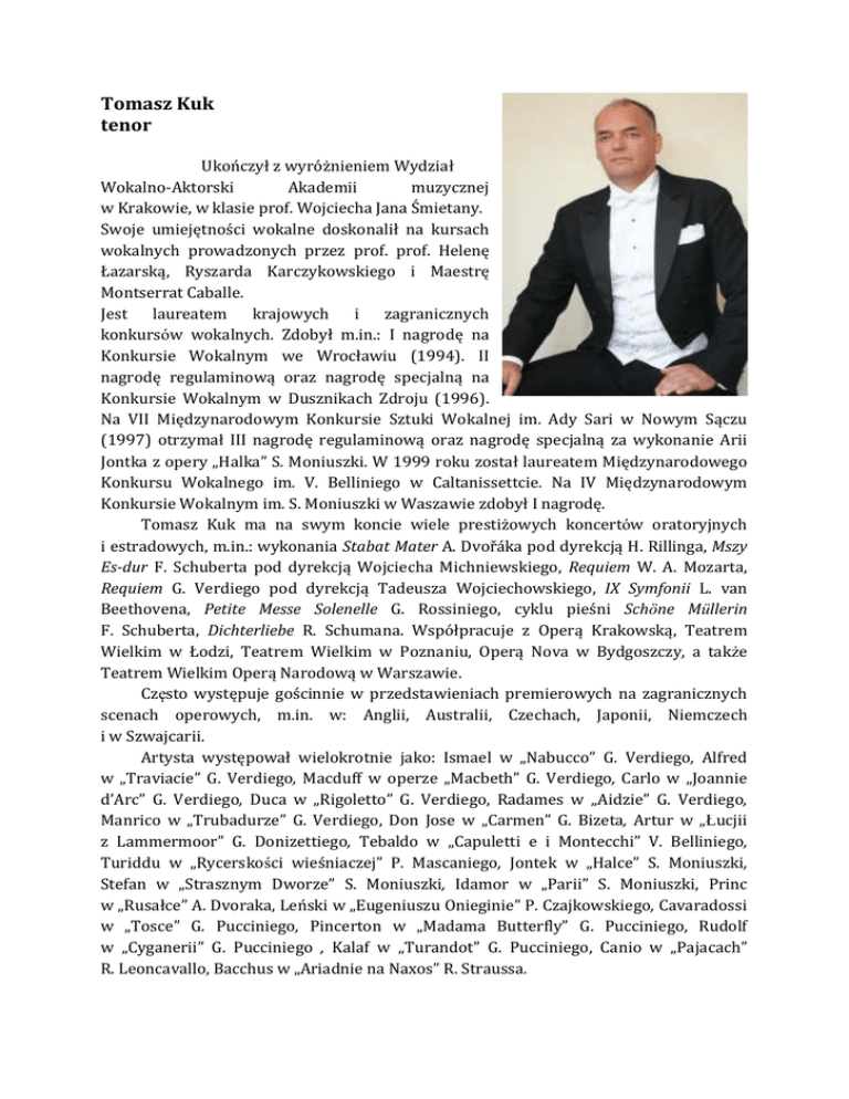 Tomasz Kuk tenor Ukończył z wyróżnieniem Wydział Wokalno-Aktorski Akademii muzycznej w Krakowie, w klasie prof. Wojciecha Jana Śmietany. Swoje umiejętności wokalne doskonalił na kursach wokalnych prowadzonych przez prof. prof. Helenę Łazarską, Ryszarda Karczykowskiego i Maestrę Montserrat Caballe. Jest laureatem krajowych i zagranicznych konkursów wokalnych. Zdobył m.in.: I nagrodę na Konkursie Wokalnym we Wrocławiu (1994). II nagrodę regulaminową oraz nagrodę specjalną na Konkursie Wokalnym w Dusznikach Zdroju (1996). Na VII Międzynarodowym Konkursie Sztuki Wokalnej im. Ady Sari w Nowym Sączu (1997) otrzymał III nagrodę regulaminową oraz nagrodę specjalną za wykonanie Arii Jontka z opery „Halka” S. Moniuszki. W 1999 roku został laureatem Międzynarodowego Konkursu Wokalnego im. V. Belliniego w Caltanissettcie. Na IV Międzynarodowym Konkursie Wokalnym im. S. Moniuszki w Waszawie zdobył I nagrodę. Tomasz Kuk ma na swym koncie wiele prestiżowych koncertów oratoryjnych i estradowych, m.in.: wykonania Stabat Mater A. Dvořáka pod dyrekcją H. Rillinga, Mszy Es-dur F. Schuberta pod dyrekcją Wojciecha Michniewskiego, Requiem W. A. Mozarta, Requiem G. Verdiego pod dyrekcją Tadeusza Wojciechowskiego, IX Symfonii L. van Beethovena, Petite Messe Solenelle G. Rossiniego, cyklu pieśni Schöne Müllerin F. Schuberta, Dichterliebe R. Schumana. Współpracuje z Operą Krakowską, Teatrem Wielkim w Łodzi, Teatrem Wielkim w Poznaniu, Operą Nova w Bydgoszczy, a także Teatrem Wielkim Operą Narodową w Warszawie. Często występuje gościnnie w przedstawieniach premierowych na zagranicznych scenach operowych, m.in. w: Anglii, Australii, Czechach, Japonii, Niemczech i w Szwajcarii. Artysta występował wielokrotnie jako: Ismael w „Nabucco” G. Verdiego, Alfred w „Traviacie” G. Verdiego, Macduff w operze „Macbeth” G. Verdiego, Carlo w „Joannie d’Arc” G. Verdiego, Duca w „Rigoletto” G. Verdiego, Radames w „Aidzie” G. Verdiego, Manrico w „Trubadurze” G. Verdiego, Don Jose w „Carmen” G. Bizeta, Artur w „Łucjii z Lammermoor” G. Donizettiego, Tebaldo w „Capuletti e i Montecchi” V. Belliniego, Turiddu w „Rycerskości wieśniaczej” P. Mascaniego, Jontek w „Halce” S. Moniuszki, Stefan w „Strasznym Dworze” S. Moniuszki, Idamor w „Parii” S. Moniuszki, Princ w „Rusałce” A. Dvoraka, Leński w „Eugeniuszu Onieginie” P. Czajkowskiego, Cavaradossi w „Tosce” G. Pucciniego, Pincerton w „Madama Butterfly” G. Pucciniego, Rudolf w „Cyganerii” G. Pucciniego , Kalaf w „Turandot” G. Pucciniego, Canio w „Pajacach” R. Leoncavallo, Bacchus w „Ariadnie na Naxos” R. Straussa.