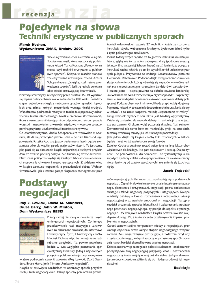 recenzja recenzja Pojedynek na słowa Techniki erystyczne w publicznych sporach Marek Kochan, Wydawnictwo ZNAK, Kraków 2005 BTPWP^TíeXTPYTčZNSZÛYTPeXTPYTčZ^TíYTN ?Z[TP]b^eLXdĦWV_Ç]LYL]e`NL^Tí[ZWPV _`]ePV^TÙŇVT8L]VL6ZNSLYLk;ZUPOdYPVYL ^čZbL NedWT _PNSYTVT P]d^_dNeYP b [`MWTNe YdNS ^[Z]LNSu 6^TÙŇVL b eL^LOeTP ^_LYZbT eMPWP_]deZbLYP ]ZebTYTíNTP OeTPčVL ,]_`]L >NSZ[PYSL`P]L k0]d^_dVL NedWT ^e_`VL []Z bLOePYTL^[Z]Çbu5PĦWT^TíUPOYLV[Z]ÇbYL ZMTPV^TÙŇVTYL^`bLUÙ^TíObLbYTZ^VT ;TP]b^ed^X`_YTPU^edŇPNed_PWYTNd[]ePeZ^_L_YTP WL_bd]LŅYTP ^TíeP[^`WT>NSZ[PYSL`P]XLb^ZMTPO`NSLC4CbTPV`ĥbTLONed Z_dX]ZeM`OZbLYdUíedVeXYÇ^_bPXNd_L_Çb]edX^VTNSTR]PN VTNS Z]Le eOLYTL V_Ç]dNS e]Ze`XTPYTP bdXLRL YTPečPU P]`OdNUT B^[ÇčNeP^Yd[ZO]íNeYTV]P_Z]dVT_Z_]ZNSí_LVT[L[TP]ZbdZO[Z bTPOYTV_PV^_`TY_P]YP_ZbPRZ6]Ç_VTP]ePNeZbP^QZ]X`čZbLYTL TVZYdeZeYLNePYTLXTVTP]`UÙNdXTOZZO[ZbTPOYTNS^_]ZYT[]ePOP b^ed^_VTXYL^_LbTPYTPYLbL]_ZĦNT`Ňd_VZbPwb^ed^_VZ_Z[]ed [ZXTYL[]edULeYd`Ňd_VZbYTVZbTTY_P]QPU^^_]ZYdbbb .Z NSL]LV_P]d^_dNeYP OeTPčZ >NSZ[PYSL`P]L b[]LbOeTP e Z[Z ]LXTLWPOL^Tí[]ePNed_LÛUP^eNePT OeTĦw[Z"WL_LNSZOUPRZ [Zb^_LYTL6^TÙŇVL6ZNSLYLU`Ň[Z^TPOPXYL^_`WL_LNSMíOeTPe]Z e`XTLčL_dWVZOWLbÙ^VTPURL]^_VT[L^UZYL_ÇbST^_Z]TT?ZUP^_NPYL ULVÙ[čLNT^TíeLZV]L^ePYTPV^TÙŇVTYLUML]OeTPULV_`LWYdXT[]edVčL OLXTePĦbTL_VL[ZW^VTPU[ZWT_dVT,WP_]`OYZ^TíOeTbTÛL`_Z]ZbT 9L^e^NPYL[ZWT_dNeYLbdOLUP^TíTOPLWYdXWLMZ]L_Z]T`XZM^P]bL NUT ^_Z^ZbLYTL NSbd_Çb T XP_ZO P]d^_dNeYdNS EYLUOeTPXd bTíN b V^TÙŇNP eL]ÇbYZ b^[ZXTYVT e []PedOPYNVTPU OPML_d BLčí^L 6bLĦYTPb^VT ULV T UP^eNeP RZ]ÙNP Q]LRXPY_d ^_PYZR]LXÇb []LN Podstawy negocjacji Roy J. Lewicki, David M. Saunders, Bruce Barry, John W. Minton, Dom Wydawniczy REBIS ;ZWLNd ]LNePU YTP ^čdYÙ b ĦbTPNTP eP ^bdNS `XTPUí_YZĦNT YPRZNULNdUYdNS .Z TYYPRZ []ePO^_LbTNTPWP YLNUT _]LOdNdUYTP `eYLbL YdNSeLZMOL]eZYP^XdVLčVÙOZTY_P]P^Çb% 7PbLY_dUNedNdņdOeT.STďNedNdNedNSZÛMd 3TYO`^T/ZM]ePbTíNŇPTb_PU^QP]ePYLO ]LMTLXd eLWPRčZĦNT 9L [PbYZ []edOL_YP MíOeTP b _dX beRWíOeTP [ZeYLbLYTP ^[P NULWT^_dNeYPUWT_P]L_`]d5POYÙe YLUYZb^edNS [ZedNUTYL[ZW^VTX]dYV`UP^_Z[]LNZbdbLYd bčLĦYTP [ZO]íNeYTV NebÇ]VT L`_Z]Çb =Zd 7PbTNVT /LaTO >L`Y OP]^-]`NP3L]]d5ZYS8TY_ZYk;ZO^_LbdYPRZNULNUTu 6^TÙŇVL b OeTPbTíNT` ]ZeOeTLčLNS b ZM]LeZbd ^[Z^ÇM []edMWTŇL T^_Z_íT_]PĦÛYPRZNULNUTZ]Le`VLe`UP^[Z^ZMd[]ePčLXLYTL[]ZMWP " VZXT^UT Z]WPYZb^VTPU ČÙNeYTP " _PNSYTV w VLŇOL eP ^_Z^ZbYÙ TY^_]`VNUÙ `ŇdNTL beMZRLNZYÙ V]bT^_dX ŇdNTZbdX NSZÛ _dWVZ eŇdNTL[ZWT_dNeYPRZ[]edVčLOPX 8ZŇYLMdčZMdb]íNeYL[T^LÛŇP_ZRZ_ZbdTY^_]`V_LŇOWLXLYT[` WL_Z]LROdMdYTP_ZŇPL`_Z]eLMPe[TPNedč^Tí[ZOZMYTPe]P^e_Ù ULV`NedYTč_ZbNePĦYTPU>NSZ[PYSL`P]bdULĦYTPYTLXTŇP[Z]íNeYd TY^_]`V_LŇYL[T^LčbčLĦYTP[Z_ZMdNed_PWYTV`XTLč`YTVLÛP]d^_dNe YdNS [`čL[PV ;]ed[ZXTYL _Z YLOeTPUP VZY^_]`V_Z]Çb [T^_ZWP_` .ZW_XZOPW;PLNPXLVP];ZOZMYZOeTíVT^bPU[Z]íNeYZĦNTXTLčZY ^č`ŇdÛZNS]ZYTP_dNSV_Ç]edZMLbTLUÙ^TíYL[LOÇbwbV]Ç_NPUPO YLV^_Lč^Tí[ZO^_LbZbdXYL]eíOeTPXMLYOeTZ]ÇbTeLVL[TZ]Çb 4UP^eNePUPOYZwV^TÙŇVL[ZbTYYLYLZVčLONPeLbTP]LÛMLYOP]ZWí% kYTPb^VLeLYPOWL_dNSV_Ç]edbTP]eÙbNed^_ZĦÛ[ZWT_dVTu;Z[]ePNed _LYT`UPU_]`OYZMíOeTPMZbTPXOPWPV_ZbLÛ^Tí`]ZVLXTOPML_d[ZWT _dNeYPU;ZONeL^ZM^P]bLNUTXTXZbZWTMíOÙ[]edNSZOeTčdOZRčZbd Q]LRXPY_dV^TÙŇVT,_ZNed_PWYTVOZ^_]ePŇP_PNSYTVík^e`VLYTLOeT`]d b NLčdXu L _Z eYÇb ]Ze[ZeYL XP_ZOí kb[`^eNePYTL b XLWTYdu /]`RT bYTZ^PV [čdYÙNd e ZM` WPV_`] UP^_ ML]OeTPU Z[_dXT^_dNeYd BTPWP ^Tí eXTPYTčZ LWP XP_ZOd OPML_d T XLYT[`WLNUT eYLYP UP^e NeP^_L]ZŇd_YdX2]PVZXbNTÙŇ[ZeZ^_LUÙLV_`LWYP9L^T^PUXZbT /PXZ^_PYP^T _LV ^LXZ MZbTPX XLYT[`W`UÙ R]LUÙ YL PXZNULNS _`XLYTÙeXTPYTLUÙ_PXL_dULVTNS^_L]ZŇd_YT[Z[]ePOYTNd 5PĦWT UPOYLV OeTíVT _PU V^TÙŇNP NSZÛMd VTWV` e]ZMTZYdNS b MLWZYL MíOeTPXYTPU_ZU`Ň^[PčYTčLZYL^bZUÙQ`YVNUí /eTPčVZ 6ZNSLYL [ZbTYYZ eZ^_LÛ bNTÙRYTí_P YL WT^_í WPV_`] ZMZ bTÙeVZbdNSOWLVLŇOPRZV_Z[L]L^Tí^čZbPXTOPML_Ù/WL[ZWT_d VÇbwOZ[]ePÛbTNePYTLOWLOZ]LONÇbwOZ^d^_PXL_deLNUTLOWL ebdVčdNSeULOLNedNSWPMLwOZ`[]ed_ZXYTPYTLŇPYTPV_Ç]P]ePNed YTPeXTPYTčd^TíZONeL^Çb^_L]ZŇd_YdNSTYTPeXTPYTÙ^TíU`ŇNSdML YTROd Jacek Trębecki XÇbYPRZNULNdUYdNS;TP]b^eP]ZeOeTLčd^V`[TLUÙ^TíYL[ZO^_LbLNS YPRZNULNUT.ed_PWYTVOZbTP^Tí^[Z]ZZ`^_LWLYT`eLV]P^`_PXL_dNe YPRZ[WLYZbLYT`T []edRZ_ZbLYT`YPRZNULNUT[ZeYL[ZO^_LbZbP ^_]L_PRTP T _LV_dVT YPRZNULNUT [ZedNdUYdNS T TY_PR]`UÙNdNS 6ZWPUYP ]ZeOeTLčd _]LV_`UÙ Z VbP^_TT ]Ze[ZeYLYTL T TY_P][]P_LNUT ^d_`LNUT YPRZNULNdUYPU Z]Le L^[PVNTP PXZNUZYLWYdX YPRZNULNUT 9L^_í[Yd ]ZeOeTLč[]PePY_`UP^[Z^ZMdTOPY_dQTVLNUTTbdVZ]ed^_LYTL[Z^TLOL YPRZ[Z_PYNULč`YPRZNULNdUYPRZMd[]ePUĦÛOZL^[PV_`P_dNeYPRZ YPRZNULNUTB VZWPUYdNS]ZeOeTLčLNSV^TÙŇVLZXLbTLVbP^_TPXTí OedYL]ZOZbPRZ;=L_LVŇP^[Z^ZMd[]ePčLXdbLYTLTX[L^`T[]Z MWPXÇbbYPRZNULNULNS .LčZĦÛ^_LYZbT ^[ÇUYP VZX[PYOT`X bTPOed Z YPRZNULNULNS []Z bLOeÙN Ned_PWYTVL []ePe VZWPUYP ^_Z[YTP YPRZNULNdUYPRZ b_LUPX YTNePYTL9L`bLRíeL^č`R`UP[]Z^_dUíedVL ebčL^eNeL[]edVčLOd eŇdNTLNZOeTPYYPRZV_Ç]dXTL`_Z]edb[]ed^_í[Yd^[Z^ÇMZM]L e`UÙYLbP_ML]OeTPU^VZX[WTVZbLYPL^[PV_dYPRZNULNUT 6^TÙŇVíXZŇYLbTíN^eNePRÇWYTP[ZWPNTÛ^_`OPY_ZXTZ^ZMZX]Ze [ZNedYLUÙNdX ^bÙ YPRZNULNdUYÙ []edRZOí NSZÛ T OZĦbTLONePYT YPRZNUL_Z]ed _LVŇP eYLUOÙ b YTPU NZĦ OWL ^TPMTP 5POYdX ^čZbPX% UP^__ZOZM]d^[Z^ÇMYLeMWTŇPYTP^TíOZXTíOedYL]ZOZbPUWTRTYPRZ NULNdUYPU Redakcja
