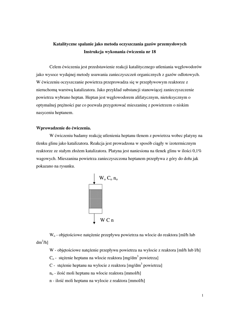 Katalityczne spalanie jako metoda oczyszczania gazów przemysłowych Instrukcja wykonania ćwiczenia nr 18 Celem ćwiczenia jest przedstawienie reakcji katalitycznego utleniania węglowodorów jako wysoce wydajnej metody usuwania zanieczyszczeń organicznych z gazów odlotowych. W ćwiczeniu oczyszczanie powietrza przeprowadza się w przepływowym reaktorze z nieruchomą warstwą katalizatora. Jako przykład substancji stanowiącej zanieczyszczenie powietrza wybrano heptan. Heptan jest węglowodorem alifatycznym, nietoksycznym o optymalnej prężności par co pozwala przygotować mieszaninę z powietrzem o niskim nasyceniu heptanem. Wprowadzenie do ćwiczenia. W ćwiczeniu badamy reakcję utlenienia heptanu tlenem z powietrza wobec platyny na tlenku glinu jako katalizatora. Reakcja jest prowadzona w sposób ciągły w izotermicznym reaktorze ze stałym złożem katalizatora. Platyna jest naniesiona na tlenek glinu w ilości 0,1% wagowych. Mieszanina powietrza zanieczyszczona heptanem przepływa z góry do dołu jak pokazano na rysunku. Wo Co no WCn Wo - objętościowe natężenie przepływu powietrza na wlocie do reaktora [ml/h lub dm3/h] W - objętościowe natężenie przepływu powietrza na wylocie z reaktora [ml/h lub l/h] Co - stężenie heptanu na wlocie reaktora [mg/dm3 powietrza] C - stężenie heptanu na wylocie z reaktora [mg/dm3 powietrza] no - ilość moli heptanu na wlocie reaktora [mmol/h] n - ilość moli heptanu na wylocie z reaktora [mmol/h] 1 W reaktorze na powierzchni katalizatora przebiega reakcja: C7H16 + 11O2 → 7CO2 + 8 H2O (1) Temperatura w reaktorze, objętościowe natężenie przepływu powietrza, stężenie heptanu utrzymywane jest na stałym poziomie. Dla tego sposobu prowadzenia reakcji charakterystyczne jest, że gdy warunki reakcji ustabilizują się, stopień przemiany nie zmienia się w czasie. Zależy on od czasu przebywania substratu w reaktorze. Stopień konwersji heptanu (α) można obiczyć z wzoru (2): α = (no – n)/ no = (Co – C)/Co (2) Czas przebywania heptanu w reaktorze (τ) można obliczyć z równania (3): τ = Vk / Vo [s] (3) Vk = objętość katalizatora[ml] Vo = szybkość objętościowa heptanu w jednostkach objętości na jednostkę czasu[ml.s-1]. Wykreślając wykres zależności stopnia konwersji od czasu przebywania substratu w reaktorze możemy wyznaczyć równanie reaktorowe α = f(τ), z którego można wyznaczyć średni czas przebywania reagentów w reaktorze konieczny dla uzyskania stopnia konwersji α. Opis ćwiczenia Reakcja utleniania węglowodoru ( heptanu) prowadzona jest w kwarcowym, przepływowym reaktorze z nieruchomą warstwą katalizatora. Reaktor jest ogrzewany elektrycznie. Katalizatorem jest platyna naniesiona na tlenek glinu w ilości 0,1% masowego. Wielkość ziarna katalizatora 2 – 3 mm. Waga katalizatora 8g, objętość 10 ml. Nad katalizatorem umieszczono kawałki kwarcu i stanowią one strefę wstępnego ogrzewania powietrza wprowadzanego do reaktora od góry. Powietrze przed wejściem do reaktora przepływa przez płuczkę z heptanem i regulując szybkość przepływu zmieniamy stężenie heptanu w powietrzu. Gazy po wyjściu z reaktora są chłodzone w chłodnicy z płaszczem wodnym oraz w wymrażalniku ze stałym CO2 w celu wykroplenia wody powstającej w reakcji utleniania heptanu. 2 Metody analityczne Zawartość heptanu w strumieniu wchodzącym do reaktora i wychodzącym z reaktora jest określana metodą chromatografii gazowej na chromatografie firmy Hewlett-Packard GC 6859. Próbki powietrza do analizy są pobierane bezpośrednio z układu reakcyjnego strzykawką do gazów i natychmiast nastrzykiwane do chromatografu. Wielkość próbki powietrza do analizy 0,5 ml. Zawartość heptanu w strumieniu powietrza obliczamy z równania x= y [mg/dm3] 526044 (4) gdzie: y – pole piku na chromatogramie x – zawartość heptanu mg /dm3 powietrza Zestaw aparatury. Na rysunku 1 przedstawiono zestaw aparatury dla ćwiczenia 18. Reakcja prowadzona jest w izotermicznym, reaktorze (1) z nieruchomym złożem katalizatora (2). Temperatura wewnątrz reaktora jest mierzona za pomocą termopary (4) i kontrolowana za pomocą programatora temperatury (3). Powietrze pompowane pompką (8) przepływa przez płuczkę z heptanem(7) i po zmieszaniu z powietrzem dodatkowym z pompki (17) wchodzi do reaktora. Gazy poreakcyjne chłodzone są w chłodnicy (16) i wymrażalniku (18) ze stałym CO2 a następnie kierowane są przez płuczkę (12) do kanału wyciągowego. W erlenmajerce (19) zbierana jest woda powstająca w reakcji. Próbki powietrza do analiz pobiera się przez septy (6) i (11). Po reakcji katalizator jest przepłukiwany azotem z balona (15). 3 Rysunek 1. Schemat aparatury do ćwiczenia 18 1 2 3 4 5 6 7 8 9 Reaktor Złoże katalizatora Programator temperayury Termopara Kran dwudrożny Biureta gazowa Płuczka z węglowodorem Pompka powietrzna Kran trójdrożny 10 11 12 13 14 15 16 17 18 19 Rotametr Biureta gazowa Płuczka z olejem Kran dwudrożny Rotametr Balon z azotem Chłodnica Pompka powietrzna Wymrażalnik Erlenmajerka 4 Wykonanie ćwiczenia. 1. Zestaw aparatury jak na załączonym rysunku. 2. W reaktorze (1) znajduje się 10ml katalizatora Pt/Al2O3 0,1% wagowych (2). 3. Załączyć grzanie pieca do temperatury określonej przez asystenta prowadzącego. 4. Napełnić płuczkę (7) węglowodorem, zważyć i zamontować w zestawie. 5. Zważyć erlenmajerkę (19) i zamontować w zestawie. 6. Ustawić szybkość przepływu powietrza przez płuczkę oraz powietrza dodatkowego. 7. Strumień powietrza z heptanem skierować na złoże katalizatora otwierając kran 9 i 13. Zapisać natężenie przepływu wskazywane na dwóch rotametrach oraz godzinę rozpoczęcia reakcji. 8. Proces jest prowadzony przez czas określony przez asystenta. 9. Po upływie 10 – 15 min należy pobierać strzykawką próbkę z biurety gazowej nr (6) i (11) i wykonać analizę pobranej próbki na chromatografie gazowym. 10. Po upływie wyznaczon