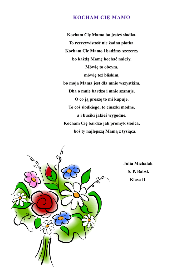 KOCHAM CIĘ MAMO Kocham Cię Mamo bo jesteś słodka. To rzeczywistość nie żadna plotka. Kocham Cię Mamo i bądźmy szczerzy bo każdą Mamę kochać należy. Mówię to obcym, mówię też bliskim, bo moja Mama jest dla mnie wszystkim. Dba o mnie bardzo i mnie szanuje. O co ją proszę to mi kupuje. To coś słodkiego, to ciuszki modne, a i buciki jakieś wygodne. Kocham Cię bardzo jak promyk słońca, boś ty najlepszą Mamą z tysiąca. Julia Michalak S. P. Babsk Klasa II