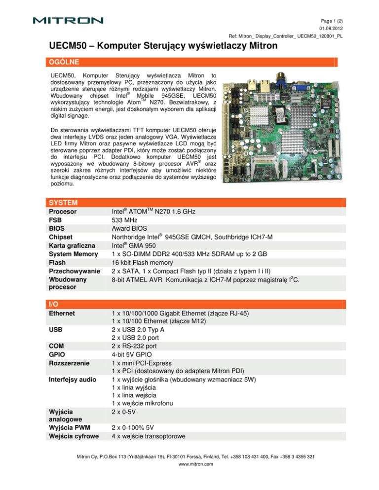Page 1 (2) 01.08.2012 Ref: Mitron_ Display_Controller_ UECM50_120801_PL UECM50 – Komputer Sterujący wyświetlaczy Mitron OGÓLNE UECM50, Komputer Sterujący wyświetlacza Mitron to dostosowany przemysłowy PC, przeznaczony do użycia jako urządzenie sterujące różnymi rodzajami wyświetlaczy Mitron. Wbudowany chipset Intel® Mobile 945GSE, UECM50 wykorzystujący technologie AtomTM N270. Bezwiatrakowy, z niskim zużyciem energii, jest doskonałym wyborem dla aplikacji digital signage. Do sterowania wyświetlaczami TFT komputer UECM50 oferuje dwa interfejsy LVDS oraz jeden analogowy VGA. Wyświetlacze LED firmy Mitron oraz pasywne wyświetlacze LCD mogą być sterowane poprzez adapter PDI, który może zostać podłączony do interfejsu PCI. Dodatkowo komputer UECM50 jest ® wyposażony we wbudowany 8-bitowy procesor AVR oraz szeroki zakres różnych interfejsów aby umożliwić niektóre funkcje diagnostyczne oraz podłączenie do systemów wyższego poziomu. SYSTEM Procesor FSB BIOS Chipset Karta graficzna System Memory Flash Przechowywanie Wbudowany procesor Intel® ATOMTM N270 1.6 GHz 533 MHz Award BIOS Northbridge Intel® 945GSE GMCH, Southbridge ICH7-M Intel® GMA 950 1 x SO-DIMM DDR2 400/533 MHz SDRAM up to 2 GB 16 kbit Flash memory 2 x SATA, 1 x Compact Flash typ II (działa z typem I i II) 8-bit ATMEL AVR Komunikacja z ICH7-M poprzez magistralę I2C. I/O Ethernet USB COM GPIO Rozszerzenie Interfejsy audio Wyjścia analogowe Wyjścia PWM Wejścia cyfrowe 1 x 10/100/1000 Gigabit Ethernet (złącze RJ-45) 1 x 10/100 Ethernet (złącze M12) 2 x USB 2.0 Typ A 2 x USB 2.0 port 2 x RS-232 port 4-bit 5V GPIO 1 x mini PCI-Express 1 x PCI (dostosowany do adaptera Mitron PDI) 1 x wyjście głośnika (wbudowany wzmacniacz 5W) 1 x linia wyjścia 1 x linia wejścia 1 x wejście mikrofonu 2 x 0-5V 2 x 0-100% 5V 4 x wejście transoptorowe Mitron Oy, P.O.Box 113 (Yrittäjänkaari 19), FI-30101 Forssa, Finland, Tel. +358 108 431 400, Fax +358 3 4355 321 www.mitron.com Page 2 (2) 01.08.2012 Ref: Mitron_ Display_Controller_ UECM50_120801_PL Przekaźnik I2 C JTAG 1 x otwarty dren 1 x zewnętrzny I2C 1 x JTAG INTERFEJSY WYŚWIETLACZA Pamięć grafiki LVDS VGA Kontrola inwertora podświetlenia Moduł kontroli pasywnego LCD Moduł kontroli LED Multiplex drive / static drive Dzieli pamięć systemową do 224 MB 1 x dwukanałowy 18/24 bit LVDS do rozdzielczości 1920 x 1200 (WUXGA 16:10) 1 x dwukanałowy 18 bit LVDS do rozdzielczości 1600 x 1200 (UXGA 4:3) 1 x analogowa VGA do rozdzielczości 2048 x 1536 (QXGA 4:3), złącze D15 2 x kontrola jasności dla inwertorów CCFL Przez interfejs PCI z adapterem Mitron PDI Przez interfejs PCI z adapterem Mitron PDI MECHANIKA I ŚRODOWISKO Wejście zasilania Temperatura pracy Temperatura przechowywania Wilgotność Wymiary Zużycie energii 9-28 V DC 0°C .. 60°C pełen zakres działania -40°C .. 0°C ograniczone działanie -40°C .. 85°C 10% .. 90% bez skraplania 170 mm x 200 mm, Typowe zużycie 0.55 A @ +24V z systemem operacyjnym Linux Mitron Oy, P.O.Box 113 (Yrittäjänkaari 19), FI-30101 Forssa, Finland, Tel. +358 108 431 400, Fax +358 3 4355 321 www.mitron.com