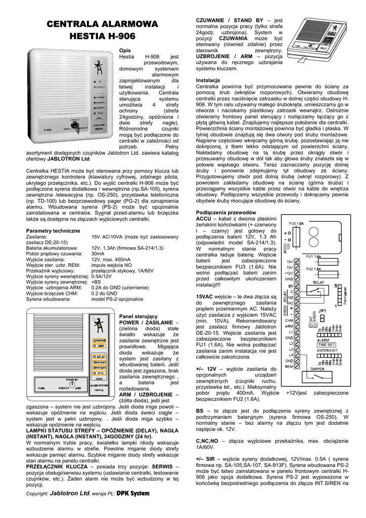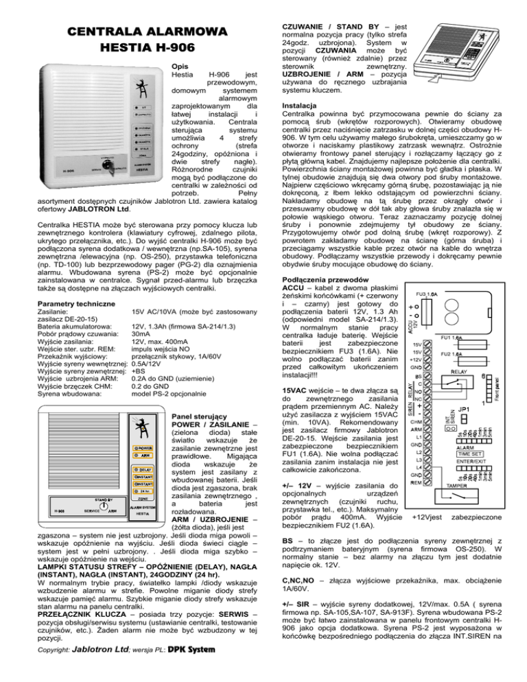 CENTRALA ALARMOWA HESTIA H-906 Opis Hestia H-906 jest przewodowym, domowym systemem alarmowym zaprojektowanym dla łatwej instalacji i użytkowania. Centrala sterująca systemu umożliwia 4 strefy ochrony (strefa 24godziny, opóźniona i dwie strefy nagłe). Różnorodne czujniki mogą być podłączone do centralki w zależności od potrzeb. Pełny asortyment dostępnych czujników Jablotron Ltd. zawiera katalog ofertowy JABLOTRON Ltd. Centralka HESTIA może być sterowana przy pomocy klucza lub zewnętrznego kontrolera (klawiatury cyfrowej, zdalnego pilota, ukrytego przełącznika, etc.). Do wyjść centralki H-906 może być podłączona syrena dodatkowa / wewnętrzna (np.SA-105), syrena zewnętrzna /elewacyjna (np. OS-250), przystawka telefoniczna (np. TD-100) lub bezprzewodowy pager (PG-2) dla oznajmienia alarmu. Wbudowana syrena (PS-2) może być opcjonalnie zainstalowana w centralce. Sygnał przed-alarmu lub brzęczka także są dostępne na złączach wyjściowych centralki. Parametry techniczne Zasilanie: zasilacz DE-20-15) Bateria akumulatorowa: Pobór prądowy czuwania: Wyjście zasilania: Wejście ster. uzbr. REM: Przekaźnik wyjściowy: Wyjście syreny wewnętrznej: Wyjście syreny zewnętrznej: Wyjście uzbrojenia ARM: Wyjście brzęczek CHM: Syrena wbudowana: 15V AC/10VA (może być zastosowany 12V, 1.3Ah (firmowa SA-214/1.3) 30mA 12V, max. 400mA impuls wejścia NO przełącznik stykowy, 1A/60V 0.5A/12V +BS 0.2A do GND (uziemienie) 0.2 do GND model PS-2 opcjonalnie Panel sterujący POWER / ZASILANIE – (zielona dioda) stałe światło wskazuje że zasilanie zewnętrzne jest prawidłowe. Migająca dioda wskazuje że system jest zasilany z wbudowanej baterii. Jeśli dioda jest zgaszona, brak zasilania zewnętrznego , a bateria jest rozładowana. ARM / UZBROJENIE – (żółta dioda), jeśli jest zgaszona – system nie jest uzbrojony. Jeśli dioda miga powoli – wskazuje opóźnienie na wyjściu. Jeśli dioda świeci ciągle – system jest w pełni uzbrojony. . Jeśli dioda miga szybko – wskazuje opóźnienie na wejściu. LAMPKI STATUSU STREFY – OPÓŹNIENIE (DELAY), NAGŁA (INSTANT), NAGŁA (INSTANT), 24GODZINY (24 hr). W normalnym trybie pracy, światełko lampki /diody wskazuje wzbudzenie alarmu w strefie. Powolne miganie diody strefy wskazuje pamięć alarmu. Szybkie miganie diody strefy wskazuje stan alarmu na panelu centralki. PRZEŁĄCZNIK KLUCZA – posiada trzy pozycje: SERWIS – pozycja obsługi/serwisu systemu (ustawianie centralki, testowanie czujników, etc.). Żaden alarm nie może być wzbudzony w tej pozycji. Copyright: Jablotron Ltd; wersja PL: DPK System CZUWANIE / STAND BY – jest normalna pozycja pracy (tylko strefa 24godz. uzbrojona). System w pozycji CZUWANIA może być sterowany (również zdalnie) przez sterownik zewnętrzny. UZBROJENIE / ARM – pozycja używana do ręcznego uzbrajania systemu kluczem. Instalacja Centralka powinna być przymocowana pewnie do ściany za pomocą śrub (wkrętów rozporowych). Otwieramy obudowę centralki przez naciśnięcie zatrzasku w dolnej części obudowy H906. W tym celu używamy małego śrubokręta, umieszczamy go w otworze i naciskamy plastikowy zatrzask wewnątrz. Ostrożnie otwieramy frontowy panel sterujący i rozłączamy łączący go z płytą główną kabel. Znajdujemy najlepsze położenie dla centralki. Powierzchnia ściany montażowej powinna być gładka i płaska. W tylnej obudowie znajdują się dwa otwory pod śruby montażowe. Najpierw częściowo wkręcamy górną śrubę, pozostawiając ją nie dokręconą, z łbem lekko odstającym od powierzchni ściany. Nakładamy obudowę na tą śrubę przez okrągły otwór i przesuwamy obudowę w dół tak aby głowa śruby znalazła się w połowie wąskiego otworu. Teraz zaznaczamy pozycję dolnej śruby i ponownie zdejmujemy tył obudowy ze ściany. Przygotowujemy otwór pod dolną śrubę (wkręt rozporowy). Z powrotem zakładamy obudowę na ścianę (górna śruba) i przeciągamy wszystkie kable przez otwór na kable do wnętrza obudowy. Podłączamy wszystkie przewody i dokręcamy pewnie obydwie śruby mocujące obudowę do ściany. Podłączenia przewodów ACCU – kabel z dwoma płaskimi żeńskimi końcówkami (+ czerwony i – czarny) jest gotowy do podłączenia baterii 12V, 1.3 Ah (odpowiedni model SA-214/1.3). W normalnym stanie pracy centralka ładuje baterię. Wejście baterii jest zabezpieczone bezpiecznikiem FU3 (1.6A). Nie wolno podłączać baterii zanim przed całkowitym ukończeniem instalacji!!! 15VAC wejście – te dwa złącza są do zewnętrznego zasilania prądem przemiennym AC. Należy użyć zasilacza z wyjściem 15VAC (min. 10VA). Rekomendowany jest zasilacz firmowy Jablotron DE-20-15. Wejście zasilania jest zabezpieczone bezpiecznikiem FU1 (1.6A). Nie wolna podłączać zasilania zanim instalacja nie jest całkowicie zakończona. +/– 12V – wyjście zasilania do opcjonalnych urządzeń zewnętrznych (czujniki ruchu, przystawka tel., etc.). Maksymalny pobór prądu 400mA. Wyjście bezpiecznikiem FU2 (1.6A). +12Vjest zabezpieczone BS – to złącze jest do podłączenia syreny zewnętrznej z podtrzymaniem bateryjnym (syrena firmowa OS-250). W normalny stanie – bez alarmy na złączu tym jest dodatnie napięcie ok. 12V. C,NC,NO – złącza wyjściowe przekaźnika, max. obciążenie 1A/60V. +/– SIR – wyjście syreny dodatkowej, 12V/max. 0.5A ( syrena firmowa np. SA-105,SA-107, SA-913F). Syrena wbudowana PS-2 może być łatwo zainstalowana w panelu frontowym centralki H906 jako opcja dodatkowa. Syrena PS-2 jest wyposażona w końcówkę bezpośredniego podłączenia do złącza INT.SIREN na płycie głównej centralki. Jeśli syrena PS-2 jest podłączona maksymalny prąd na złączach +/- SIR jest tylko 0.3A. CHM – wyjście typu brzęczek, jest połączone do GND/ uziemienie (max. 0.2A/12V) w czasie opóźnienia na wejściu. Złącze to może być wykorzystane do zewnętrznego brzęczka przed-alarmu. Fi