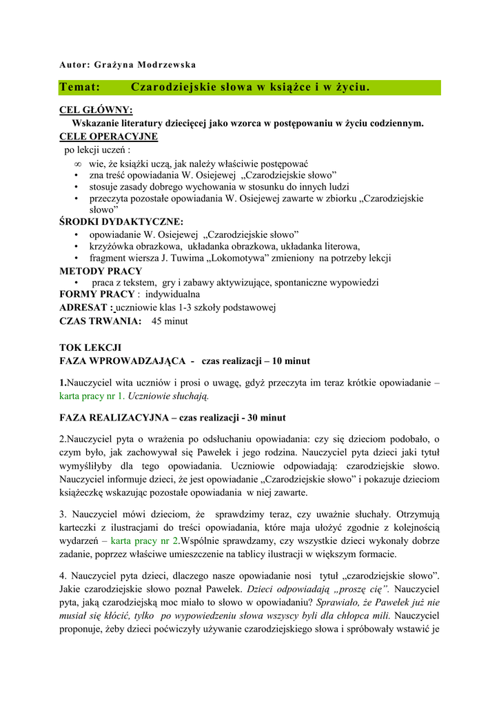 Autor: GraŜyna Modrzew ska Temat: Czarodziejskie słowa w ksiąŜce i w Ŝyciu. CEL GŁÓWNY: Wskazanie literatury dziecięcej jako wzorca w postępowaniu w Ŝyciu codziennym. CELE OPERACYJNE po lekcji uczeń : • wie, Ŝe ksiąŜki uczą, jak naleŜy właściwie postępować • zna treść opowiadania W. Osiejewej „Czarodziejskie słowo” • stosuje zasady dobrego wychowania w stosunku do innych ludzi • przeczyta pozostałe opowiadania W. Osiejewej zawarte w zbiorku „Czarodziejskie słowo” ŚRODKI DYDAKTYCZNE: • opowiadanie W. Osiejewej „Czarodziejskie słowo” • krzyŜówka obrazkowa, układanka obrazkowa, układanka literowa, • fragment wiersza J. Tuwima „Lokomotywa” zmieniony na potrzeby lekcji METODY PRACY • praca z tekstem, gry i zabawy aktywizujące, spontaniczne wypowiedzi FORMY PRACY : indywidualna ADRESAT : uczniowie klas 1-3 szkoły podstawowej CZAS TRWANIA: 45 minut TOK LEKCJI FAZA WPROWADZAJĄCA - czas realizacji – 10 minut 1.Nauczyciel wita uczniów i prosi o uwagę, gdyŜ przeczyta im teraz krótkie opowiadanie – karta pracy nr 1. Uczniowie słuchają. FAZA REALIZACYJNA – czas realizacji - 30 minut 2.Nauczyciel pyta o wraŜenia po odsłuchaniu opowiadania: czy się dzieciom podobało, o czym było, jak zachowywał się Pawełek i jego rodzina. Nauczyciel pyta dzieci jaki tytuł wymyśliłyby dla tego opowiadania. Uczniowie odpowiadają: czarodziejskie słowo. Nauczyciel informuje dzieci, Ŝe jest opowiadanie „Czarodziejskie słowo” i pokazuje dzieciom ksiąŜeczkę wskazując pozostałe opowiadania w niej zawarte. 3. Nauczyciel mówi dzieciom, Ŝe sprawdzimy teraz, czy uwaŜnie słuchały. Otrzymują karteczki z ilustracjami do treści opowiadania, które maja ułoŜyć zgodnie z kolejnością wydarzeń – karta pracy nr 2.Wspólnie sprawdzamy, czy wszystkie dzieci wykonały dobrze zadanie, poprzez właściwe umieszczenie na tablicy ilustracji w większym formacie. 4. Nauczyciel pyta dzieci, dlaczego nasze opowiadanie nosi tytuł „czarodziejskie słowo”. Jakie czarodziejskie słowo poznał Pawełek. Dzieci odpowiadają „proszę cię”. Nauczyciel pyta, jaką czarodziejską moc miało to słowo w opowiadaniu? Sprawiało, Ŝe Pawełek juŜ nie musiał się kłócić, tylko po wypowiedzeniu słowa wszyscy byli dla chłopca mili. Nauczyciel proponuje, Ŝeby dzieci poćwiczyły uŜywanie czarodziejskiego słowa i spróbowały wstawić je w zdania na tablicy – karta pracy nr 3. Nauczyciel kolejno wiesza zdania, a uczniowie we właściwe miejsce wstawiają chmurkę z napisem „proszę cię”. Dwoje chętnych odgrywa przed klasą wypowiadanie prośby z uŜyciem „proszę cię” ze zwróceniem szczególnej uwagi na sposób wypowiadania. 5. Nauczyciel mówi dzieciom, Ŝe jest jeszcze inne czarodziejskie słowo, które teŜ ma wielką moc - poznają je po uzupełnieniu krzyŜówki. Uczniowie otrzymują karty pracy nr 4. Nauczyciel wiesza na tablicy krzyŜówkę wykonaną na brystolu, kolejni uczniowie podchodzą do tablicy i uzupełniają kratki. Pozostali sprawdzają poprawność haseł na swoich kartach. Rozwiązaniem krzyŜówki jest słowo „dziękuję”. Dzieci swobodnie wypowiadają się, kiedy naleŜy uŜywać „dziękuję”. 6. Jest jeszcze jedno waŜne słowo, którym moŜna naprawić róŜne krzywdy. Ma takŜe wielką, czarodziejską moc. Dzieci odpowiadają, Ŝe jest to „przepraszam” i przytaczają przykłady, kiedy je się stosuje. FAZA PODSUMOWUJACA – czas realizacji - 5 minut 7. Nauczyciel czyta dzieciom 3 wersy wiersza- karta pracy nr 5. Następnie mówi, Ŝe dowiedzą się, jakie waŜne towary są w lokomotywie po przejściu przez wszystkie połączone literki – karta pracy nr 6 (uczniowie losowo otrzymują obrazki, na których ukryte są hasła: proszę, dziękuję , przepraszam). Po odgadnięciu haseł, nauczyciel wiesza wierszyk na tablicy i kończy czytanie jego ostatnich wersów, uzupełnionych przez dzieci odgadniętymi hasłami. 8. Na zakończenie przypomina o sposobie wypowiadania czarodziejskich słów i zachęca dzieci do wykonania pracy domowej – pokolorowania obrazków z kart pracy nr 2 i 6 oraz poczytania z rodzicami ksiąŜeczki „Czarodziejskie słowo”, w której są równieŜ inne bardzo pouczające opowiadania. KARTA PRACY NR 1 Malutki staruszek o długiej, siwej brodzie siedział na ławce i końcem parasola kreślił na piasku jakieś znaki. - Niech się pan posunie – powiedział Pawełek i przysiadł na brzegu ławki. Staruszek posunął się, spojrzał na czerwoną, nadąsaną twarz chłopczyka i powiedział: - Coś ci się przydarzyło …. Pawełek rzucił spojrzenie z ukosa. – No to co ? A panu co do tego? - Mnie nic do tego. Ale, jak widzę, przed chwilą krzyczałeś, płakałeś i kłóciłeś się z kimś. - I jak jeszcze!- odburknął gniewnie Pawełek. – Na pewno niedługo zupełnie z domu ucieknę. - Uciekniesz ? - Ucieknę. Choćby przez Zośkę ucieknę. – Tu Pawełek zacisnął pięści. – O mały włos nie pobiłem się z nią teraz. Ani jednej farby nie chce dać. A sama ma ich tyle! - Nie chce dać? Ale z tego powodu uciekać nie warto. - Nie tylko przez to. Babcia za jedną marchewkę wypędziła mnie z kuchni…. Po prostu ścierką wypędziła! Pawełek aŜ sapał z oburzenia. - Głupstwo – powiedział staruszek – Jeden cię skrzyczy, a drugi pogłaszcze. -Nikt mnie nie pogłaszcze! – wykrzyknął Pawełek.- Brat łódką ma jechać, a mnie wziąć ze sobą nie chce. Ja mu mówię: lepiej weź mnie, bo i tak się nie odczepię, zabiorę wiosła i sam do łódki wlezę. Pawełek uderzył pięścią w ławkę i nagle umilkł. - No i cóŜ? Brat nie chce cię zabrać? - A dlaczego pan o wszystko pyta? Staruszek pogładził długą brodę. -Pragnę ci dopomóc. Jest takie jedno czarodziejski słowo. Pawełek aŜ usta otworzył. -Powiem ci to słowo. Ale pamiętaj: trzeba je mówić cichym głosem, patrząc prosto w oczy temu. Do kogo mówisz. Zapami