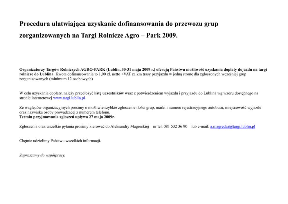 Procedura ułatwiająca uzyskanie dofinansowania do przewozu grup zorganizowanych na Targi Rolnicze Agro – Park 2009. Organizatorzy Targów Rolniczych AGRO-PARK (Lublin, 30-31 maja 2009 r.) oferują Państwu możliwość uzyskania dopłaty dojazdu na targi rolnicze do Lublina. Kwota dofinansowania to 1,00 zł. netto +VAT za km trasy przyjazdu w jedną stronę dla zgłoszonych wcześniej grup zorganizowanych (minimum 12 osobowych) W celu uzyskania dopłaty, należy przedłożyć listę uczestników wraz z potwierdzeniem wyjazdu i przyjazdu do Lublina wg wzoru dostępnego na stronie internetowej www.targi.lublin.pl Ze względów organizacyjnych prosimy o możliwie szybkie zgłoszenie ilości grup, marki i numeru rejestracyjnego autobusu, miejscowość wyjazdu oraz nazwiska osoby prowadzącej z numerem telefonu. Termin przyjmowania zgłoszeń upływa 27 maja 2009r. Zgłoszenia oraz wszelkie pytania prosimy kierować do Aleksandry Magreckiej nr tel. 081 532 36 90 Chętnie udzielimy Państwu wszelkich informacji. Zapraszamy do współpracy. lub e-mail: [email protected] Jak uzyskać dofinansowanie przyjazdu – krok po kroku 1. Do 27 maja 2009 r. należy zgłosić przyjazd zorganizowanej minimum 12 osobowej grupy autokarowej (zgłoszenia kierować prosimy do Aleksandry Magreckiej pod numerem telefonu 081 532 36 90 lub drogą mailową: [email protected] 2. W celu uzyskania dopłaty należy w dniu przyjazdu na targi przedłożyć: - listę uczestników wraz z potwierdzeniem (pieczątka) z miejscowości wyjazdu wg wzoru listy wycieczkowej - faktury od przewoźnika lub organizatora. Faktura VAT powinna być wystawiona na Międzynarodowe Targi Lubelskie S.A. (dane MTL: adres / NIP) – liczba kilometrów w jedną stronę x 1,00 zł/netto+VAT – sposób zapłaty – przelew na konto w terminie 14 dni od przedstawienia dokumentacji (faktury oraz listy wycieczkowej) (bez faktury VAT nie możemy udzielić dopłaty).. 3. Stoisko Międzynarodowych Targów Lubelskich przyjmujące zgłoszone wcześniej grupy oraz rozliczające wymagane dokumenty zgłoszeniowe zlokalizowane będzie na stronie www.targi.lublin.pl Po wysadzeniu zwiedzających na terenie MTL autokary kierowane będą na bezpłatny parking autokarowy na terenie tzw. Cukrowni, przy ul.Krochmalnej Dla łatwiejszej identyfikacji autokarów prosimy o zamieszczenie za szybą karty wjazdowej ( Lista wycieczkowa Stempel urzędu lub instytucji z miejscowości wyjazdu Stempel potwierdzający przybycie autokaru na tereny MTL Data………………………………… Organizator grupy- imię, nazwisko,adres,telefon................................................................................................................... ............................... ……………………………………………………………………………………………………………………………………………………………………… ….. Typ autokaru i numer rejestracyjny pojazdu…………………………………………………………………………………………………………………………….……………… .... Miejscowość wyjazdu……………………………………………..……………………………odległość w km (w jedną stronę ) ……………........…… ................................... Pow. Gosp. LP imię Nazwisko adres kod miasto 1 2 3 4 5 6 7 8 9 10 Zebrane dane zostaną wykorzystane dla celów marketingowych i statystycznych wyłącznie przez MTL S.A. i MTP Sp. z o.o. (hektary) zakres działalności hodowla zwierząt Uprawa (jakie?) (rodzaj) Podpis