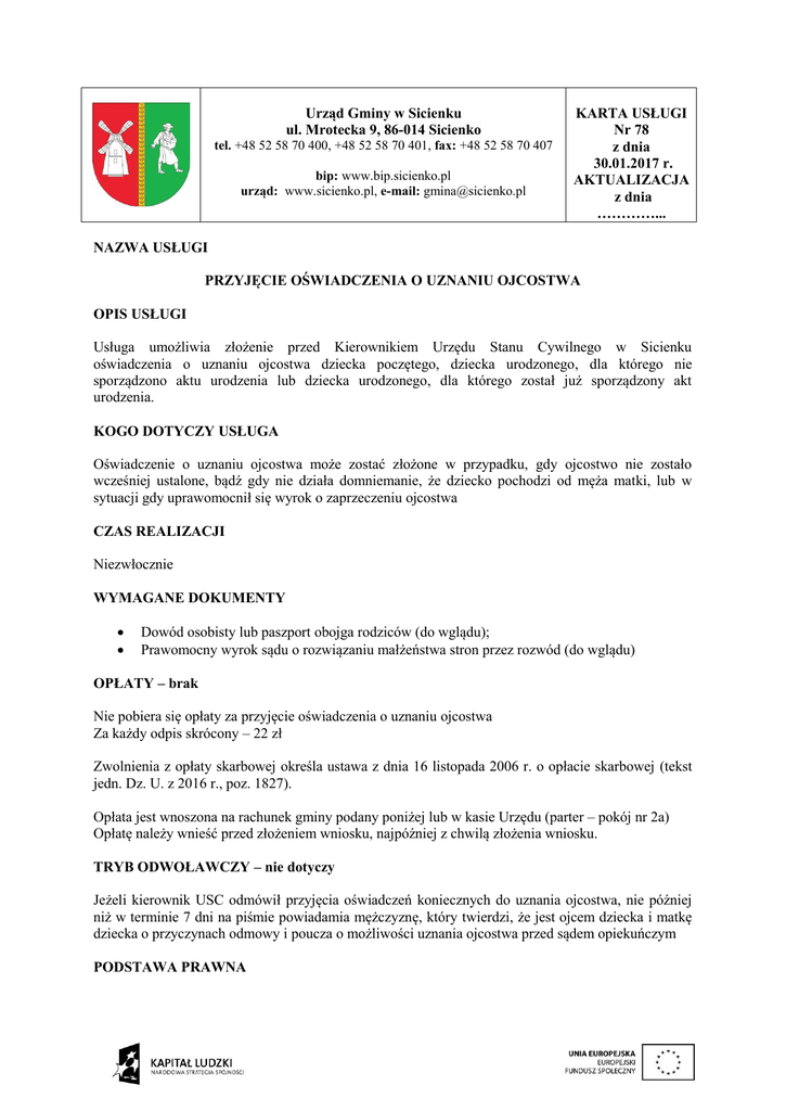 Urząd Gminy w Sicienku ul. Mrotecka 9, 86-014 Sicienko tel. +48 52 58 70 400, +48 52 58 70 401, fax: +48 52 58 70 407 bip: www.bip.sicienko.pl urząd: www.sicienko.pl, e-mail: [email protected] KARTA USŁUGI Nr 78 z dnia 30.01.2017 r. AKTUALIZACJA z dnia …………... NAZWA USŁUGI PRZYJĘCIE OŚWIADCZENIA O UZNANIU OJCOSTWA OPIS USŁUGI Usługa umożliwia złożenie przed Kierownikiem Urzędu Stanu Cywilnego w Sicienku oświadczenia o uznaniu ojcostwa dziecka poczętego, dziecka urodzonego, dla którego nie sporządzono aktu urodzenia lub dziecka urodzonego, dla którego został już sporządzony akt urodzenia. KOGO DOTYCZY USŁUGA Oświadczenie o uznaniu ojcostwa może zostać złożone w przypadku, gdy ojcostwo nie zostało wcześniej ustalone, bądź gdy nie działa domniemanie, że dziecko pochodzi od męża matki, lub w sytuacji gdy uprawomocnił się wyrok o zaprzeczeniu ojcostwa CZAS REALIZACJI Niezwłocznie WYMAGANE DOKUMENTY Dowód osobisty lub paszport obojga rodziców (do wglądu); Prawomocny wyrok sądu o rozwiązaniu małżeństwa stron przez rozwód (do wglądu) OPŁATY – brak Nie pobiera się opłaty za przyjęcie oświadczenia o uznaniu ojcostwa Za każdy odpis skrócony – 22 zł Zwolnienia z opłaty skarbowej określa ustawa z dnia 16 listopada 2006 r. o opłacie skarbowej (tekst jedn. Dz. U. z 2016 r., poz. 1827). Opłata jest wnoszona na rachunek gminy podany poniżej lub w kasie Urzędu (parter – pokój nr 2a) Opłatę należy wnieść przed złożeniem wniosku, najpóźniej z chwilą złożenia wniosku. TRYB ODWOŁAWCZY – nie dotyczy Jeżeli kierownik USC odmówił przyjęcia oświadczeń koniecznych do uznania ojcostwa, nie później niż w terminie 7 dni na piśmie powiadamia mężczyznę, który twierdzi, że jest ojcem dziecka i matkę dziecka o przyczynach odmowy i poucza o możliwości uznania ojcostwa przed sądem opiekuńczym PODSTAWA PRAWNA Ustawa z dnia 28 listopada 2014 r. Prawo o aktach stanu cywilnego (tekst jedn. Dz. U. z 2016 r. poz. 2064) Ustawa z dnia 25 lutego 1964 r. Kodeks rodzinny i opiekuńczy ( tekst jednolity Dz. U. z 2015 r. poz. 2082 ze zm.) Ustawa z dnia 16 listopada 2006 r. o opłacie skarbowej (tekst jedn. Dz. U. z 2016 r., poz. 1827). Rozporządzenie Ministra Spraw Wewnętrznych z dnia 9 lutego 2015 r. w sprawie prowadzenia rejestru stanu cywilnego oraz akt zbiorowych rejestracji stanu cywilnego (tekst jedn. Dz. U. z 2016 r. poz. 1904) MIEJSCE OBSŁUGI KLIENTA - Urząd Stanu Cywilnego, ul. Mrotecka 9, 86-014 Sicienko, pokój nr 7 NUMER TELEFONU - tel.: +48 52 58 70 758, fax; +48 52 58 70 407 ADRES STRONY INTERNETOWEJ BIP – www.bip.sicienko.pl DNI I GODZINY OBSŁUGI KLIENTA Wtorek 8.00 - 17.00, Piątek 7.30 - 14.30 Poniedziałek, Środa, Czwartek 7.30 - 15.30, INFORMACJE DODATKOWE Numer konta, na które można uiszczać opłaty skarbowe Bank Spółdzielczy w Bydgoszczy o/Sicienko nr: 70 8142 1046 0000 0127 2000 0007 Do uznania ojcostwa konieczna jest obecność obojga rodziców. Oświadczenie można złożyć w każdym Urzędzie Stanu Cywilnego na terenie całego kraju. Oświadczenie nie może zostać przyjęte przez Kierownika Urzędu Stanu Cywilnego, gdy rodzice dziecka nie mają ukończonych 18 lat. Osoba, która ukończyła lat 16, a nie ukończyła lat 18 oświadczenie o uznaniu ojcostwa może złożyć tylko przed sądem opiekuńczym. Jeżeli w chwili uznania ojcostwa dziecko ukończył już trzynasty rok życia, potrzebne jest wyrażenie zgody przez dziecko osobiście na zmianę nazwiska wynikającą z uznania ojcostwa. Uznanie ojcostwa nie może nastąpić po osiągnięciu przez dziecko pełnoletności. Oświadczenie konieczne do uznania ojcostwa dokumentuje się w formie protokołu, który podpisują rodzice dziecka i kierownik urzędu stanu cywilnego. Kierownik Urzędu Stanu Cywilnego na wniosek ojca lub matki dziecka wydaje pisemne zaświadczenie potwierdzające uznanie ojcostwa Przy braku zgodnych oświadczeń rodziców w sprawie nazwiska, dziecko będzie nosiło nazwisko łączone matki i ojca. Do uznania dziecka poczętego matka dziecka przedstawia zaświadczenie lekarskie o ciąży.