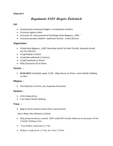 Załącznik 5 Regulamin XXIV Biegów Żnińskich Cel: Popularyzacja masowych biegów w środowisku żnińskim. Promocja regionu Pałuk Uczczenie 25 –lecia powstania Żnińskiego Klubu Biegacza ,,1992 ‘’ Uczczenie pamięci wielkich i wybitnych Żninian - Erazm Gliczner Organizator : Żniński Klub Biegacza ,,1992’’(Stanisław Goclik Tel: 664-716-642, Wojciech Goclik tel:732-700-671) Urząd Miejski w Żninie Urząd Marszałkowski w Toruniu Urząd Powiatowy w Żninie M/G Zrzeszenie LZS w Żninie Termin : 02.04.2017r (niedziela) godz. 12.00 – Bieg uliczny na 10 km , marsz Nordic Walking na 5km Miejsce : Plac Wolności w Żninie, woj. Kujawsko Pomorskie Dystans : 10 km bieg uliczny 5 km Marsz Nordic Walking Trasa : Bieg na 10 km ulicami miasta Żnina i poza Żninem Start i Meta: Plac Wolności w Żninie Bieg przeprowadzony zostanie (80% asfalt/20% kostka brukowa) na dystansie 10 km i Nordic Walking 5 km. Trasa będzie oznaczona co 1 km Punkty z wodą na ok. 2,5 km, ok. 5 km i 7,6 km Pomiar czasu w biegu 10km oraz Marszu Nordic Walking 5km: Pomiar czasu dokonywany będzie elektronicznie, za pomocą chipów. Chip należy umieścić w sznurowadłach buta bądź na wysokości kostki. Brak chipa podczas biegu skutkować będzie dyskwalifikacją. Po biegu należy wydany chip zwrócić do stanowiska firmy obsługującej pomiar czasu. Brak zwrotu chipa spowoduje brak ujęcia w komunikacie końcowym oraz dyskwalifikację. Uczestnictwo i Zgłoszenia : Warunkiem uczestnictwa jest weryfikacja w biurze zawodów oraz podpisanie oświadczenia o starcie na własną odpowiedzialność. W przypadku osób niepełnoletnich wymagana będzie pisemna zgoda opiekuna prawnego. Osoby w wieku do 18 lat (które w dniu biegu tj. 2 kwietnia 2017 nie osiągnęły jeszcze pełnoletniości ) zobowiązane są do posiadania pozwolenia na udział od rodziców lub prawnych opiekunów, z ich podpisem i nr PESEL lub nr dowodu osobistego. Sekretariat czynny od 8.00 – 11.45 w Liceum Ogólnokształcącym im. Braci Śniadeckich w Żninie ul. Sienkiewicza 1. W ramach opłaty dla zawodników w biegu na 10 km i nordic walking 5 km :pakiet startowy ( nr. Startowy, szatnie-kąpiel w LO Żnin. ul Sienkiewicza 1, ciepły posiłek , napoje, opieka medyczna, medal okolicznościowy z cyklu Wielcy Żninianie i pamiątki ze Żnina oraz upominek niespodzianka. Ustalony został limit 500 uczestników( bieg na 10 km i Nordic Walking 5km ) Klasyfikacja i Kategorie: bieg na 10 km Klasyfikacja Open kobiet i mężczyzn w biegu głównym na 10 km Kategorie wiekowe kobiet: K do-29 lat K 30-49 lat K pow. 50 lat Kategorie mężczyzn: M do-19 lat M 20-29 lat M 30-39 lat M 40- 49 lat M 50- 59 lat M 60-69 lat M pow. 70 lat Klasyfikacja i Kategorie: Nordic Walking 5 km Klasyfikacja Open kobiet i mężczyzn w Nordic Walking 5 km Nagrody i wyróżnienia: Klasyfikacja biegu na 10 km i Nordic Walking 5 km Open kobiet i mężczyzn IIII miejsce puchar i nagroda finansowa. W kategoriach wiekowych biegu na 10 km kobiet i mężczyzn puchar i upominek Na mecie dla każdego zawodnika w biegu na 10 km i nordic walking pamiątkowy medal z cyklu Wielcy Żninianie +pamiątki z Pałuk+ upominek niespodzianka. Organizator przewiduje losowanie ciekawych nagród wśród zawodników ,którzy ukończą bieg na 10 km i nordic walking na 5 km. Jeżeli zawodnik nie zgłosi się z numerem startowym na scenę ,nagroda losowana jest kolejny raz ,aż do skutku. Postanowienia końcowe: Bieg na 10 km i Nordic Walking na 5 km rozegrany będzie bez względu na warunki pogodowe zgodnie z przepisami PZLA Interpretacja regulaminu należy do organizatora Biegi Towarzyszące: Biegi Szkolne ( godz. 11.00 park miejski w Żninie przy szkole LO Żnin ul Sienkiewicza 1 ). Zapisy na Biegi Szkolne odbywają się przed zawodami od godz. 10.15-11.00 . (obowiązuje zgoda rodzica lub opiekuna prawnego) Zgłoszenia- zapisy(dotyczy Biegu na 10 km i nordic walking 5km ) Na stronie internetowej www.maratonypolskie.pl W sekretariacie zawodów w dniu startu od 8.00 do 11.45 Ustalony został limit 500 uczestników zawodów(bieg na 10 km i Nordic Walking 5 km) Wpisowe dla uczestników biegu na 10 km i nordic walking 5 km : - do 27.03.2017 (poniedziałek) wynosi 40 zł na konto Żnińskiego Klubu Biegacza ,,1992’’ - po terminie 27.03.2017 i w dniu biegu opłata wynosi 50 zł płatne w biurze zawodów Opłata startowa nie podlega zwrotowi . Dane do przelewu: Żniński Klub Biegacza,,1992’’ Bank Spółdzielczy ,,Pałuki’’ w Żninie Nr rach: 54818100000004033820000001 W tytule przelewu prosimy wpisać imię i nazwisko zawodnika oraz miejscowość