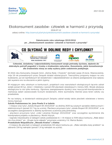 2017.03.02 Ekokonsument zasobów- człowiek w harmonii z przyrodą 2016.07.12 zobacz online: http://szemud.pl/artykuly/ekokonsument-zasobow-czlowiek-w-harmonii-z-przyroda/ Zakończenie roku szkolnego 2015/2016 pn. „Ekokonsument zasobów- człowiek w harmonii z przyrodą” Człowiek, świadomy i odpowiedzialny konsument swoje potrzeby życiowe, dążenie do dobrobytu potrafi pogodzić z troską o środowisko naturalne. Rozumienie, jakie konsekwencje dla środowiska niosą za sobą wybory jakie codziennie podejmuje. W 2016 roku Komunalny Związek Gmin „Dolina Redy i Chylonki” obchodzi swoje 25-lecie. Równocześnie, mija 18 rok prowadzonych przez Związek działań edukacyjnych. Tworzyliśmy programy mające na celu budowanie, już od najmłodszych lat świadomości i odpowiedzialności za własne postępowanie oraz wpływu jaki wywiera ono na otoczenie w jakim żyjemy. W mijającym roku szkolnym w konkursach, projektach oraz warsztatach ekologicznych łącznie udział wzięło ponad 40 tys. dzieci i młodzieży z ponad 250 placówek oświatowych z terenu KZG. Wszak edukacja ekologiczna to nie tylko konkursy. Ogromne zaangażowanie dyrekcji oraz nauczycieli-koordynatorów w realizację zadań zaowocowało licznymi działaniami, które wychodziły również poza teren szkoły czy przedszkola. Po raz kolejny, w działaniach edukacyjnych Związku udział wzięły także placówki oświatowe z terenu Gminy Szemud: Szkoła Podstawowa im. Jana Pawła II w Łebnie – I miejsce oraz tytuł „Szkoła Ekspert EE 2015/2016” za zbiórkę 2635 kg zużytych sprzętów elektrycznych i elektronicznych (ponad 22,7 kg na ucznia). Placówce przyznano tytuł „szkoła Ekspert EE 2015/2016”, a za szczególne zaangażowanie w zbiórkę wyróżniono uczennicę Julię Jankowską; – placówce przyznano tytuł „Lider Lokalnej Ekologii 2015/2016” oraz szczególne wyróżnienie dla koordynatora projektu w placówce p. Moniki Hrycyk; – nagroda indywidualna w kategorii szkoły podstawowe kl. I- III miejsce w XVIII edycji konkursu „Małe dzieci nie chcą śmieci” pn. „Drugie życie odpadu” przyznano uczennicy I kl. Marice Bużan; Przedszkole Niepubliczne „Wesoła Kraina” z Kielna – II miejsce dla placówki w kategorii przedszkola XIII edycji konkursu pn. „Mała nakrętka duży problem” za zebranie 334 kg nakrętek (ponad 7,4 kg nakrętek na ucznia). www.szemud.pl | 1 2017.03.02 Koordynatorem konkursu była p. Magda Stuba; Zespół Szkolno- Przedszkolny w Koleczkowie – placówce przyznano tytuł „Szkoła Ekspert EE 2015/2016” za zbiórkę 274 kg zużytych sprzętów elektrycznych i elektronicznych (ponad 2,3 kg na ucznia). Koordynatorem konkursu była p. Małgorzata Dempc. Szkoła Podstawowa w Częstkowie – placówce przyznano tytuł „Lider Lokalnej Ekologii 2015/2016”. Koordynatorem projektu była p. Katarzyna Laskowska. W trakcie uroczystego zakończenia roku edukacyjnego które odbyło się 15 czerwca br. w Pomorskim Parku Naukowo- Technologicznym w Gdyni, po raz drugi przyznano także nagrodę „Róża Ekologii”. W tym roku, to szczególne wyróżnienie przyznano Przedszkolu nr 11 „Pod Kasztanami” z Gdyni oraz Szkole Podstawowej nr 2 z Redy. Indywidualnym i grupowym laureatom konkursów zostały także wręczone dyplomy oraz nagrody. Prócz laureatów, nauczycieli i uczniów, w sali konferencyjnej PPNT w Gdyni obecni będą także przedstawiciele władz samorządowych oraz spółek współpracujących ze Związkiem w zakresie edukacji ekologicznej. Nagrody dla laureatów współfinansowane są przez spółki OPEC Sp. z o.o., Eko Dolina Sp. z o.o. oraz PEWIK GDYNIA Sp. z o.o. Związek kieruje również informację ekologiczną do dorosłych. Audycje radiowe i artykuły prasowe mają na celu dotarcie do jak największej liczby mieszkańców wszystkich grup wiekowych tak, aby uczulić ich na zagrożenia, jakie dla środowiska naturalnego niesie nieprawidłowe postępowanie z odpadami czy nieograniczona konsumpcja. Ekokonsument to bardzo nowoczesny człowiek- wszak dbanie o stan środowiska naturalnego jest teraz w modzie. Wszystkim laureatom serdecznie gratulujemy i życzymy udanych wakacji. Do zobaczenia w przyszłym roku szkolnym! KONTAKT Komunalny Związek Gmin „Dolina Redy i Chylonki” ul. Konwaliowa 1, 81-651 Gdynia.www.kzg.pl gospodarka odpadami: 58 624 66 11, [email protected] edukacja ekologiczna: 58 6247515, [email protected] www.szemud.pl | 2