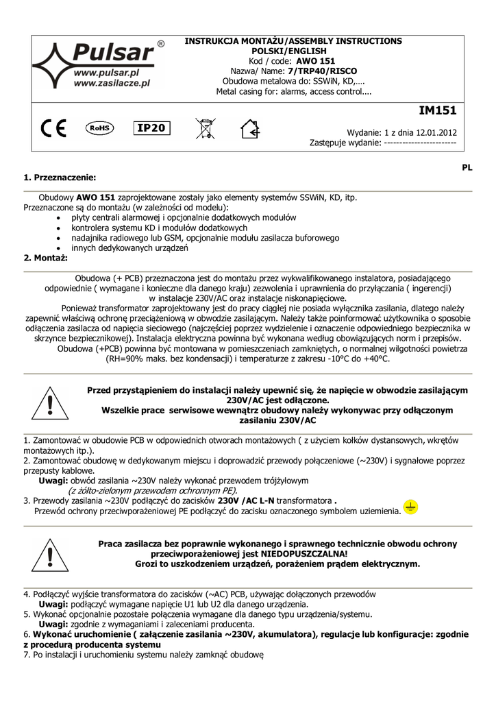 INSTRUKCJA MONTAŻU/ASSEMBLY INSTRUCTIONS POLSKI/ENGLISH Kod / code: AWO 151 Nazwa/ Name: 7/TRP40/RISCO Obudowa metalowa do: SSWiN, KD,…. Metal casing for: alarms, access control.... IM151 Wydanie: 1 z dnia 12.01.2012 Zastępuje wydanie: -----------------------PL 1. Przeznaczenie: Obudowy AWO 151 zaprojektowane zostały jako elementy systemów SSWiN, KD, itp. Przeznaczone są do montażu (w zależności od modelu): • płyty centrali alarmowej i opcjonalnie dodatkowych modułów • kontrolera systemu KD i modułów dodatkowych • nadajnika radiowego lub GSM, opcjonalnie modułu zasilacza buforowego • innych dedykowanych urządzeń 2. Montaż: Obudowa (+ PCB) przeznaczona jest do montażu przez wykwalifikowanego instalatora, posiadającego odpowiednie ( wymagane i konieczne dla danego kraju) zezwolenia i uprawnienia do przyłączania ( ingerencji) w instalacje 230V/AC oraz instalacje niskonapięciowe. Ponieważ transformator zaprojektowany jest do pracy ciągłej nie posiada wyłącznika zasilania, dlatego należy zapewnić właściwą ochronę przeciążeniową w obwodzie zasilającym. Należy także poinformować użytkownika o sposobie odłączenia zasilacza od napięcia sieciowego (najczęściej poprzez wydzielenie i oznaczenie odpowiedniego bezpiecznika w skrzynce bezpiecznikowej). Instalacja elektryczna powinna być wykonana według obowiązujących norm i przepisów. Obudowa (+PCB) powinna być montowana w pomieszczeniach zamkniętych, o normalnej wilgotności powietrza (RH=90% maks. bez kondensacji) i temperaturze z zakresu -10°C do +40°C. Przed przystąpieniem do instalacji należy upewnić się, że napięcie w obwodzie zasilającym 230V/AC jest odłączone. Wszelkie prace serwisowe wewnątrz obudowy należy wykonywac przy odłączonym zasilaniu 230V/AC 1. Zamontować w obudowie PCB w odpowiednich otworach montażowych ( z użyciem kołków dystansowych, wkrętów montażowych itp.). 2. Zamontować obudowę w dedykowanym miejscu i doprowadzić przewody połączeniowe (~230V) i sygnałowe poprzez przepusty kablowe. Uwagi: obwód zasilania ~230V należy wykonać przewodem trójżyłowym (z żółto-zielonym przewodem ochronnym PE). 3. Przewody zasilania ~230V podłączyć do zacisków 230V /AC L-N transformatora . Przewód ochrony przeciwporażeniowej PE podłączyć do zacisku oznaczonego symbolem uziemienia. Praca zasilacza bez poprawnie wykonanego i sprawnego technicznie obwodu ochrony przeciwporażeniowej jest NIEDOPUSZCZALNA! Grozi to uszkodzeniem urządzeń, porażeniem prądem elektrycznym. 4. Podłączyć wyjście transformatora do zacisków (~AC) PCB, używając dołączonych przewodów Uwagi: podłączyć wymagane napięcie U1 lub U2 dla danego urządzenia. 5. Wykonać opcjonalnie pozostałe połączenia wymagane dla danego typu urządzenia/systemu. Uwagi: zgodnie z wymaganiami i zaleceniami producenta. 6. Wykonać uruchomienie ( załączenie zasilania ~230V, akumulatora), regulacje lub konfiguracje: zgodnie z procedurą producenta systemu 7. Po instalacji i uruchomieniu systemu należy zamknąć obudowę 1. Destination: EN The AWO 151 metal casings are designed as components (supplying) in intruders alarms, access control systems, security systems etc. There are intended for installation: • control panel optional with supplementary modules • access control controllers with optional modules • radio or GSM transmitter with optional module PS • other dedicated devices, components etc. 2. Installation: The metal casing (+PCB) must be installed by a qualified installer, holding the relevant certificates, required and necessary in the particular country for connecting (interfering with) the 230 V AC systems and low-voltage installations. Because the transformer is designed for the continuous operation and is not equipped with ON/OFF switch, the power supply line should have the appropriate overload protection. The user should be informed how to disconnect the unit from the mains (the most often by separate and mark the adequate fuse in the fuse box). The power supply installation should be conform to the applicable standards and law. The casing (+PCB) should be installed indoors, where the air humidity is normal (RH=90% max. without condensation) and temperature in the range of -10°C to +40°C. Caution! Prior to entering for installation it is necessary to make sure if the voltage in the 230 V/AC circuit is disconnected. All service works inside the housing must be carried out with 230V/AC supply voltage disconnected. 1. Mount the PCB (control panel, etc) with dedicated holes (use distance pins, bracket screw). 2. Install metal casing in dedicated place and bring in the connecting (~230V) and signal conductors through cables bushings. Remarks: supply circuit ~230V should be carried out with three-core cable (with yellow-green protective PE conductor). 3. Supply conductors ~230V should be connected to 230V / AC L-N terminals of the transformers. Protective conductor should be connected to the terminal marked with grounding symbol. Caution! Operating the power supply without properly made and technically operational electric shock protection circuit is IMPERMISSIBLE! This creates hazard of equipment damage and risk of electric shock. 4. Connect the output of transformer to the terminals (~AC) on the PCB, using installed cables Remarks: connect required voltage U1 or U2 (secondary voltage) for the correct device. 5. If necessary, make other connections required for the correct type of system / device. Remarks: consistent with requirements and recommendation of the producer. 6. Start the system (switch on ~230V, battery), adjust or configure: according to procedure of the producer’s system. 7. After installing and checking the proper operation of the system, close the casing. 2 3. Parametry techniczne / Technical data: PL/EN PARAMETRY TECHNICZNE TECHNICAL DATA Napięcie zasilania 230V/AC, 50Hz (-/+15%) Power supply voltage Transformator Norma transformatora Mi