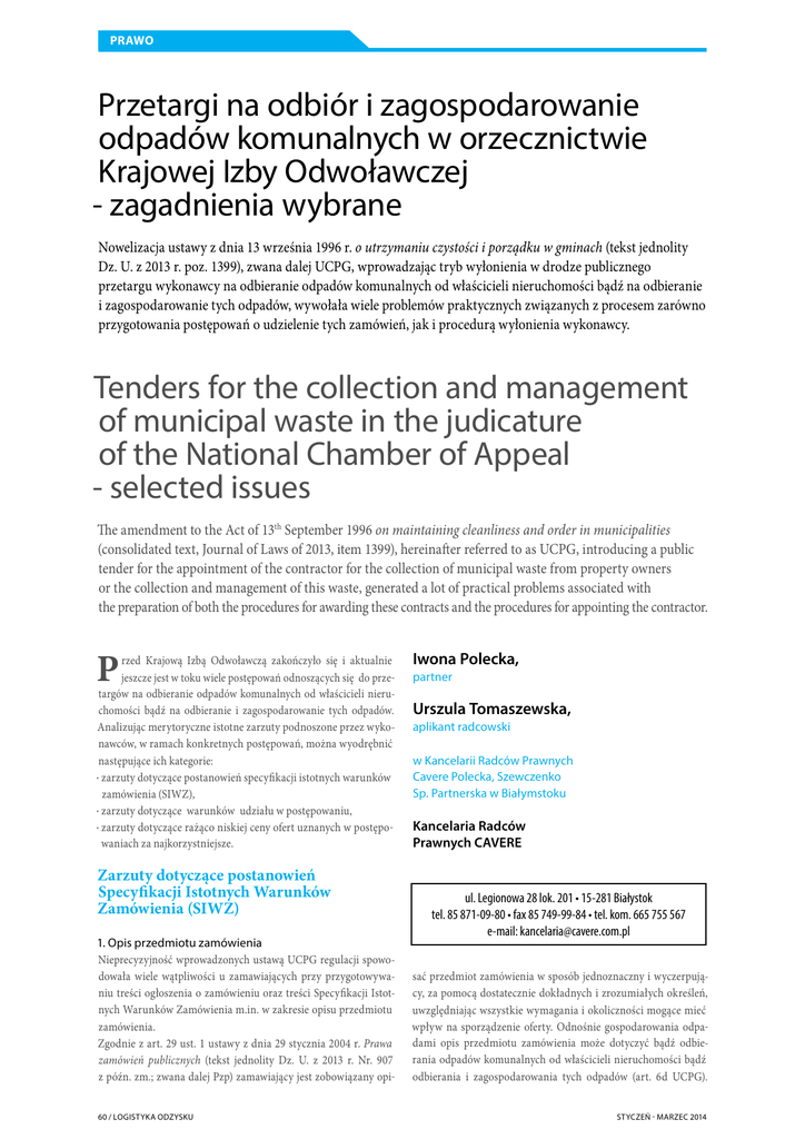 PRAWO Przetargi na odbiór i zagospodarowanie odpadów komunalnych w orzecznictwie Krajowej Izby Odwoławczej - zagadnienia wybrane Nowelizacja ustawy z dnia 13 września 1996 r. o utrzymaniu czystości i porządku w gminach (tekst jednolity Dz. U. z 2013 r. poz. 1399), zwana dalej UCPG, wprowadzając tryb wyłonienia w drodze publicznego przetargu wykonawcy na odbieranie odpadów komunalnych od właścicieli nieruchomości bądź na odbieranie i zagospodarowanie tych odpadów, wywołała wiele problemów praktycznych związanych z procesem zarówno przygotowania postępowań o udzielenie tych zamówień, jak i procedurą wyłonienia wykonawcy. Tenders for the collection and management of municipal waste in the judicature of the National Chamber of Appeal - selected issues The amendment to the Act of 13th September 1996 on maintaining cleanliness and order in municipalities (consolidated text, Journal of Laws of 2013, item 1399), hereinafter referred to as UCPG, introducing a public tender for the appointment of the contractor for the collection of municipal waste from property owners or the collection and management of this waste, generated a lot of practical problems associated with the preparation of both the procedures for awarding these contracts and the procedures for appointing the contractor. P rzed Krajową Izbą Odwoławczą zakończyło się i aktualnie jeszcze jest w toku wiele postępowań odnoszących się do przetargów na odbieranie odpadów komunalnych od właścicieli nieruchomości bądź na odbieranie i zagospodarowanie tych odpadów. Analizując merytoryczne istotne zarzuty podnoszone przez wykonawców, w ramach konkretnych postępowań, można wyodrębnić następujące ich kategorie: · zarzuty dotyczące postanowień specyfikacji istotnych warunków zamówienia (SIWZ), · zarzuty dotyczące warunków udziału w postępowaniu, · zarzuty dotyczące rażąco niskiej ceny ofert uznanych w postępowaniach za najkorzystniejsze. Zarzuty dotyczące postanowień Specyfikacji Istotnych Warunków Zamówienia (SIWZ) 1. Opis przedmiotu zamówienia Nieprecyzyjność wprowadzonych ustawą UCPG regulacji spowodowała wiele wątpliwości u zamawiających przy przygotowywaniu treści ogłoszenia o zamówieniu oraz treści Specyfikacji Istotnych Warunków Zamówienia m.in. w zakresie opisu przedmiotu zamówienia. Zgodnie z art. 29 ust. 1 ustawy z dnia 29 stycznia 2004 r. Prawa zamówień publicznych (tekst jednolity Dz. U. z 2013 r. Nr. 907 z późn. zm.; zwana dalej Pzp) zamawiający jest zobowiązany opi60 / Logistyka Odzysku Iwona Polecka, partner Urszula Tomaszewska, aplikant radcowski w Kancelarii Radców Prawnych Cavere Polecka, Szewczenko Sp. Partnerska w Białymstoku Kancelaria Radców Prawnych CAVERE ul. Legionowa 28 lok. 201 • 15-281 Białystok tel. 85 871-09-80 • fax 85 749-99-84 • tel. kom. 665 755 567 e-mail: [email protected] sać przedmiot zamówienia w sposób jednoznaczny i wyczerpujący, za pomocą dostatecznie dokładnych i zrozumiałych określeń, uwzględniając wszystkie wymagania i okoliczności mogące mieć wpływ na sporządzenie oferty. Odnośnie gospodarowania odpadami opis przedmiotu zamówienia może dotyczyć bądź odbierania odpadów komunalnych od właścicieli nieruchomości bądź odbierania i zagospodarowania tych odpadów (art. 6d UCPG). STYCZEŃ - MARZEC 2014 PRAWO Jako przykład opisu przedmiotu zamówienia sformułowanego w sposób jasny i zrozumiały Krajowa Izba Odwoławcza, dalej KIO, uznała następujący zapis SIWZ: „Przedmiotem zamówienia jest odbieranie i zagospodarowanie odpadów (odzysk lub unieszkodliwienie) wskazanych w opisie odpadów komunalnych z nieruchomości położonych na terenie Miasta i Gminy (…), na których zamieszkują mieszkańcy, w sposób zapewniający osiągnięcie odpowiednich poziomów recyklingu, przygotowania do ponownego użycia i odzysku innymi metodami oraz ograniczenie masy odpadów komunalnych ulegających biodegradacji przekazanych do składowania zgodnie z zapisami ustawy (…).” (wyrok z dnia 29 listopada 2012 r., sygn. akt KIO 2544/12 Miasto i Gmina Serock). Izba w jednej ze spraw (wyrok z dnia 29 maja 2013 r., sygn. akt KIO 1106/13 – Gmina Stalowa Wola) zajęła stanowisko, iż wybór wariantu przetargu, tj. czy będzie to przetarg na odbieranie odpadów komunalnych, czy też przetarg na odbieranie i zagospodarowanie tych odpadów jest istotny z punktu widzenia zakresu realizowanego zamówienia. W przypadku, gdy umowa zawierana jest z wykonawcą na odbieranie i zagospodarowanie odpadów komunalnych może ona szczegółowo określać dalsze sposoby postępowania z odebranymi odpadami. Ma to znaczenie zwłaszcza w kontekście osiągania poziomu recyklingu i przygotowania do ponownego użycia niektórych frakcji odpadów komunalnych oraz ograniczenia masy odpadów komunalnych ulegających biodegradacji, przekazywanych do składowania, jak również tego, że to wykonawca wyłoniony w drodze przetargu sam decyduje, do której instalacji przekaże odpady. Odmiennie jest natomiast w przypadku wykonawcy wyłonionego w wyniku przetargu na odbieranie odpadów komunalnych od właścicieli nieruchomości, bowiem zobowiązany jest on przekazywać odebrane od właścicieli nieruchomości odpady do instalacji wskazanych przez zamawiającego w treści SIWZ. Na gruncie jednej ze spraw (wyrok z dnia 29 maja 2013 r., sygn. akt KIO 1106/13 – Gmina Stalowa Wola) zamawiający zawarł w SIWZ następujący opis przedmiotu zamówienia: „Przedmiotem zamówienia jest odbiór od właścicieli nieruchomości położonych na terenie Gminy Stalowa Wola odpadów komunalnych i zagospodarowanie tych odpadów. (…) Od dnia zawarcia umowy do przewidywanej daty uruchomienia ZAKŁADU MECHANICZNO-BIOLOGICZNEGO PRZETWARZANIA ODPADÓW KOMUNALNYCH W... - tj. 31.10.2014 r. Wykonawca realizował będzie zamówienie na odbiór i zagospodarowanie odpadów. Od dnia wejścia w życie uchwały Sejmiku Województwa Podkarpackie