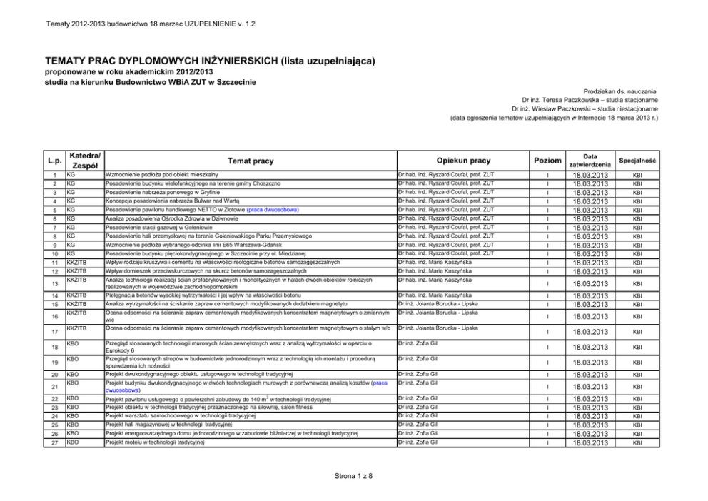 Tematy dyplomów 2012-2013 budownictwo 18 marzec