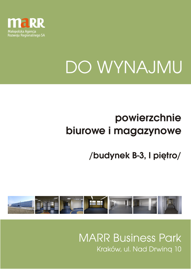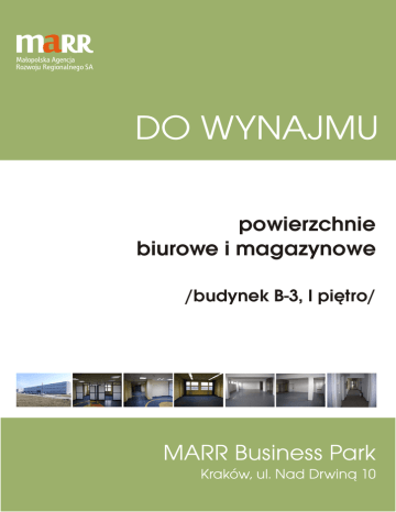 powierzchnie biurowe i magazynowe /budynek B-3, I piêtro/ www.marr.pl MARR Business Park Katowice, 80 km Berlin, 600 km A4 Lublin, 270 km Business Park Kraków, ul. Nad Drwin¹ 10 Kielce, 110 km Warszawa, 300 km A4 A4 W po³udniowo-wschodniej czêœci Krakowa; Rzeszów, 160 km Lwów, 300 km Kraków Nowa Huta W centrum przemys³owym i logistyczno-magazynowym miasta; Wis³a Centrum Krakowa isto Botewa ul. Chr (D ga Drwina D ³u Wêze³ Rybitwy ul. T.Œliwia ka rwieñ ) ul. Nad Drwin¹ 474/2 474/3 ul. Domaga³y 474/4 ³³a n k i W obrêbie funkcjonuj¹cego obszaru dzia³alnoœci produkcyjnej i magazynowej - strefie aktywnoœci gospodarczej - o ³¹cznej powierzchni 22,5 ha, bêd¹cego w³asnoœci¹ MARR S.A. – dzia³alnoœæ prowadzi tu 40 firm, które zatrudniaj¹ ok. 600 osób. u l. Pó ³ ³a S7 nk i W s¹siedztwie Urzêdu Celnego; 474/5 MARR Business Park Kraków, ul. Nad Drwin¹ 10 474/6 ul. P ó NAJKORZYSTNIEJSZY DOJAZD: autostrad¹ A4 obwodnic¹ miasta S7 ul. Œliwiaka ul. Pó³³anki lub od strony centrum Krakowa ul Ch.Botewa ul. Pó³³anki KRAKÓW BIE¯ANÓW Bie¿anowska KOKOTÓW ul. S uch a rskie go ul. K o ko to ka ws W odleg³oœci ok. 200 metrów znajduje siê wschodnia obwodnica miasta wraz z wêz³em „Rybitwy” (czêœæ trasy ekspresowej S7); Ul. Wêze³ Bie¿anów Ok. 2,5 km – autostrada A4 i wêze³ „Bie¿anów”; Ok. 28 km – Miêdzynarodowy Port Lotniczy w Krakowie Balicach. Lotnisko Balice Katowice, Warszawa Departament Inwestycji i Zarz¹dzania Nieruchomoœciami tel./ faks: +48 12 653 55 33 E-mail: [email protected]; www.marr.pl A4 Tarnów Rzeszów Niniejszy materia³ zawiera informacje promocyjne i nie stanowi oferty w rozumieniu przepisów Kodeksu Cywilnego; Kraków, 2015 Bratys³awa, 430 km Wiedeñ, 470 km Praga, 530 km www.marr.pl 474/3 474/2 474/4 B-1.2 E-7 Urz¹d Celny B-3 D-2 B-1.1 Powierzchnie biurowe i magazynowe z zapleczem socjalnym, zlokalizowane na I piêtrze budynku B-3. £¹cznie 1 527,5 m2, w tym: - biura z zapleczem socjalnym - 1 232m2.; 2 - powierzchnie magazynowe - 133,5 m ; - powierzchnia socjalna i pomocnicza 2 (z mo¿liwoœci¹ adaptacji na biura) - 162 m . 1 2 3 474/5 4 F-3 F-4;5 B-2 D-8;9 474/6 Mo¿liwoœæ podzia³u powierzchni i wynajmu ich czêœci. Lokalizacja budynku na terenie MARR Business Park przy ul. Nad Drwin¹ Mo¿liwoœæ rezerwacji miejsc parkingowych na wy³¹czne potrzeby najemcy. Opis: budynek ocieplony, pomieszczenia o wysokoœci 2,9 m, pomieszczenia biurowe w czêœci wschodniej budynku w wysokim standardzie (centalna klimatyzacja, sieæ komputerowa, instalacja ppo¿.), powierzchnie magazynowe wydzielone ruchom¹ siatk¹, istnieje mo¿liwoœæ adaptacji. Media: energia 230/400 z indywidualnym pomiarem i rozprowadzeniem, instalacja wodoci¹gowa z indywidualnym pomiarem, kanalizacja sanitarna, linie telefoniczne - mo¿liwoœæ zakupu od TP S.A., indywidualne ogrzewanie elektryczne, w czêœci biurowej sieæ komputerowa. Dostêpnoœæ: Dwie klatki schodowe, winda towarowa 3,2 Mg - dostêp prze³¹czk¹ z korytarza piêtra, plac manewrowy, miejsca parkingowe. 1 2 3 5 4 6 7 89 10 11 12 13 14 15 16 17 18 19 20 21 22 23 24 A B C Powierzchnia do wynajêcia Departament Inwestycji i Zarz¹dzania Nieruchomoœciami tel./ faks: +48 12 653 55 33 E-mail: [email protected]; www.marr.pl BUDYNEK B-3 I - piêtro Niniejszy materia³ zawiera informacje promocyjne i nie stanowi oferty w rozumieniu przepisów Kodeksu Cywilnego; Kraków, 2015 Ul. Domaga³y Ul. Nad Drwin¹ MARR Business Park Ma³opolska Agencja Rozwoju Regionalnego S.A. marr Departament Inwestycji i Zarz¹dzania Nieruchomoœciami tel./ faks: +48 12 653 55 33 e-mail: [email protected] www.marr.pl Projekt “Kompleksowy rozwój strefy aktywnoœci gospodarczej - MARR Businness Park” wspó³finansowany ze œrodków Unii Europejskiej w ramach Ma³opolskiego Regionalnego Programu Operacyjnego na lata 2007-2013