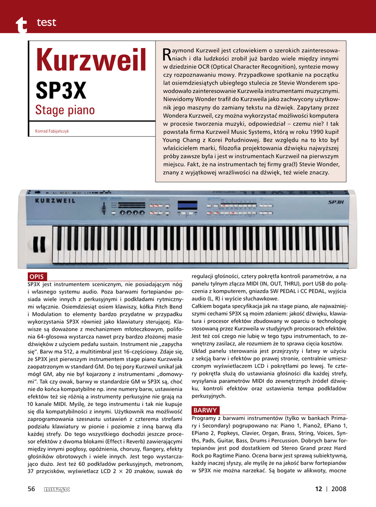 t test Kurzweil SP3X Stage piano Konrad Fabijańczyk R aymond Kurzweil jest człowiekiem o szerokich zainteresowaniach i dla ludzkości zrobił już bardzo wiele między innymi w dziedzinie OCR (Optical Character Recognition), syntezie mowy czy rozpoznawaniu mowy. Przypadkowe spotkanie na początku lat osiemdziesiątych ubiegłego stulecia ze Stevie Wonderem spowodowało zainteresowanie Kurzweila instrumentami muzycznymi. Niewidomy Wonder trafił do Kurzweila jako zachwycony użytkownik jego maszyny do zamiany tekstu na dźwięk. Zapytany przez Wondera Kurzweil, czy można wykorzystać możliwości komputera w procesie tworzenia muzyki, odpowiedział – czemu nie? I tak powstała firma Kurzweil Music Systems, którą w roku 1990 kupił Young Chang z Korei Południowej. Bez względu na to kto był właścicielem marki, filozofia projektowania dźwięku najwyższej próby zawsze była i jest w instrumentach Kurzweil na pierwszym miejscu. Fakt, że na instrumentach tej firmy gra(ł) Stevie Wonder, znany z wyjątkowej wrażliwości na dźwięk, też wiele znaczy. OPIS SP3X jest instrumentem scenicznym, nie posiadającym nóg i własnego systemu audio. Poza barwami fortepianów posiada wiele innych z perkusyjnymi i podkładami rytmicznymi włącznie. Osiemdziesiąt osiem klawiszy, kółka Pitch Bend i Modulation to elementy bardzo przydatne w przypadku wykorzystania SP3X również jako klawiatury sterującej. Klawisze są doważone z mechanizmem młoteczkowym, polifonia 64-głosowa wystarcza nawet przy bardzo złożonej masie dźwięków z użyciem pedału sustain. Instrument nie „zapycha się”. Barw ma 512, a multitimbral jest 16-częściowy. Zdaje się, że SP3X jest pierwszym instrumentem stage piano Kurzweila zaopatrzonym w standard GM. Do tej pory Kurzweil unikał jak mógł GM, aby nie był kojarzony z instrumentami „domowymi”. Tak czy owak, barwy w standardzie GM w SP3X są, choć nie do końca kompatybilne np. inne numery barw, ustawienia efektów też się różnią a instrumenty perkusyjne nie grają na 10 kanale MIDI. Myślę, że tego instrumentu i tak nie kupuje się dla kompatybilności z innymi. Użytkownik ma możliwość zaprogramowania szesnastu ustawień z czterema strefami podziału klawiatury w pionie i poziomie z inną barwą dla każdej strefy. Do tego wszystkiego dochodzi jeszcze procesor efektów z dwoma blokami (Effect i Reverb) zawierającymi między innymi pogłosy, opóźnienia, chorusy, flangery, efekty głośników obrotowych i wiele innych. Jest tego wystarczająco dużo. Jest też 60 podkładów perkusyjnych, metronom, 37 przycisków, wyświetlacz LCD 2 × 20 znaków, suwak do 56 regulacji głośności, cztery pokrętła kontroli parametrów, a na panelu tylnym złącza MIDI (IN, OUT, THRU), port USB do połączenia z komputerem, gniazda SW PEDAL i CC PEDAL, wyjścia audio (L, R) i wyście słuchawkowe. Całkiem bogata specyfikacja jak na stage piano, ale najważniejszymi cechami SP3X są moim zdaniem: jakość dźwięku, klawiatura i procesor efektów zbudowany w oparciu o technologię stosowaną przez Kurzweila w studyjnych procesorach efektów. Jest też coś czego nie lubię w tego typu instrumentach, to zewnętrzny zasilacz, ale rozumiem że to sprawa cięcia kosztów. Układ panelu sterowania jest przejrzysty i łatwy w użyciu z sekcją barw i efektów po prawej stronie, centralnie umieszczonym wyświetlaczem LCD i pokrętłami po lewej. Te cztery pokrętła służą do ustawiania głośności dla każdej strefy, wysyłania parametrów MIDI do zewnętrznych źródeł dźwięku, kontroli efektów oraz ustawienia tempa podkładów perkusyjnych. BARWY Programy z barwami instrumentów (tylko w bankach Primary i Secondary) pogrupowano na: Piano 1, Piano2, EPiano 1, EPiano 2, Popkeys, Clavier, Organ, Brass, String, Voices, Synths, Pads, Guitar, Bass, Drums i Percussion. Dobrych barw fortepianów jest pod dostatkiem od Stereo Grand przez Hard Rock po Ragtime Piano. Ocena barw jest sprawą subiektywną, każdy inaczej słyszy, ale myślę że na jakość barw fortepianów w SP3X nie można narzekać. Są bogate w alikwoty, mocne 12 | 2008 t test i wolne od niechcianych przydźwięków czy innych zniekształceń. To, co napisałem wyżej odnosi się do barw bez efektów. Procesor efektów zainstalowany w SP3X ma korzystny wpływ na wiele barw np. elektryczne piana Rhodes i Wurlitzer – z domieszką różnych efektów brzmią doskonale. Niezmiernie bogato brzmi sekcja orkiestrowych instrumentów strunowych. Czyste próbki gitar akustycznych i elektrycznych brzmią rzetelnie. Jeśli chodzi o barwy syntetyczne są dobre pod warunkiem, że używamy ich do podkładów a nie grania solo. Jak na piano sceniczne SP3X dobrze wyposażono w barwy perkusyjne. Zestawy brzmią bardzo solidnie. W osobnym banku nazwanym Orchestral umieszczono ponadto bogaty zestaw barw instrumentów stosowanych w muzyce klasycznej, zarówno smyczkowych, jak i dętych (drewnianych i blaszanych), a także perkusyjnych. Oferowanych przez SP3X 60 podkładów rytmicznych pogrupowano wg stylów i gatunków muzycznych na: Ballad, Pop, R&B/Dance, Rock/Funky, Country, Latin, Jazz i World. Ta sekcja nie jest rozwinięta na równi z instrumentami typu keyboard, ale do ćwiczenia czy nauki (w połączeniu z metronem) w sam raz. PODSUMOWANIE SP3X waży 22 kilogramy, jest co dźwigać. Pamiętać jednak należy, że to „słodki ciężar”. Dobra klawiatura z mechanizmem młoteczkowym musi swoje ważyć. Na dodatek w ciężarze mieszczą się też – moim zdaniem – doskonale brzmiące barwy fortepianów (byłbym zdziwiony gdyby instrument Kurzweila takich nie posiadał) i pianin elektrycznych, barwy orkiestrowe i wysokiej jakości efekty. Na pokładzie SP3X ma też dobrze brzmiące programy z barwami organów, chociaż na klawiaturze z mechanizmem młoteczkowym trudno grać techniką organową. Testowany instrument spełnia też podstawowe funkcje klawiatury sterującej z nieskomplikowaną, sz